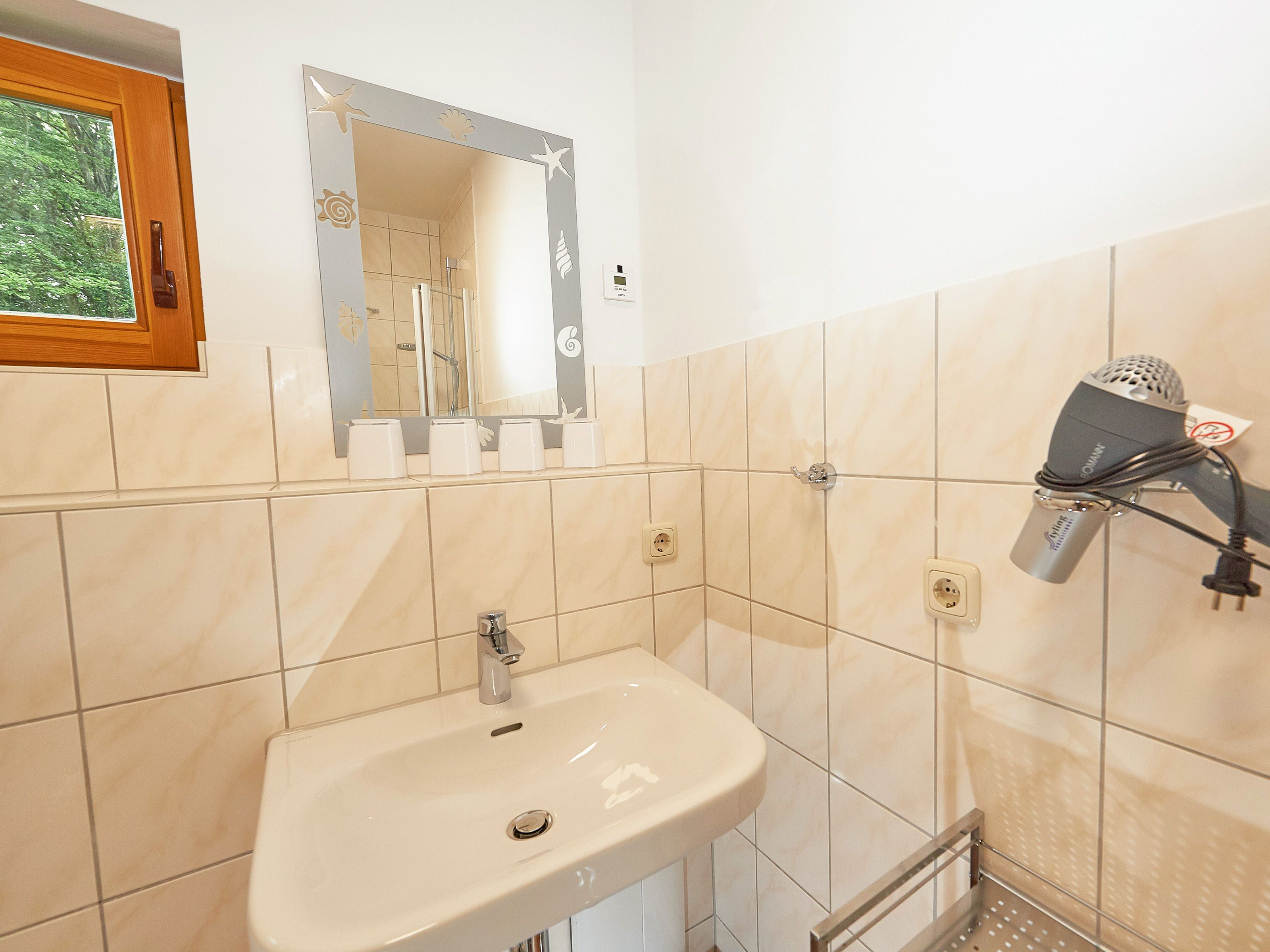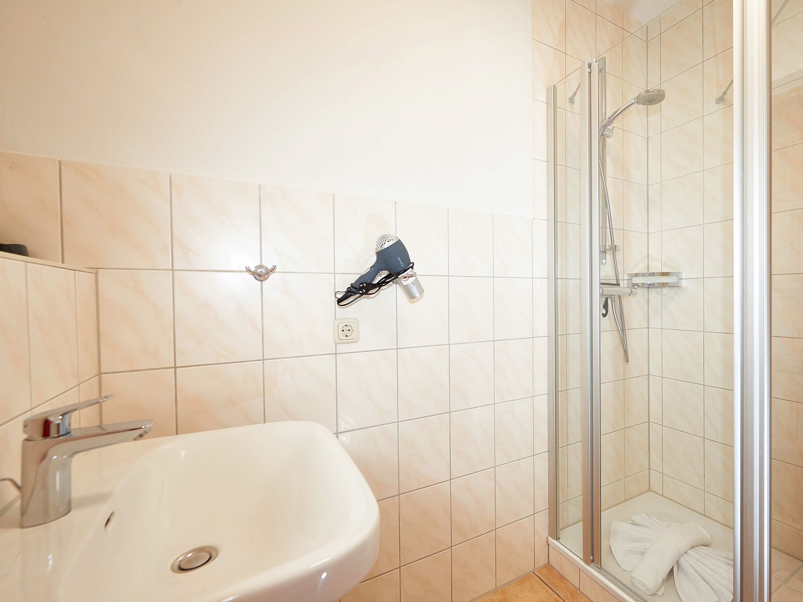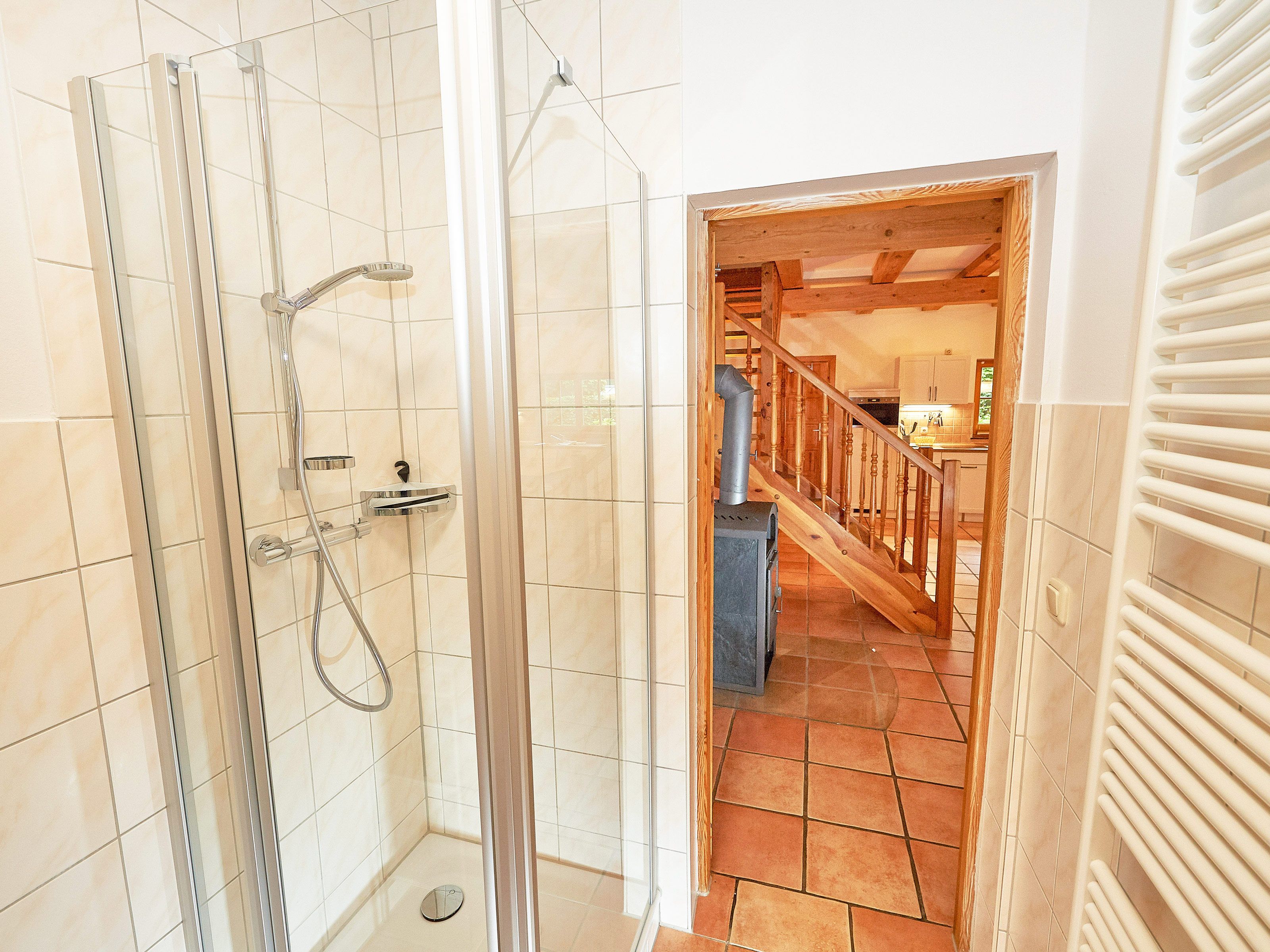 Das Badezimmer befindet sich ebenfalls im Erdgeschoss und bietet Dusche/WC, einen beheizbaren handtuchtrockner sowie einen waschtisch inklusive Fön.
