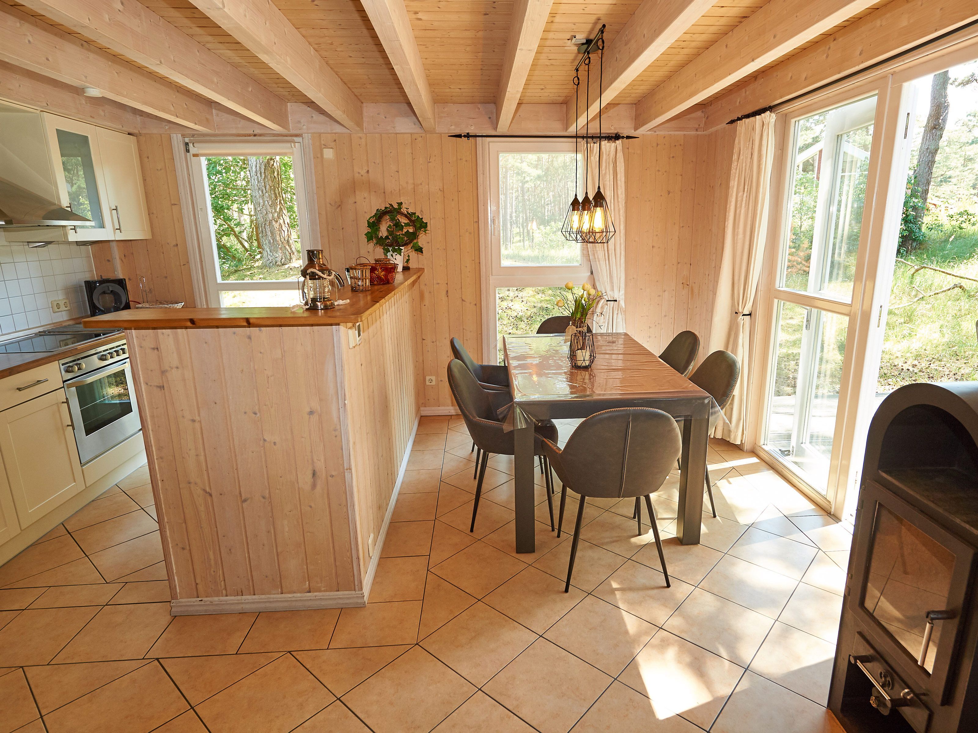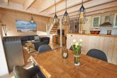 Im Erdgeschoss finden Sie das großzügige Wohn-/Esszimmer mit einem Esstisch für die ganze Familie, einer Sitzecke mit Kaminofen, einem großformatigen Flachbild-TV mit DVD-Player und einer Stereoanlage vor. Eine Elektro-Fußbodenheizung sorgt rund ums Jahr für angenehme Wohlfühl-Temperaturen. Die in den Wohnraum integrierte Küchenzeile sieht nicht nur chic aus, sondern ist perfekt mit einem 4-Platten-Cerankochfeld, einem Backofen, Kühlschrank, Geschirrspülmaschine, Mikrowelle und diversem Kleininventar nahezu perfekt ausgestattet. Auf der vorgelagerten großen Terrasse können Sie relaxen.