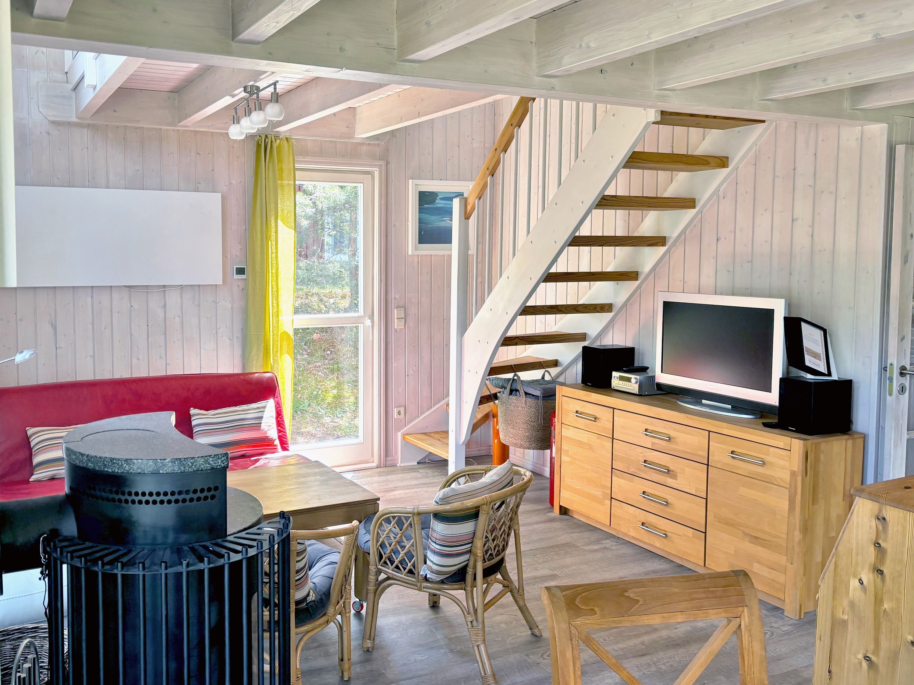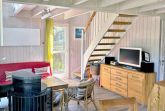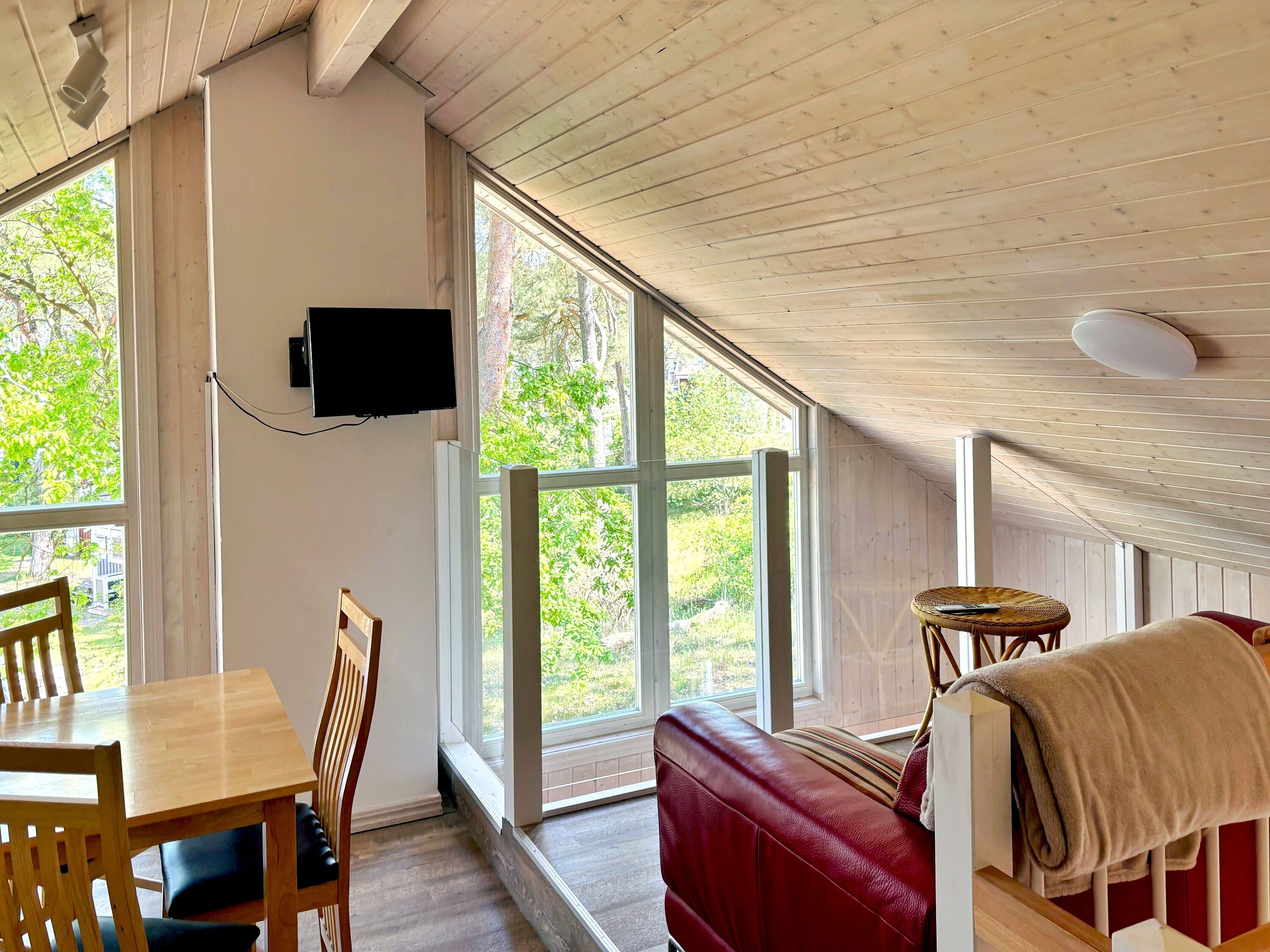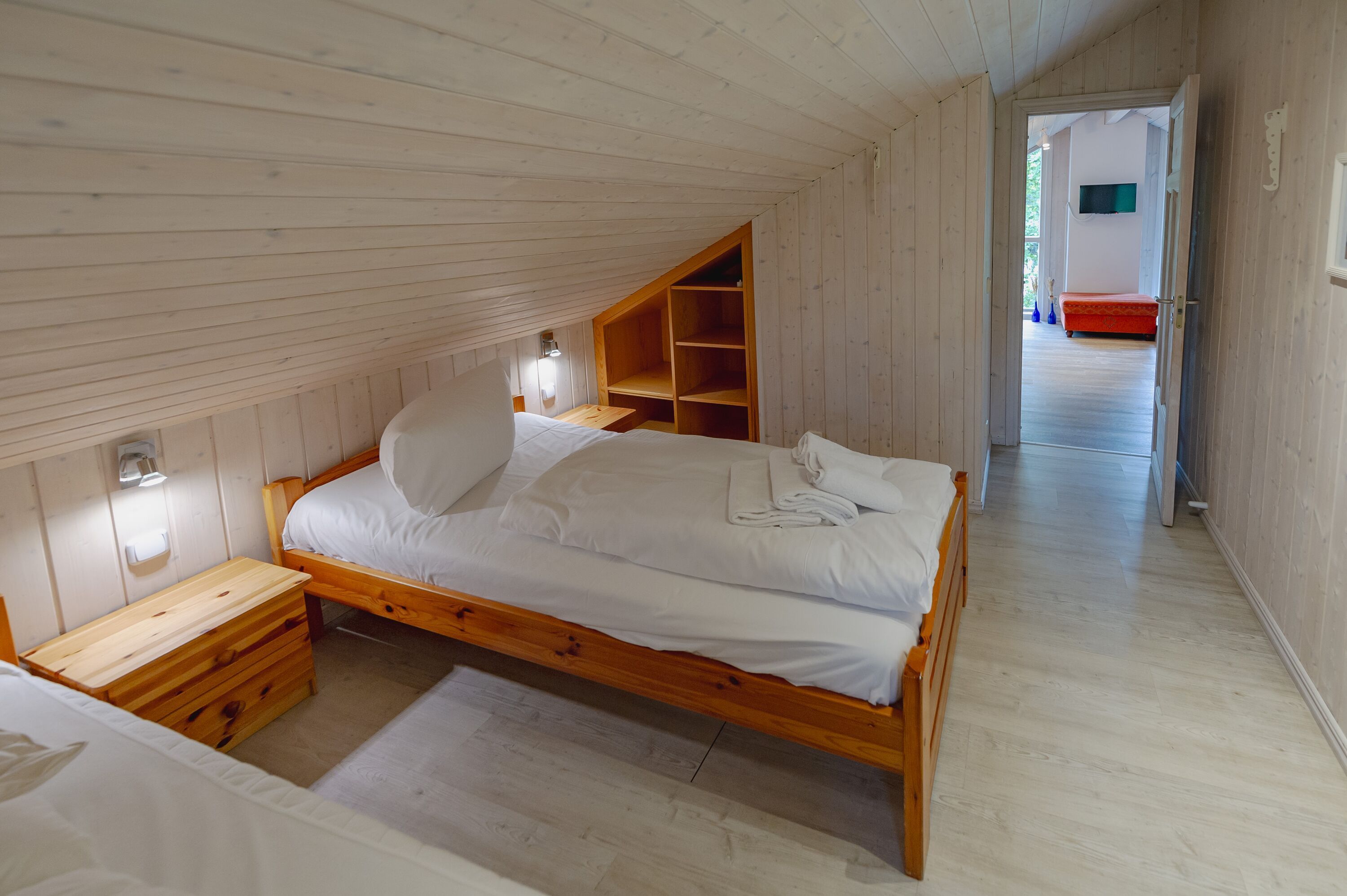 Im Obergeschoss finden Sie unter gemütlichen Dachschrägen zwei Schlafzimmer mit jeweils einem Doppelbett, einen Zugang auf einen überdachten Balkon, ein weiteres kleines Badezimmer mit Dusche/WC sowie eine Relaxecke mit Fernseher. In einem der Schlafzimmer im Obergeschoss befindet sich ein weiterer Fernseher.