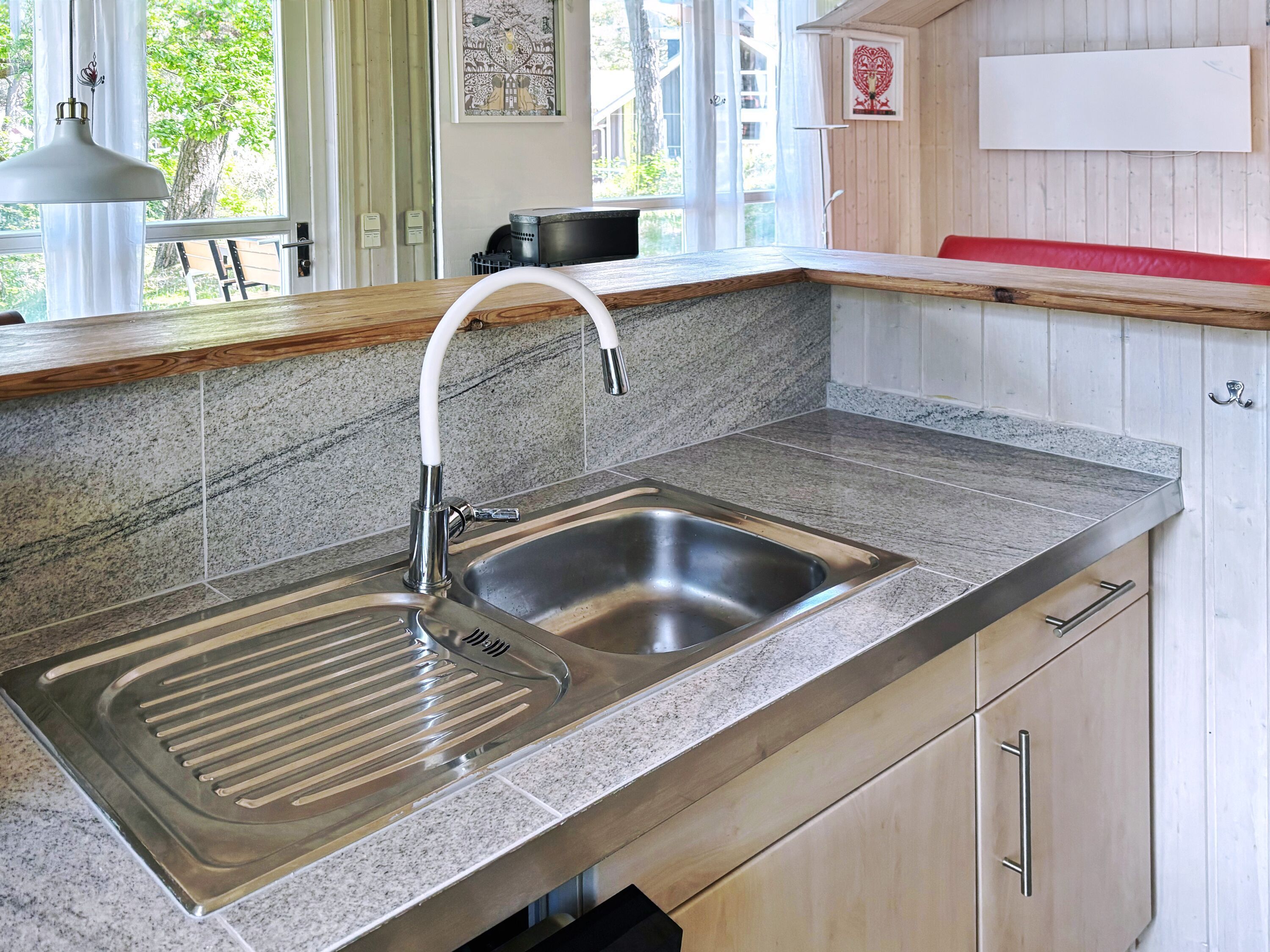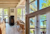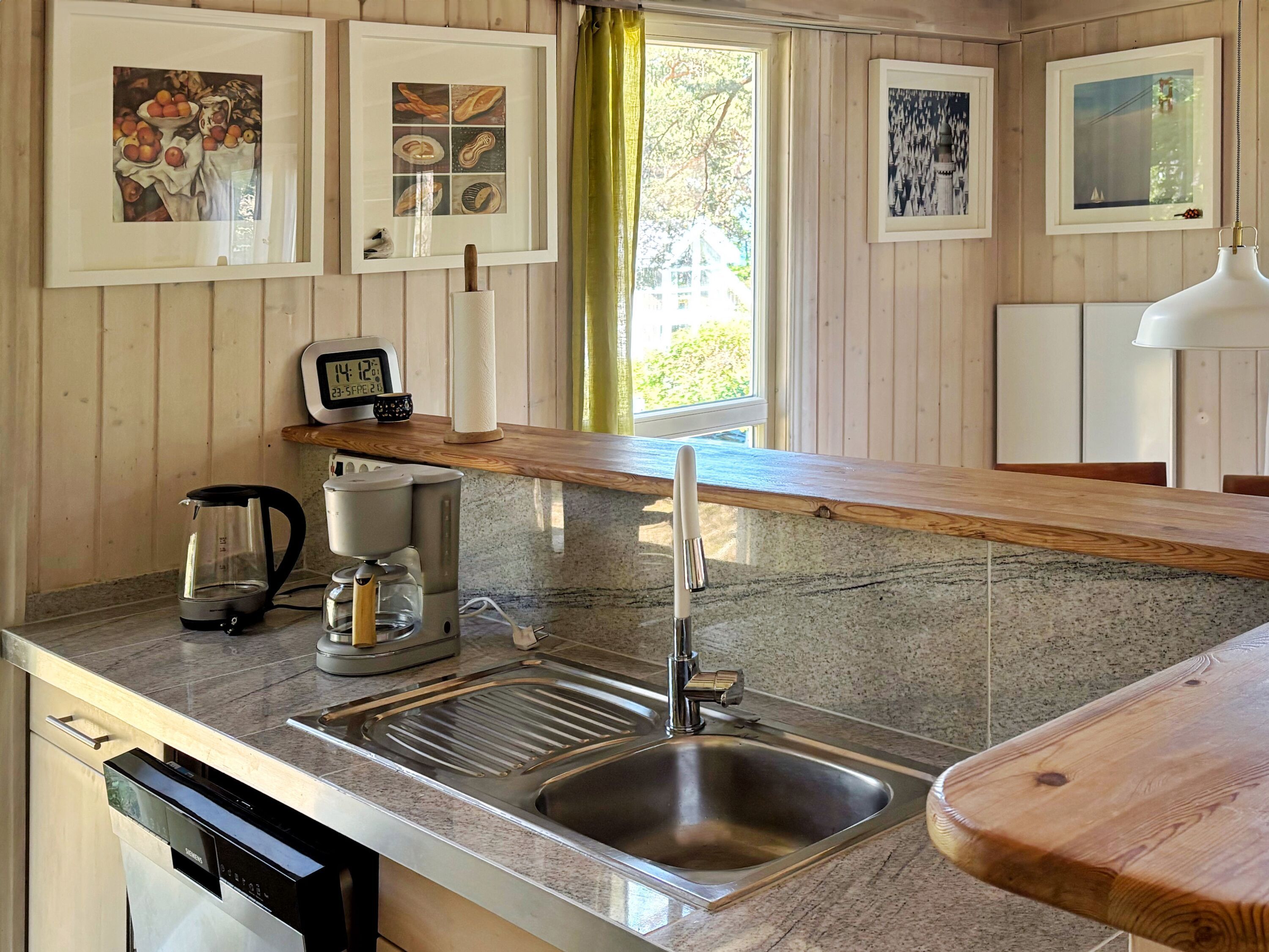 Im Erdgeschoss, das mit einer Elektro-Fußbodenheizung ausgestattet ist, dominiert das geräumige Wohn-/Esszimmer mit einer Couch, dem Kaminofen, einem Flachbild-TV, DVD-Player und einer Stereoanlage. Die in den Wohnraum harmonisch integrierte Küchenzeile ist mit einem 4-Platten-Cerankochfeld, Backofen, Kühlschrank, Geschirrspülmaschine, Mikrowelle sowie Kaffeemaschine, Wasserkocher und Toaster ausgestattet. Selbstverständlich ist auch das nötige Koch- und Essgeschirr vorhanden. Speisen können Sie entweder am großen Esstisch drinnen oder draußen an der frischen Ostseeluft auf Ihrer Terrasse.