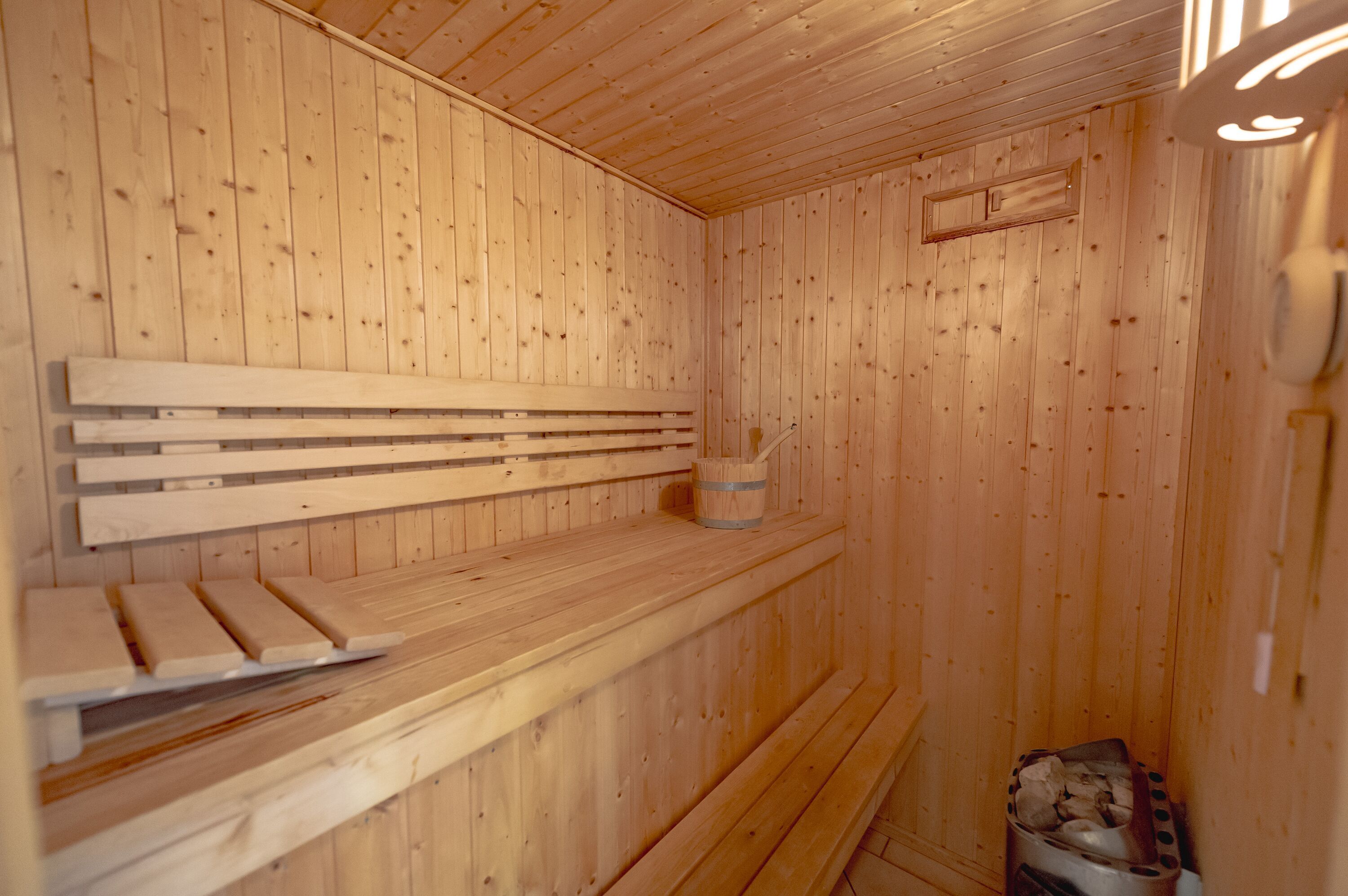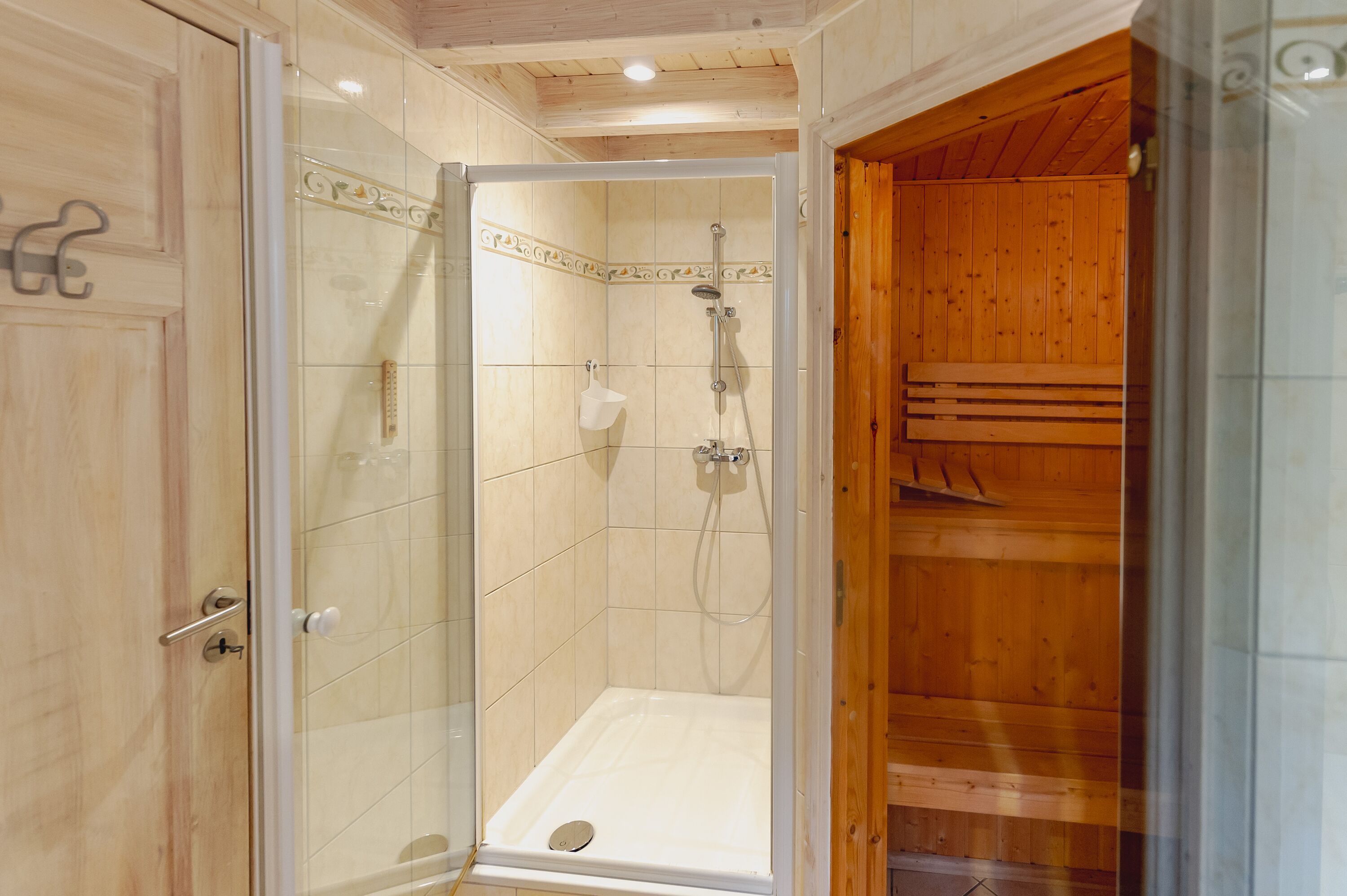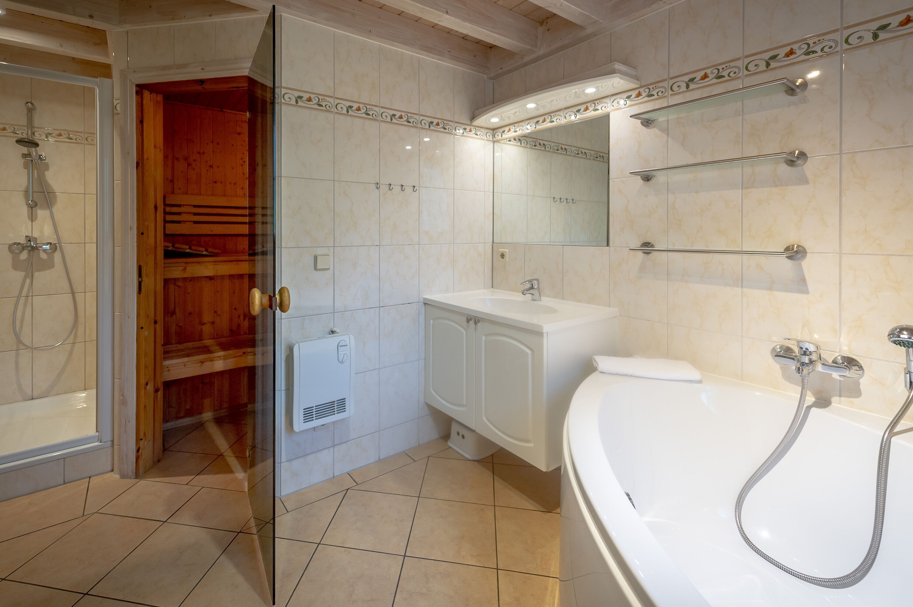 Zusätzlich gibt es im Erdgeschoss das Masterbad mit Dusche/WC, Badewanne, privater Sauna und einer Waschmaschine sowie eines Ihrer insgesamt drei Schlafzimmer, ausgestattet mit einem Einzelbett.