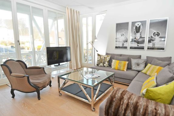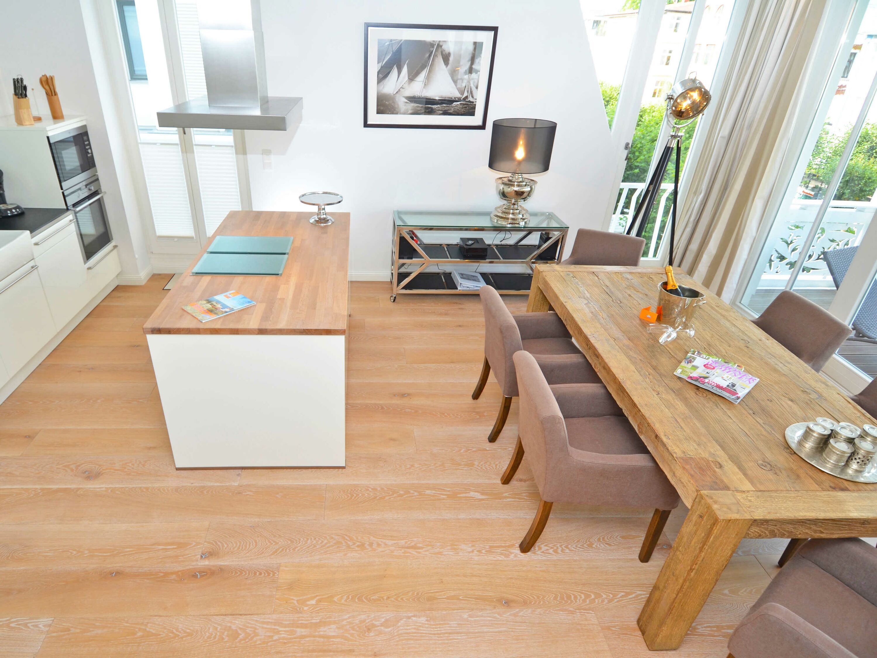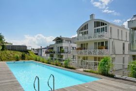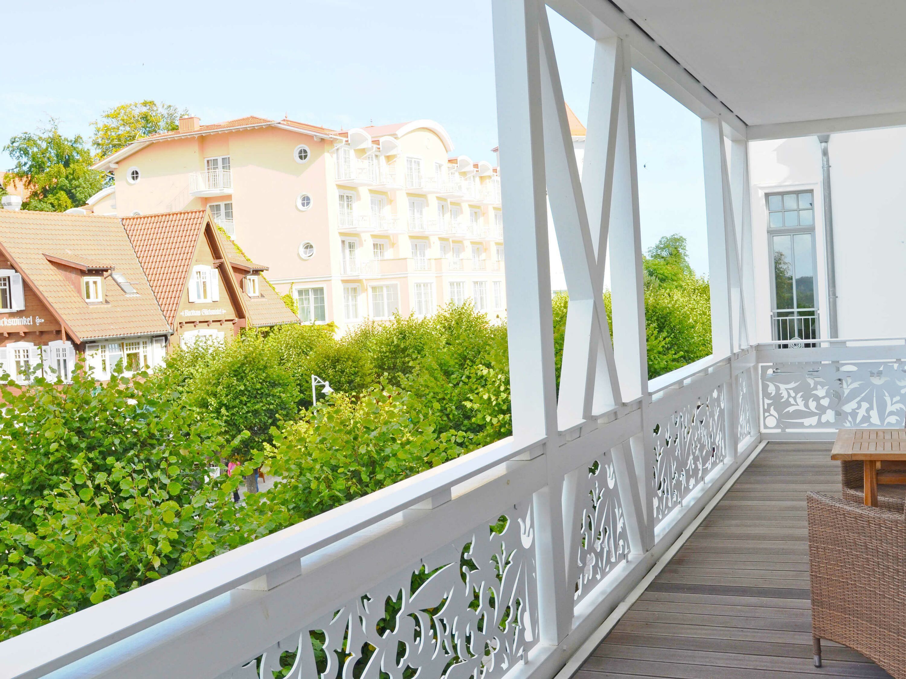 Ein ganz besonderes Highlight sind die beiden je 15 m² großen Sonnenbalkone - einer zur Südseite mit Mittags- und Nachmittagssonne hin gerichtet und der andere zur Westseite mit Abendsonne und einem spektakulären Blick über die traditionsreiche Wilhelmstraße mit seinen weißen Bädervillen - sowie die ca. 20 m² große Terrasse zur Nord-Ostseite, auf der man durch einen Sichtschutz vom Nachbarn getrennt ein gemütliches Frühstück geniessen kann. Hochwertige Terrassenmöbel laden zum Relaxen ein! Jeder Raum verfügt über einen eigenen Zugang zum jeweiligen Balkon bzw. zur Terrasse. Auf der Rückseite des Hauses steht Ihnen der villeneigene Swimmingpool (saisonal) zur Verfügung.