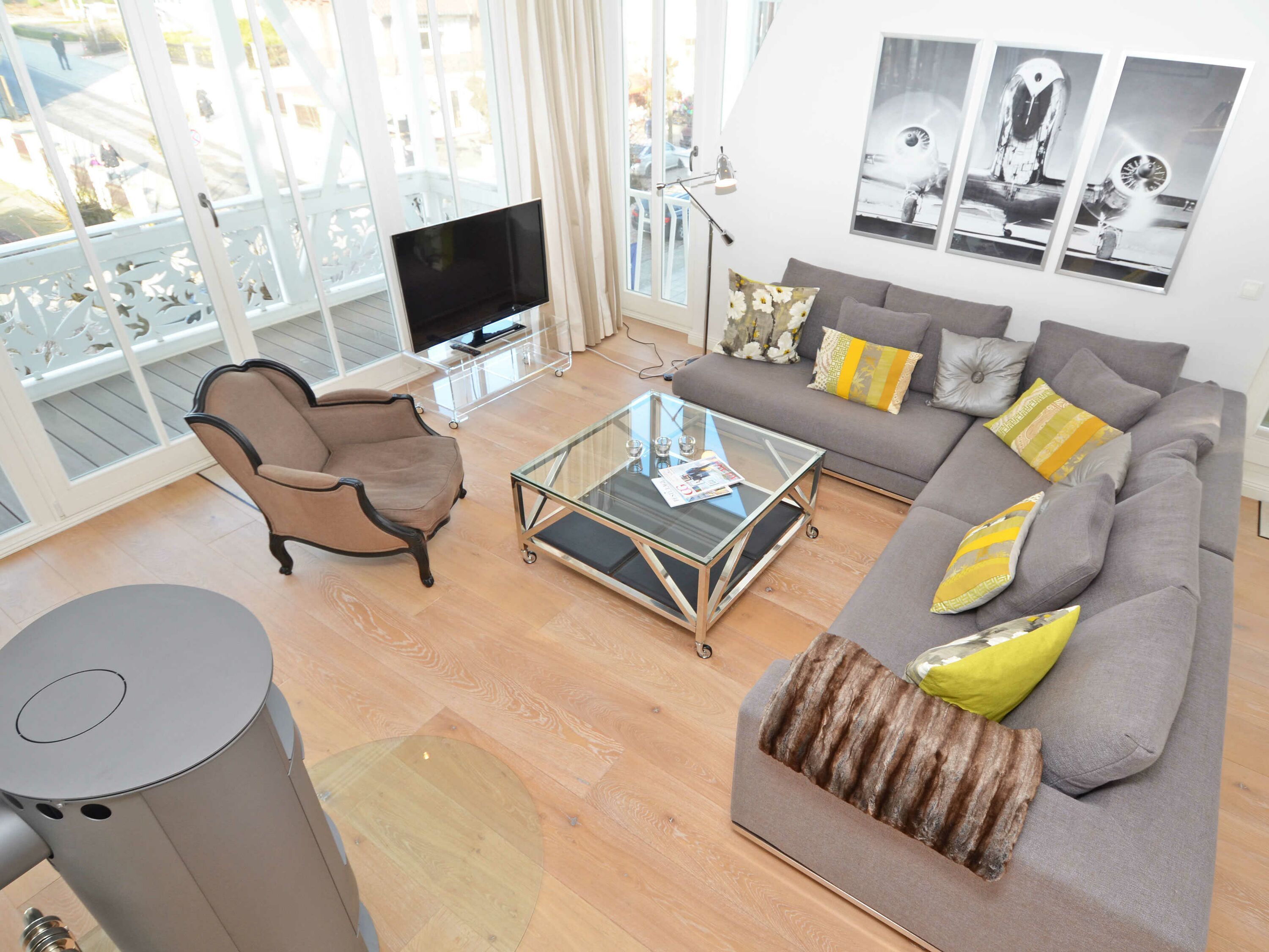 Über einen großzügigen Flur mit modernem Gäste-WC und Garderobe gelangen Sie in den geschmackvollen Wohnbereich, der durch Transparenz und Offenheit besticht. Die eindrucksvolle Wohnlandschaft von ca. 56 m² mit Essbereich ermöglicht entspannte Stunden auf der bequemen Couch vor dem prasselnden Feuer des Kaminofens. Ein großer Esstisch aus Holz mit markanter Oberfläche ermöglicht bis zu 6 Personen ein anregendes Mahl. Ein moderner Flachbild-TV, eine Musikanlage sowie ein W-LAN-Internetzugang stehen natürlich ebenfalls zur Verfügung.