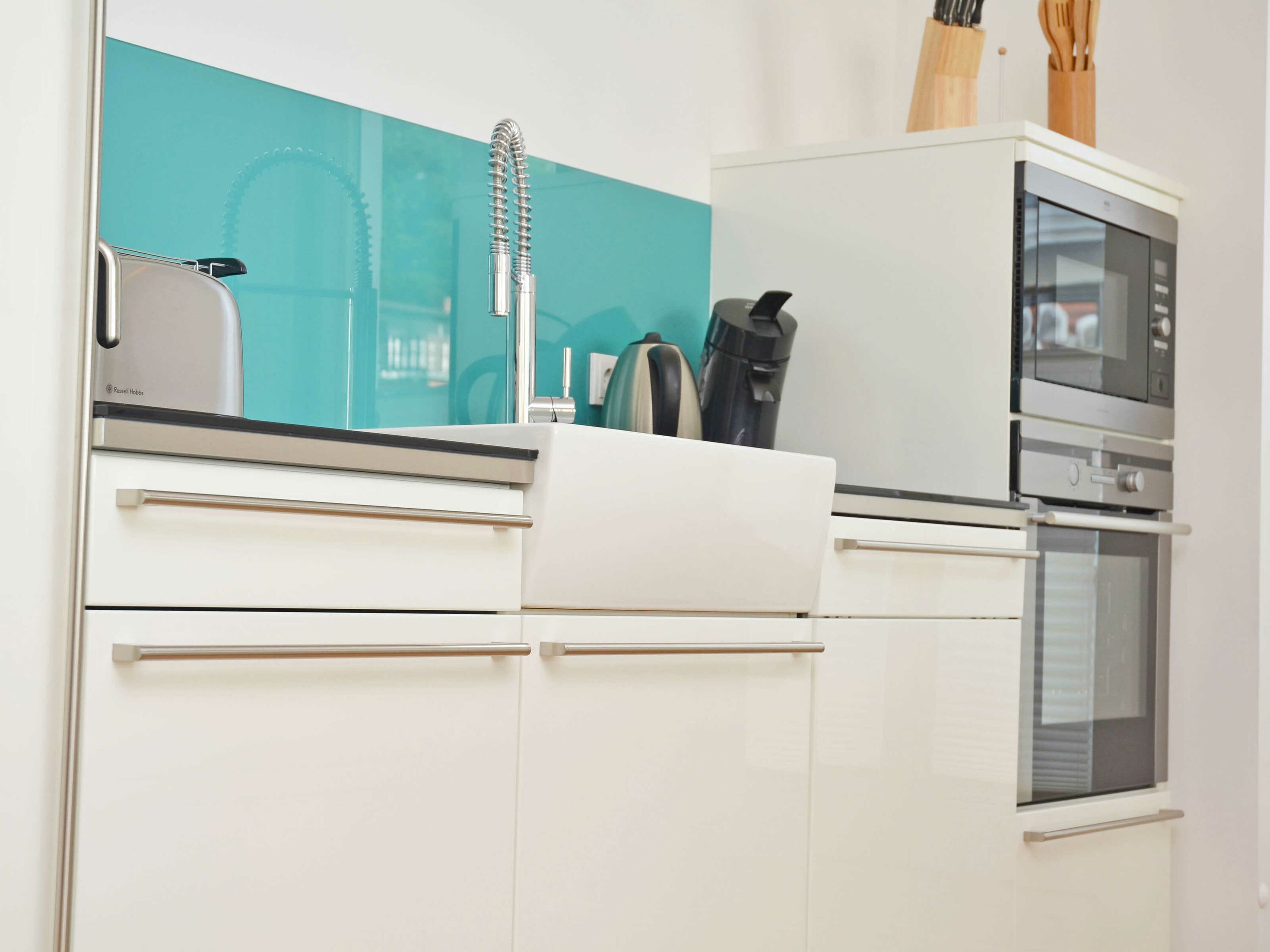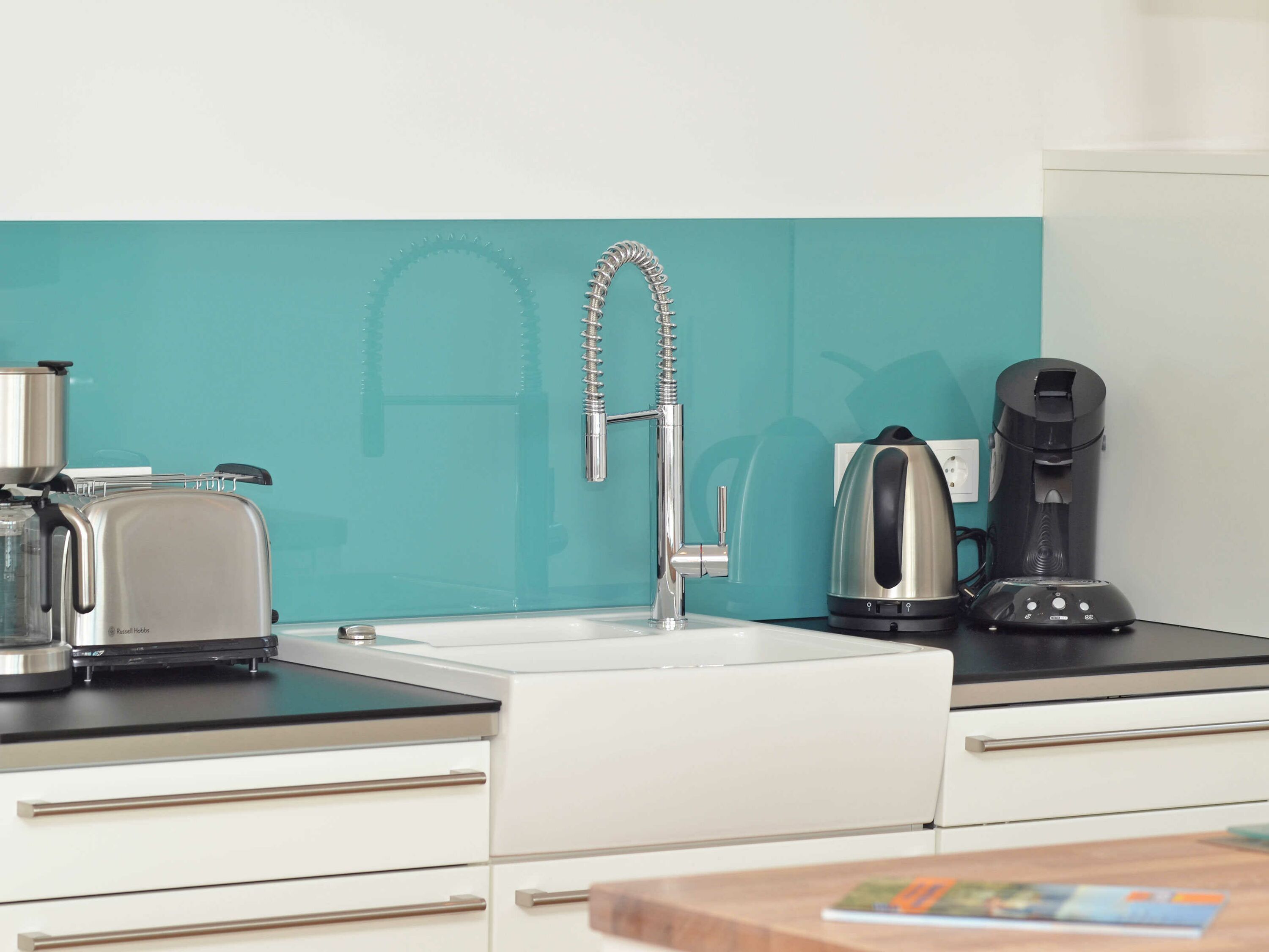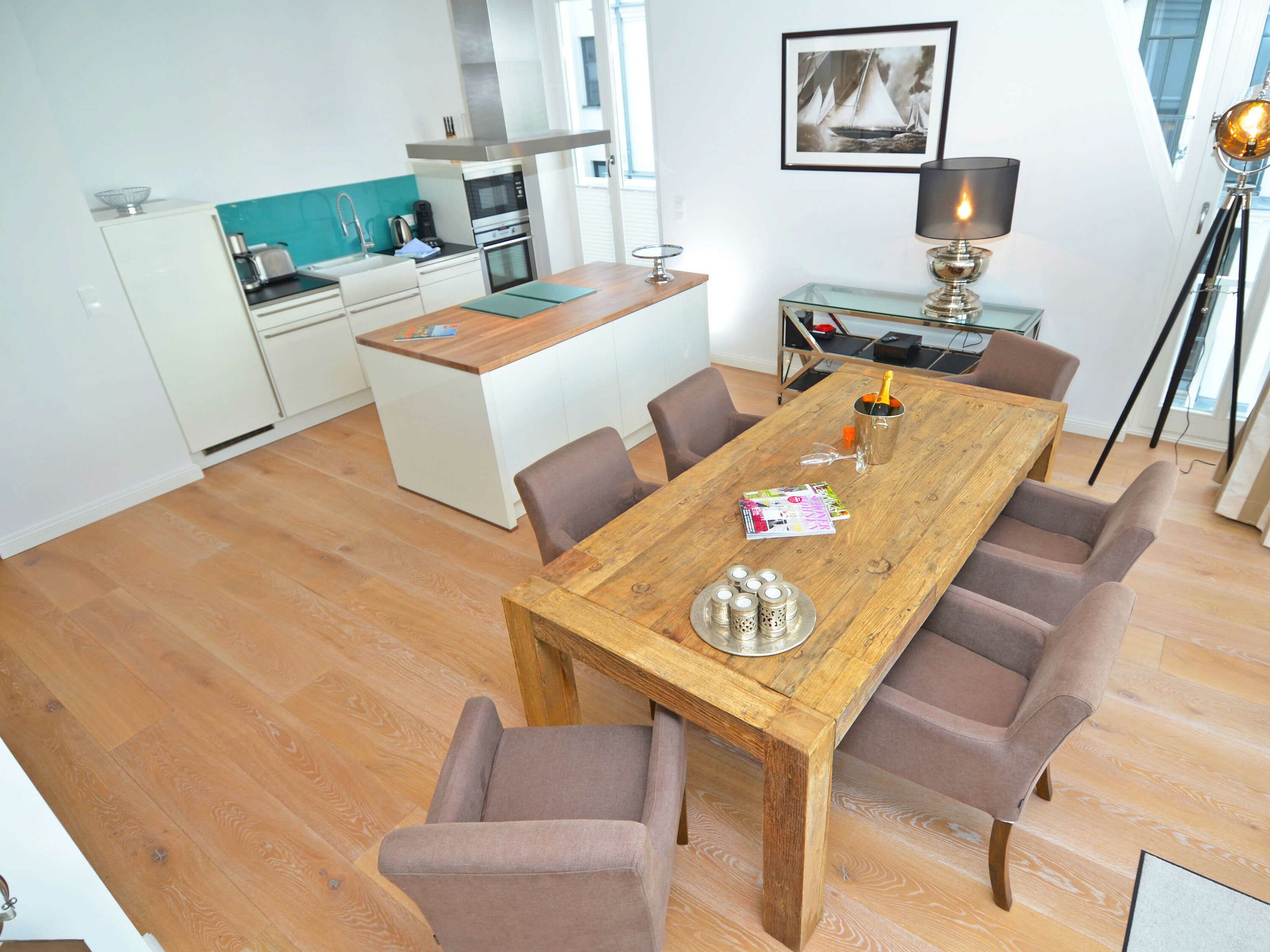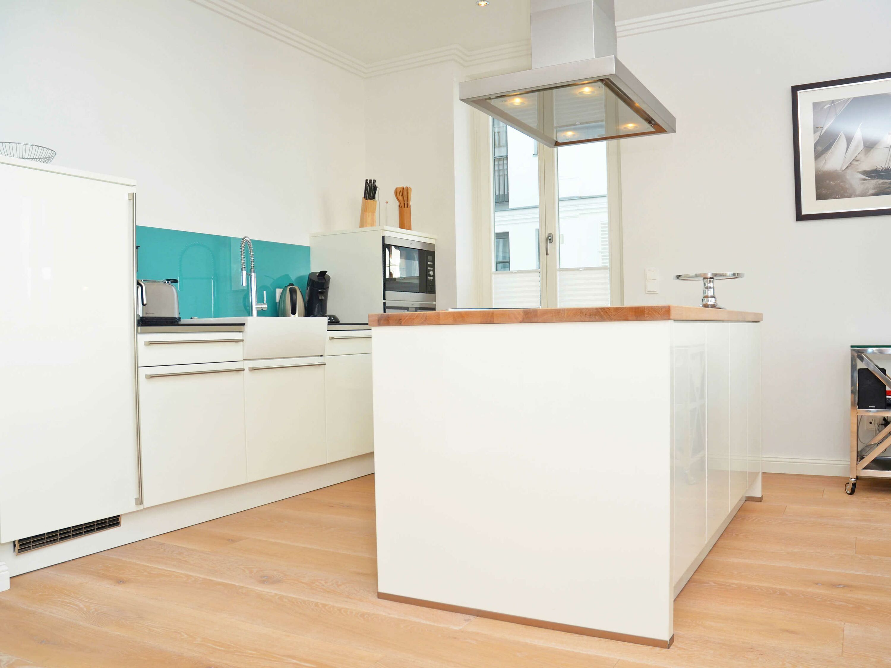 Der in den Wohnraum harmonisch integrierte Kochbereich überzeugt mit hochwertigen Geräten. Der freistehende Kochblock mit Induktionsherd, Backofen, Mikrowelle, Geschirrspüler, Kühlschrank, Kaffeemaschine, Senseo-Kaffeepadmaschine für Kaffeespezialitäten, Toaster, Wasserkocher, Eierkocher und diversem Kleininventar lässt das Herz jeden Hobbykochs höher schlagen.
