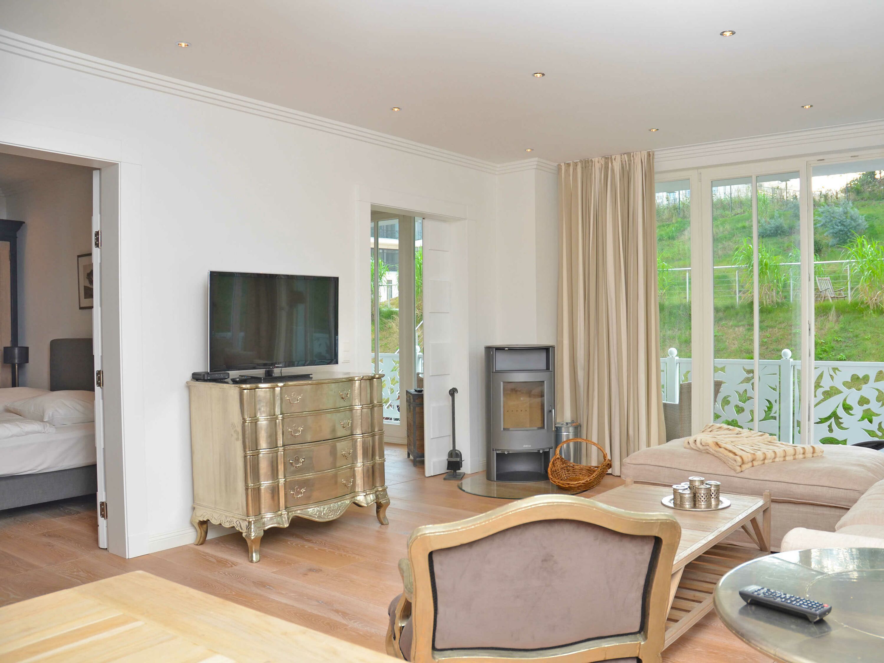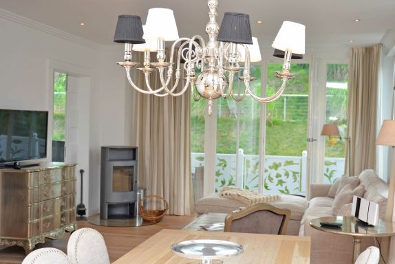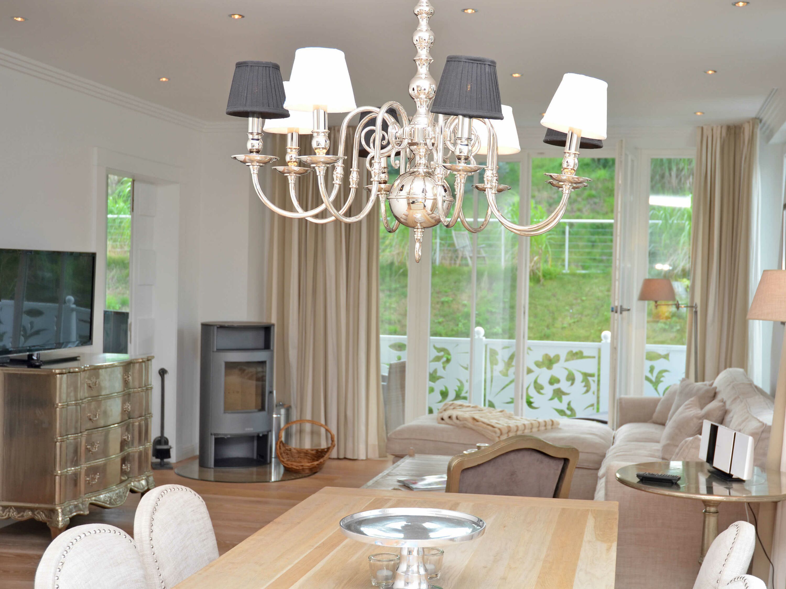 Die ausgedehnte Wohnlandschaft von ca. 47 m² mit Koch-, Ess- und Relaxbereich ermöglicht entspannte Stunden auf der bequemen freistehenden Couch vor dem prasselnden Feuer des Kaminofens oder auch anregende Gespräche an dem großen Holzesstisch mit charakteristischer Oberfläche und den außergewöhnlichen Stühlen. Ein moderner Flachbild-TV, eine Musikanlage sowie ein W-LAN-Internetzugang stehen natürlich auch zur Verfügung.