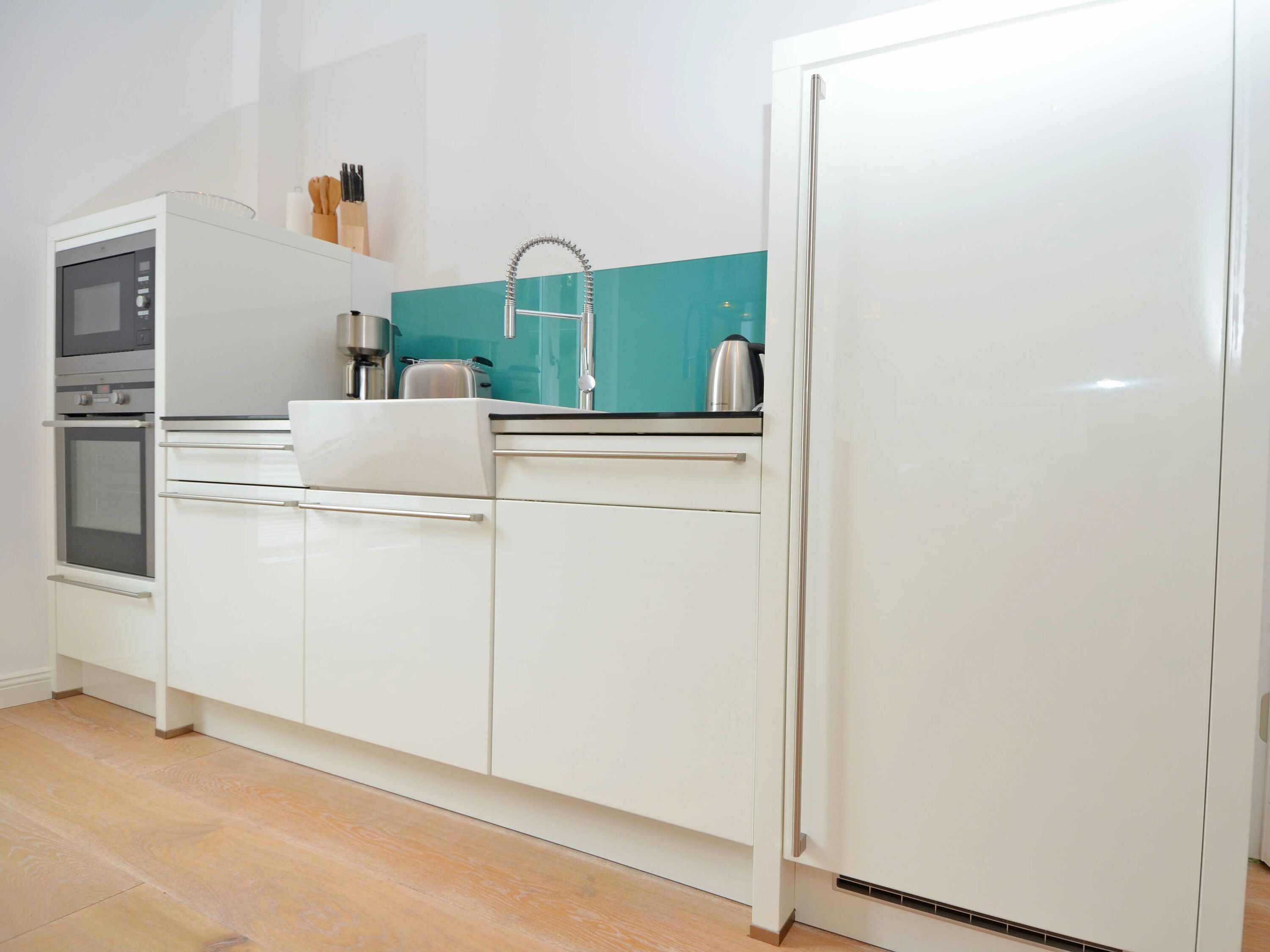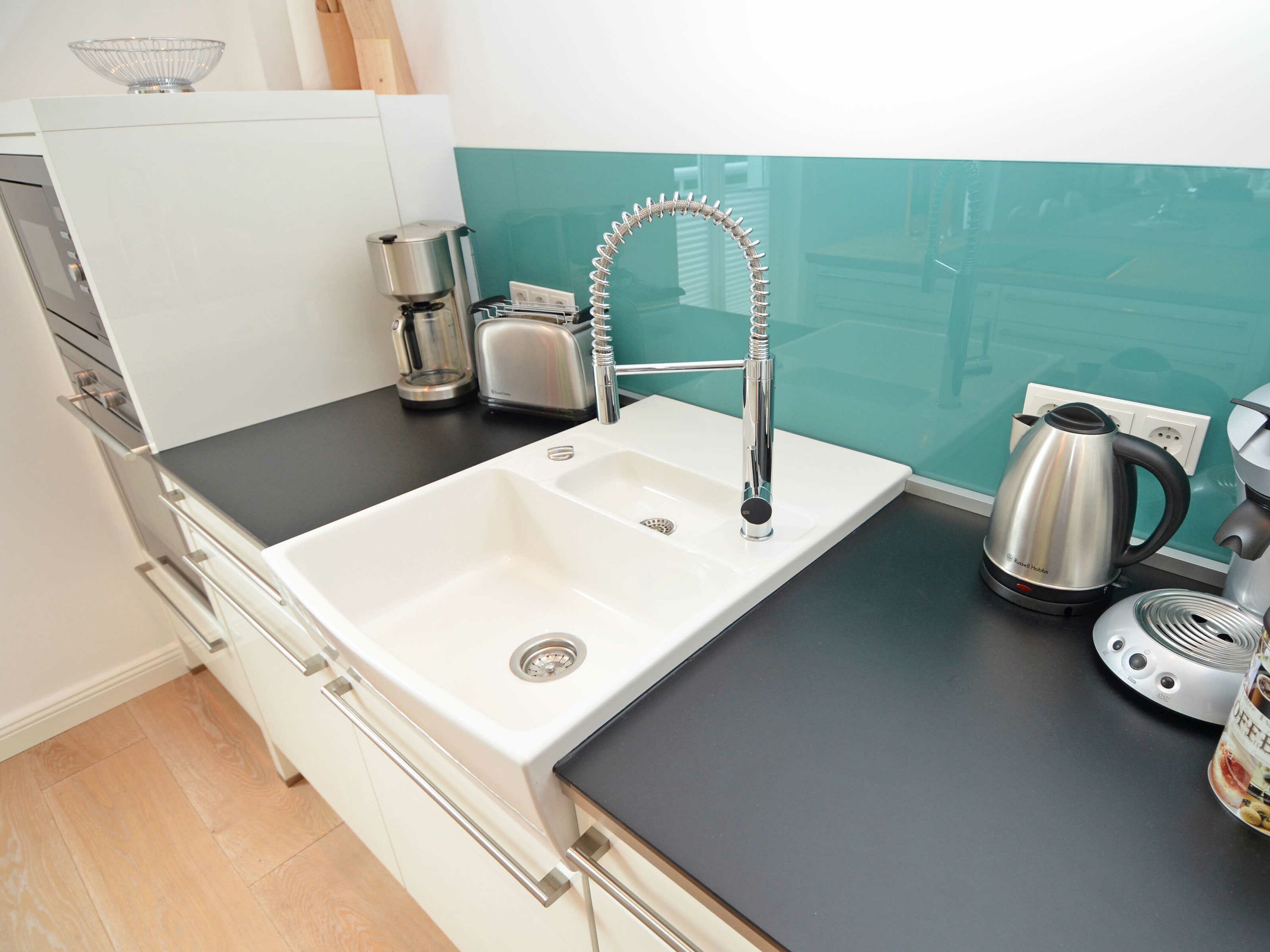 Der in den Wohnraum harmonisch integrierte Kochbereich überzeugt mit hochwertigen Geräten. Der freistehende Kochblock mit Induktionsherd, Backofen, Mikrowelle, Geschirrspüler, Kühlschrank, Kaffeemaschine, Senseo-Kaffeepadmaschine für Kaffeespezialitäten, Toaster, Wasserkocher, Eierkocher und diversem Kleininventar lässt das Herz jeden Hobbykochs höher schlagen.