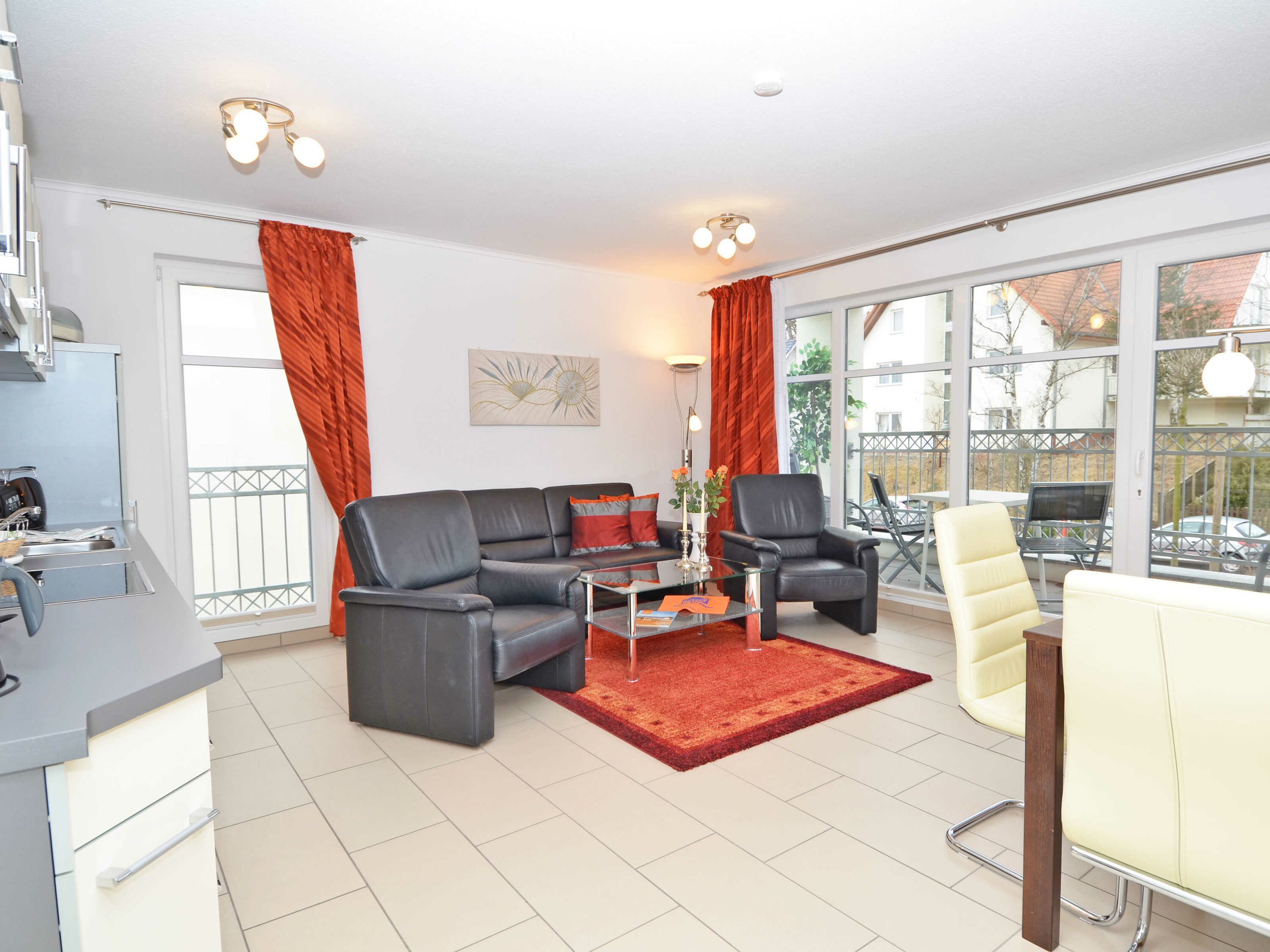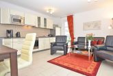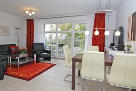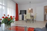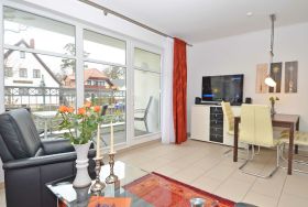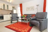 Dieses 58 m² große, komfortabel und geschmackvoll eingerichtete 3-Raum-Appartement befindet sich im Erdgeschoss des zweistöckigen Hauses und hat einen 6 m² großen möblierten Südbalkon, der vom Wohnzimmer aus zu betreten ist.