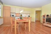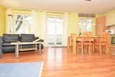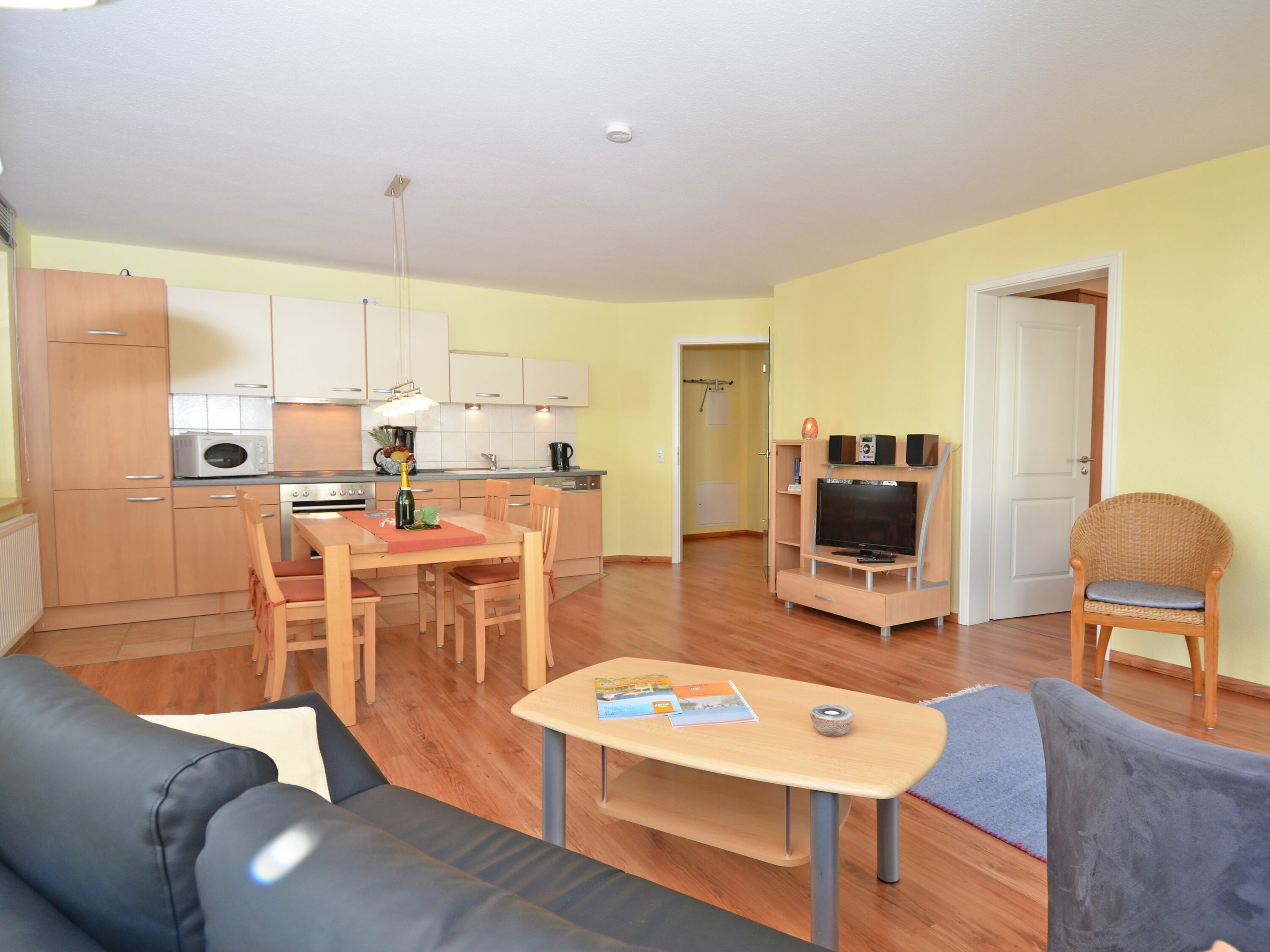Der helle, freundliche Wohnraum ist mit einer bequemen Lederschlafcouch (die als Aufbettung für 2 Personen genutzt werden kann), 1 Sessel, 2 Korbsesseln, einem Flachbild-TV, einer Mini-Stereoanlage mit CD-Player und einem Esstisch passend für die Personenanzahl in der Wohnung ausgestattet.