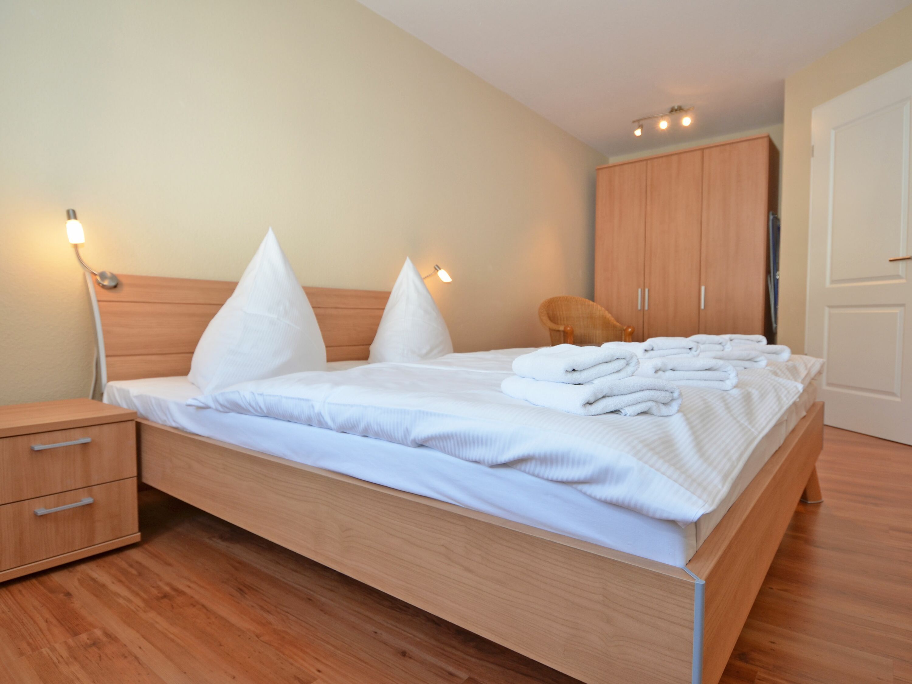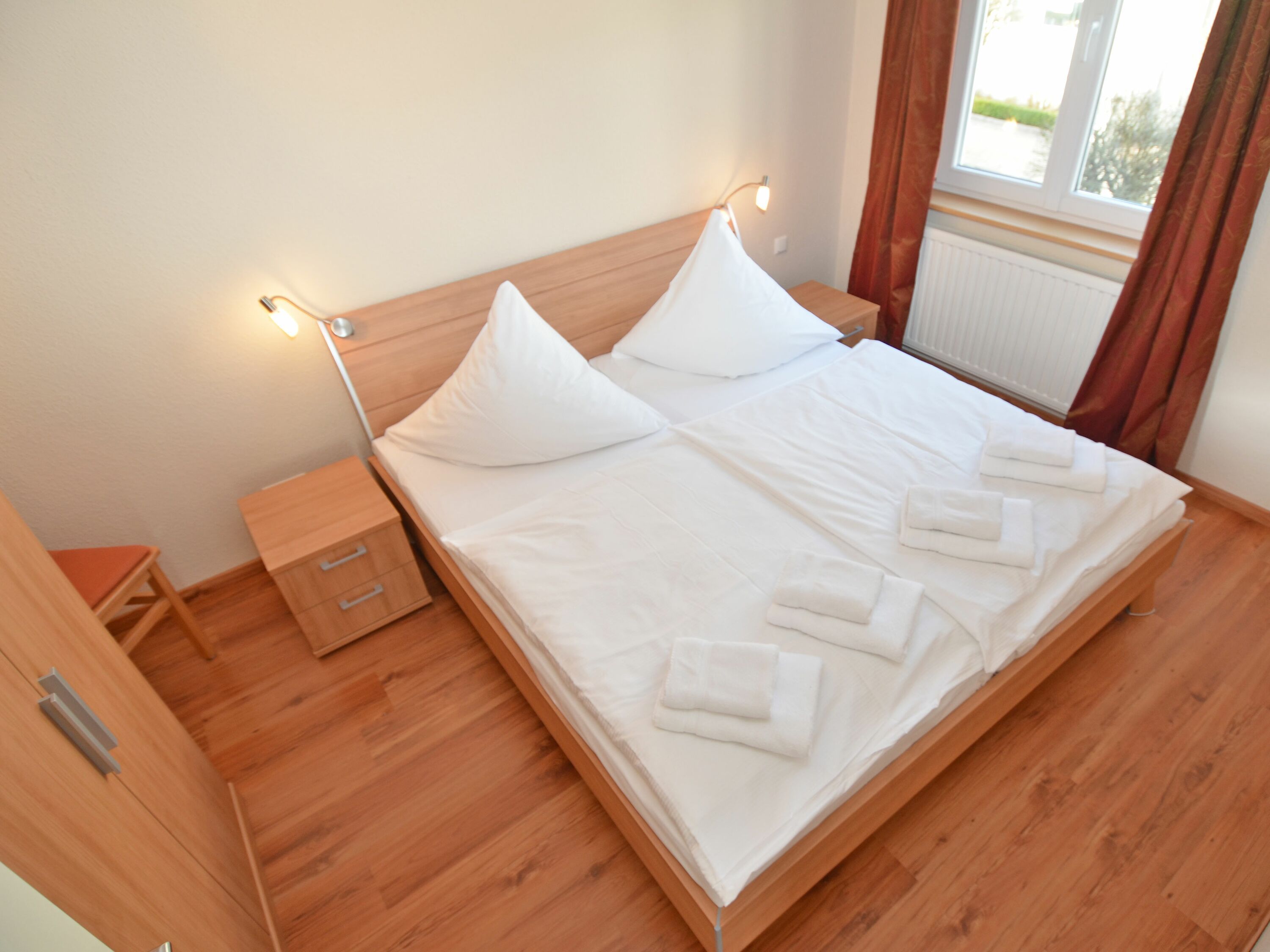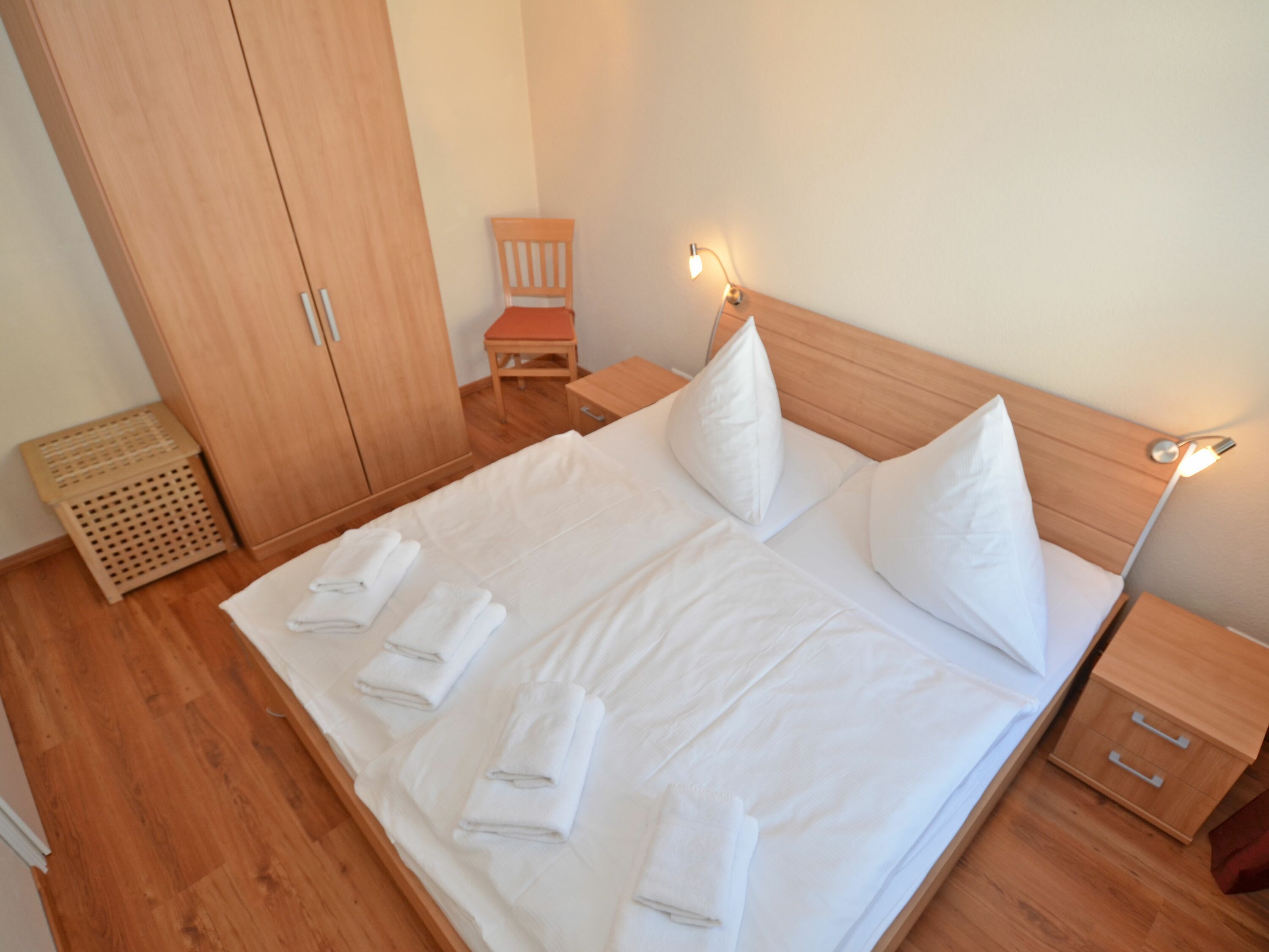 Weiterhin gibt es 2 Schlafzimmer mit je einem Doppelbett und ausreichend Platz für Ihre Garderobe sowie ein modernes Badezimmer mit Dusche/WC, Waschtisch und einem Haartrockner.