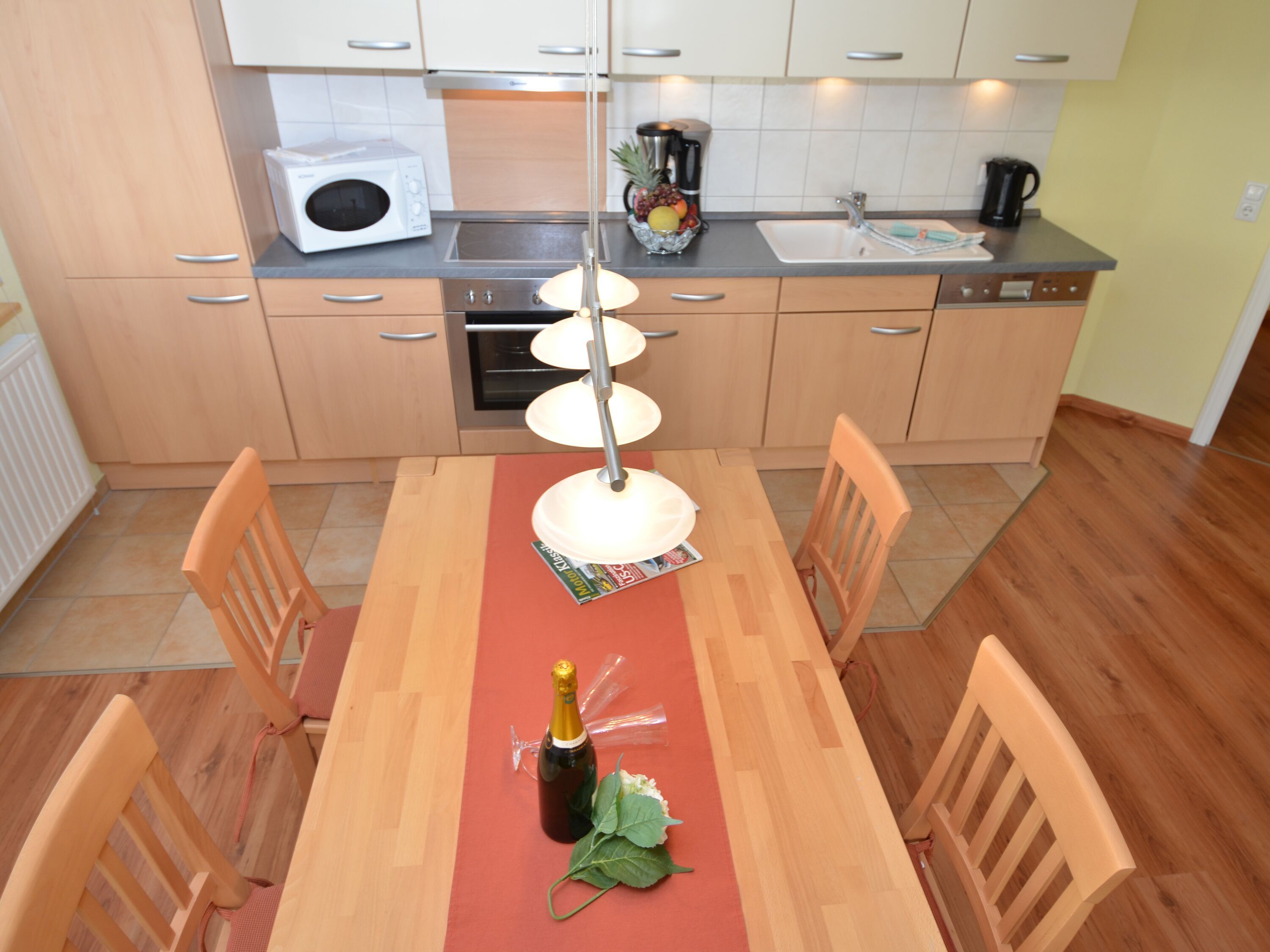 Die harmonisch im Wohnbereich integrierte Küchenzeile ist ausgestattet mit einem Kühlschrank mit Gefrierfach, einem 4-Platten-Cerankochfeld, einem Backofen, einer Geschirrspülmaschine, einer Mikrowelle, Wasserkocher, Kaffeemaschine, Toaster und diversem Kleininventar, das die Küchenausstattung komplettiert.