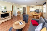 Die harmonisch im Wohnbereich integrierte Küchenzeile ist ausgestattet mit einem Kühlschrank mit Gefrierfach, einem 4-Platten-Cerankochfeld, einem Backofen, einer Geschirrspülmaschine, einer Mikrowelle, Wasserkocher, Kaffeemaschine, Toaster und diversem Kleininventar, das die Küchenausstattung komplettiert.