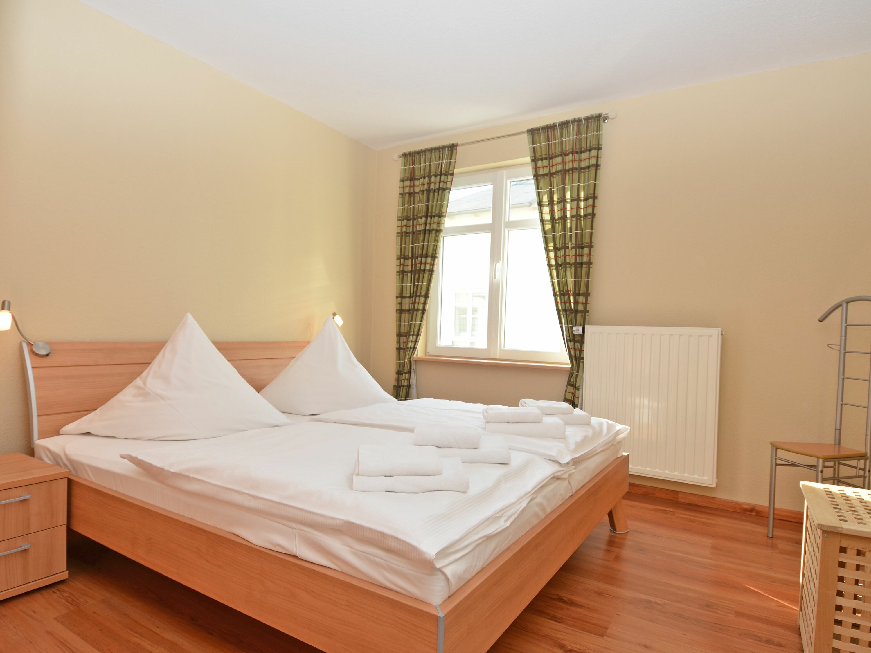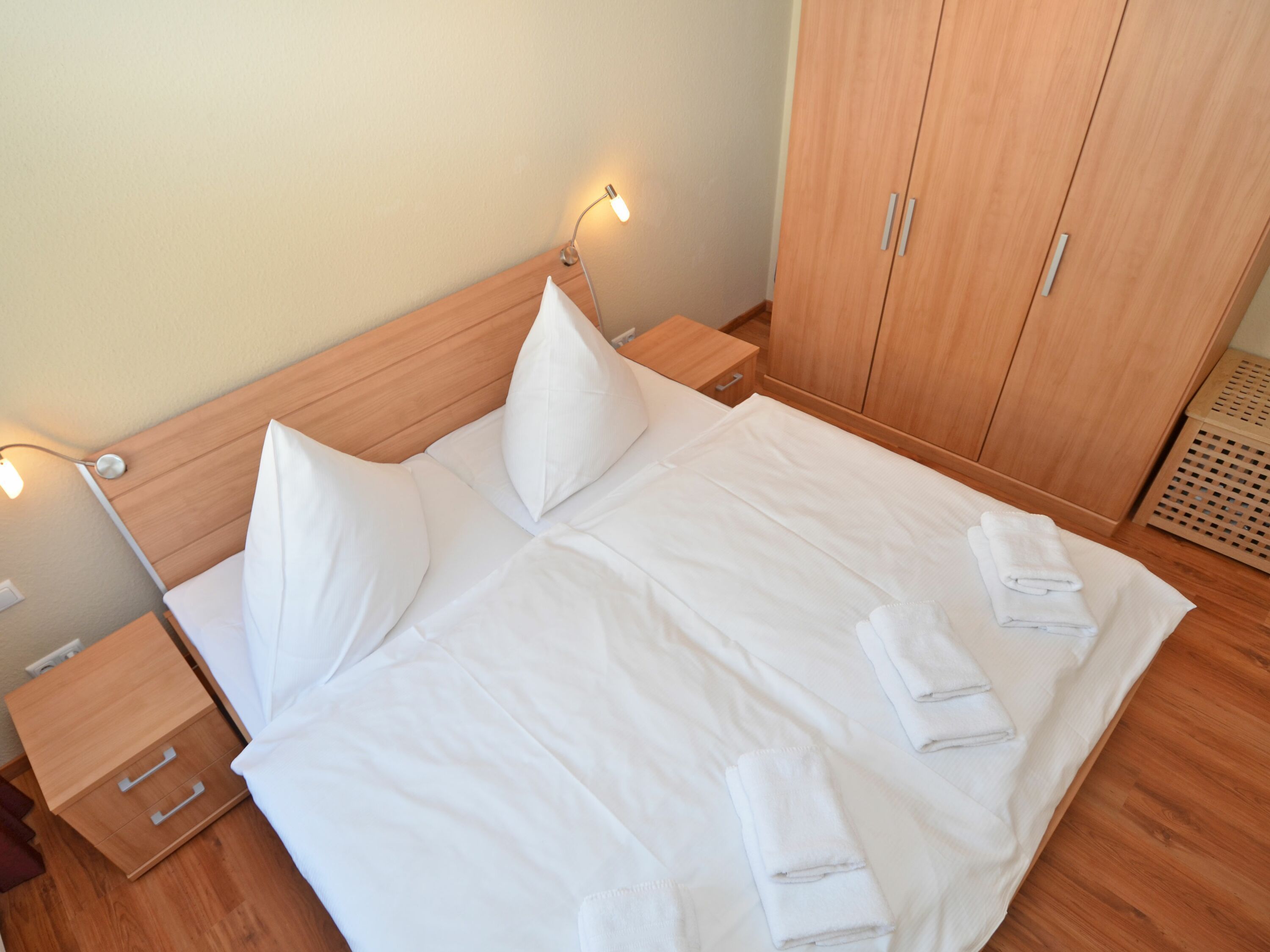 Weiterhin gibt es 2 Schlafzimmer mit je einem Doppelbett und ausreichend Platz für Ihre Garderobe sowie ein modernes Badezimmer mit Dusche/WC, Waschtisch und einem Haartrockner.