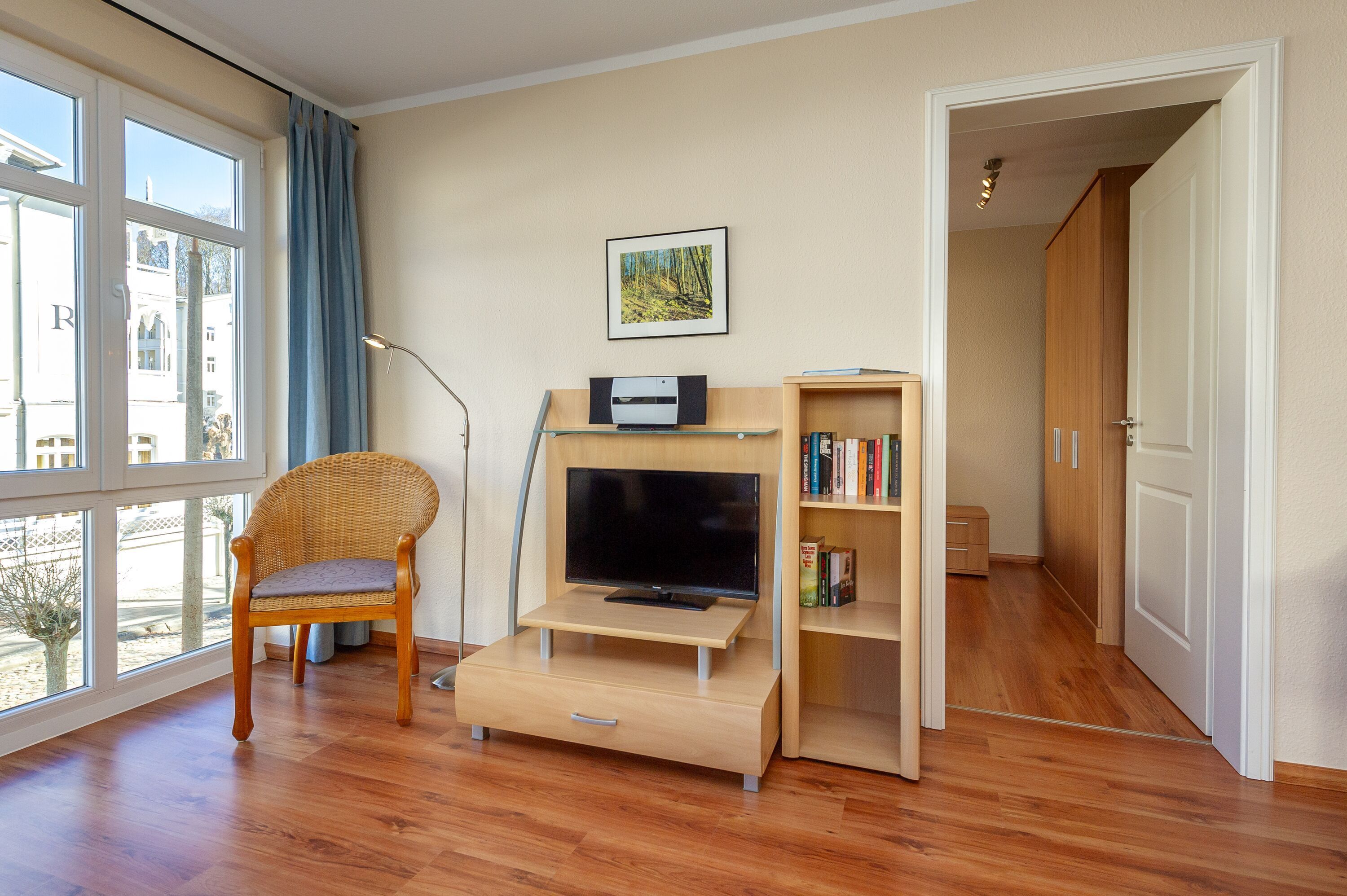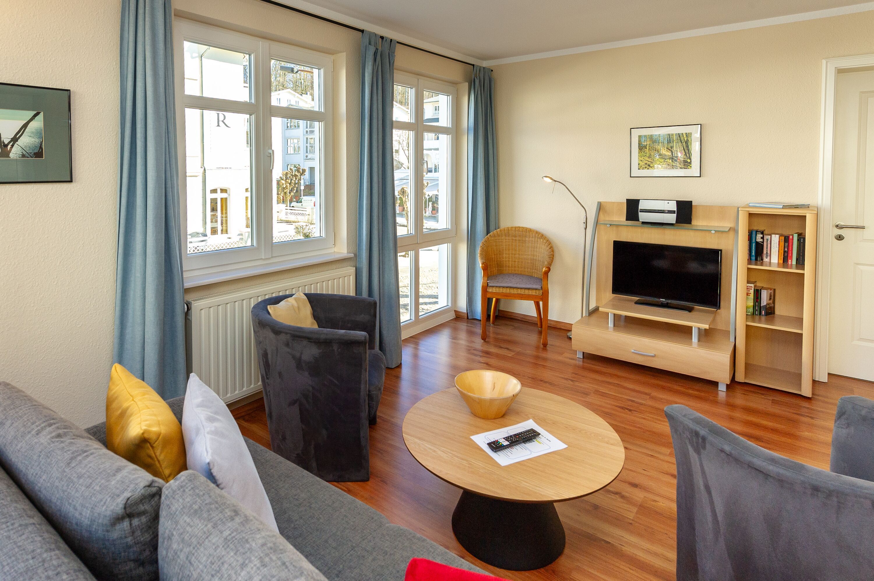 Der helle, freundliche Wohnraum ist mit einer bequemen Lederschlafcouch (die als Aufbettung für 2 Personen genutzt werden kann), 1 Sessel, 2 Korbsesseln, einem Flachbild-TV, einer Mini-Stereoanlage mit CD-Player und einem Esstisch passend für die Personenanzahl in der Wohnung ausgestattet.