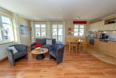Der helle, freundliche Wohnraum ist mit einer bequemen Lederschlafcouch (die als Aufbettung für 2 Personen genutzt werden kann), zwei Sesseln, einem Kaminofen, einem Flachbild-TV, einer Mini-Stereoanlage mit CD-Player und einem Esstisch passend für die Personenanzahl in der Wohnung ausgestattet.