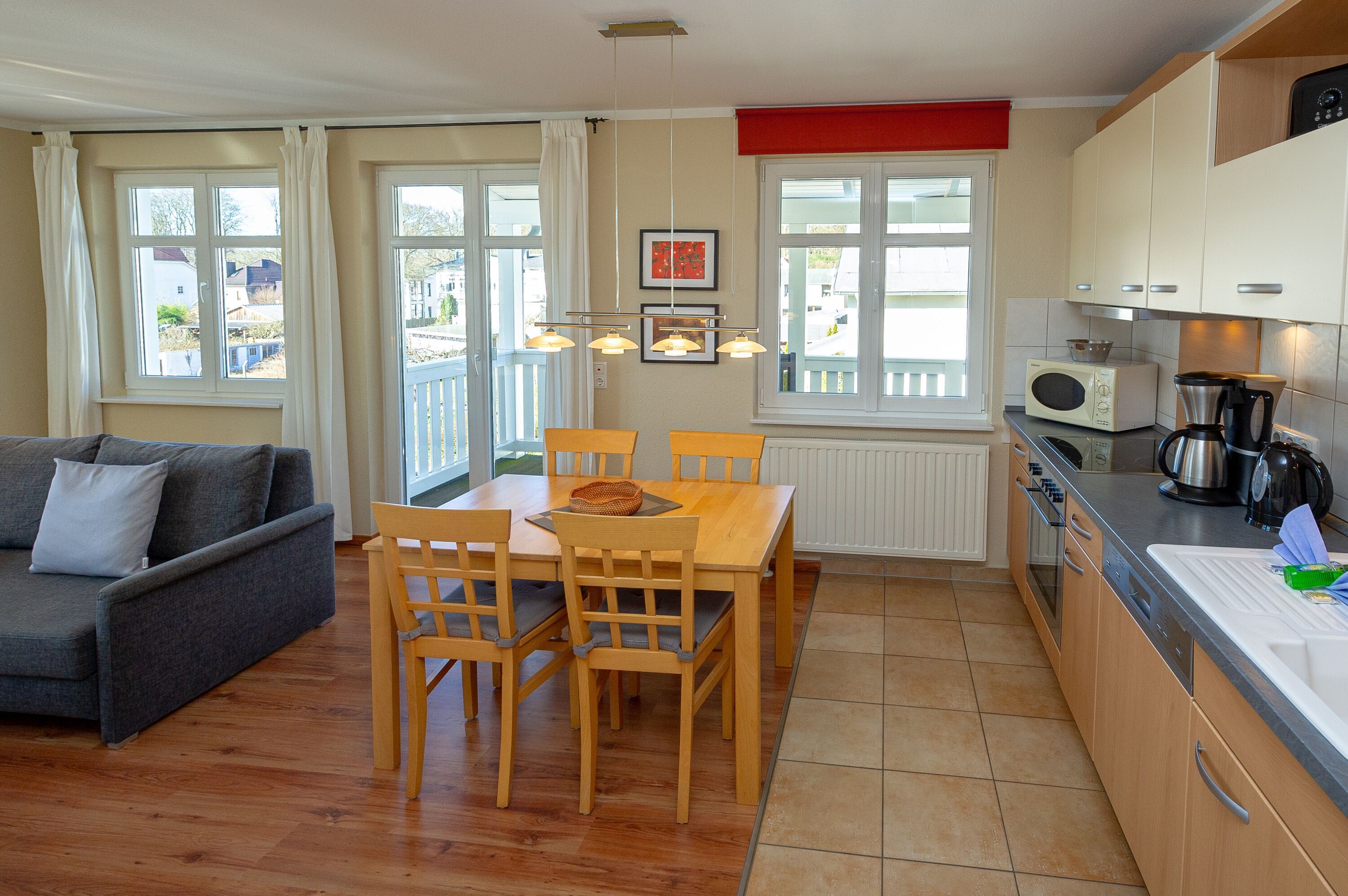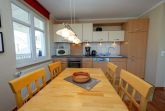 Die harmonisch im Wohnbereich integrierte Küchenzeile ist ausgestattet mit einem Kühlschrank mit Gefrierfach, einem 4-Platten-Cerankochfeld, einem Backofen, einer Geschirrspülmaschine, einer Mikrowelle, Wasserkocher, Kaffeemaschine, Toaster und diversem Kleininventar, das die Küchenausstattung komplettiert.