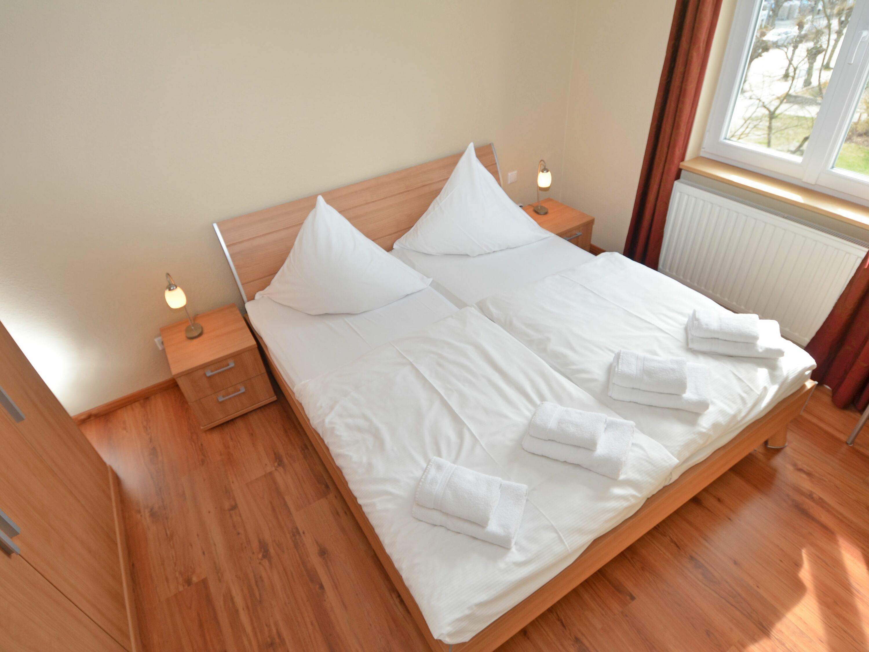 Weiterhin gibt es zwei Schlafzimmer mit je einem bequemen Doppelbett und ausreichend Platz für Ihre Garderobe sowie ein modernes Bad mit Dusche/WC und einem Haartrockner.