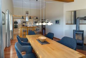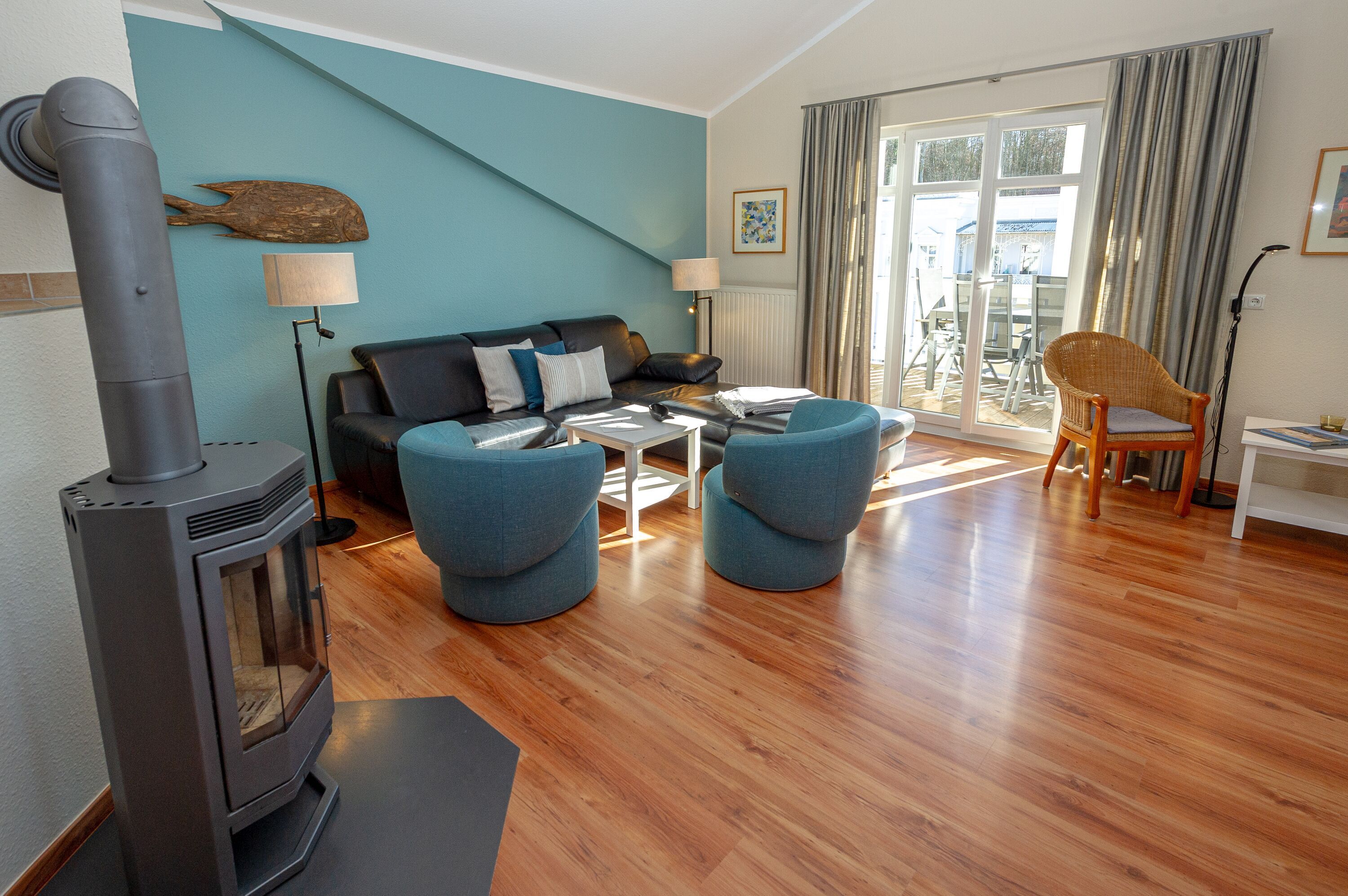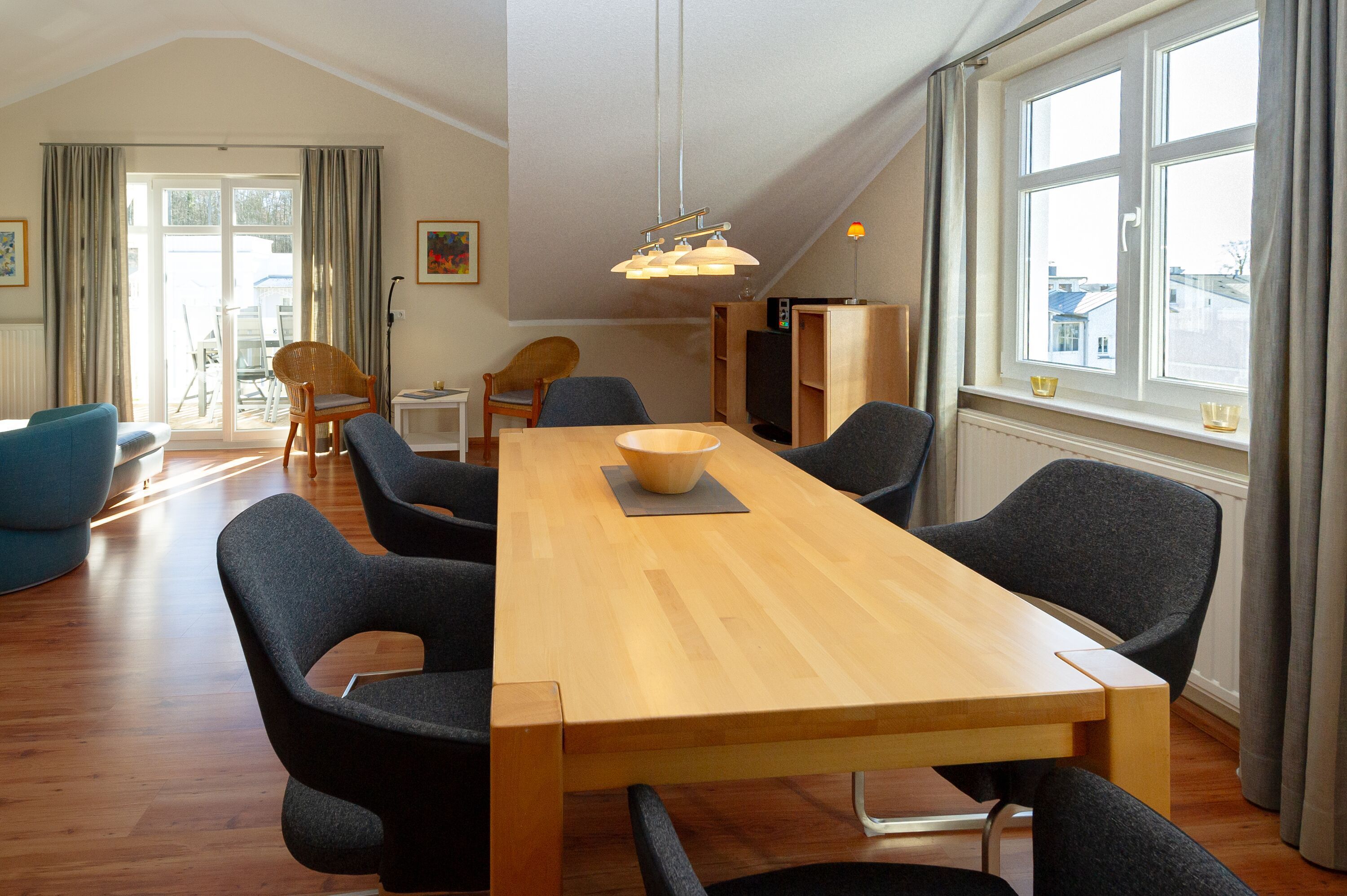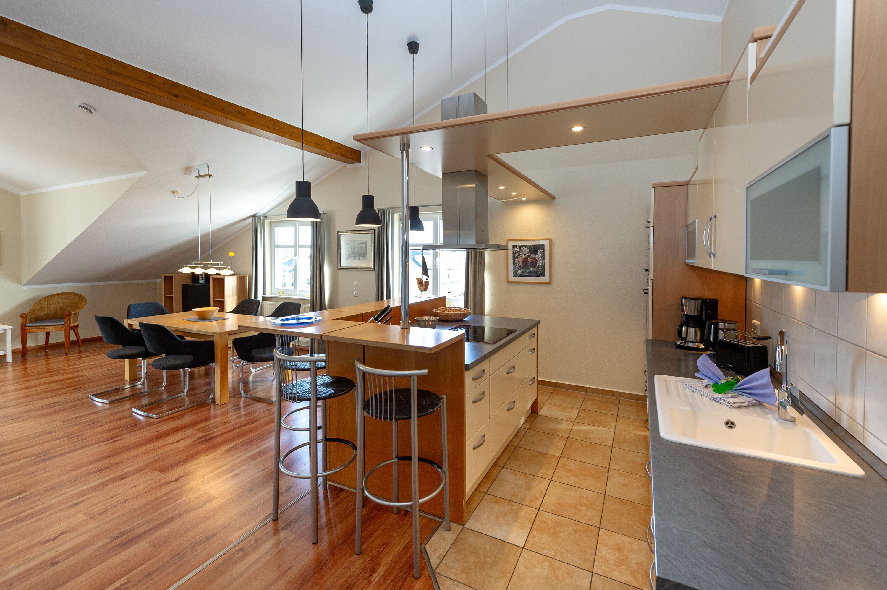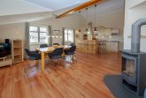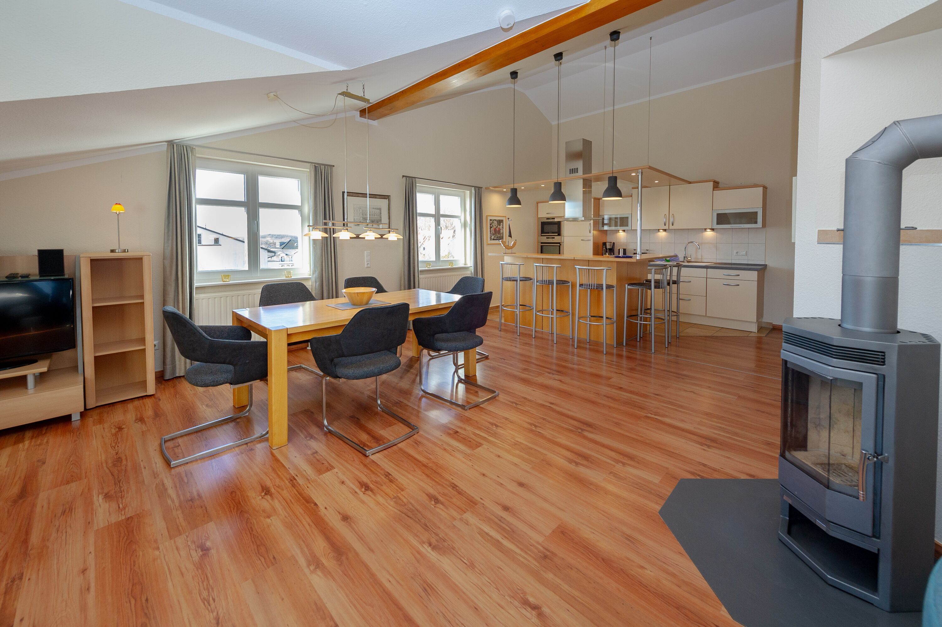 Der helle, großzügige Wohnraum ist mit einer bequemen Couch, zwei Sesseln, zwei Korbsesseln, einem Kaminofen, einem Flachbild-TV, einer Mini-Stereoanlage mit CD-Player und einem Esstisch passend für die Personenanzahl in der Wohnung ausgestattet. Die leichten Dachschrägen mit den offenen Balken vermitteln eine besondere Gemütlichkeit.