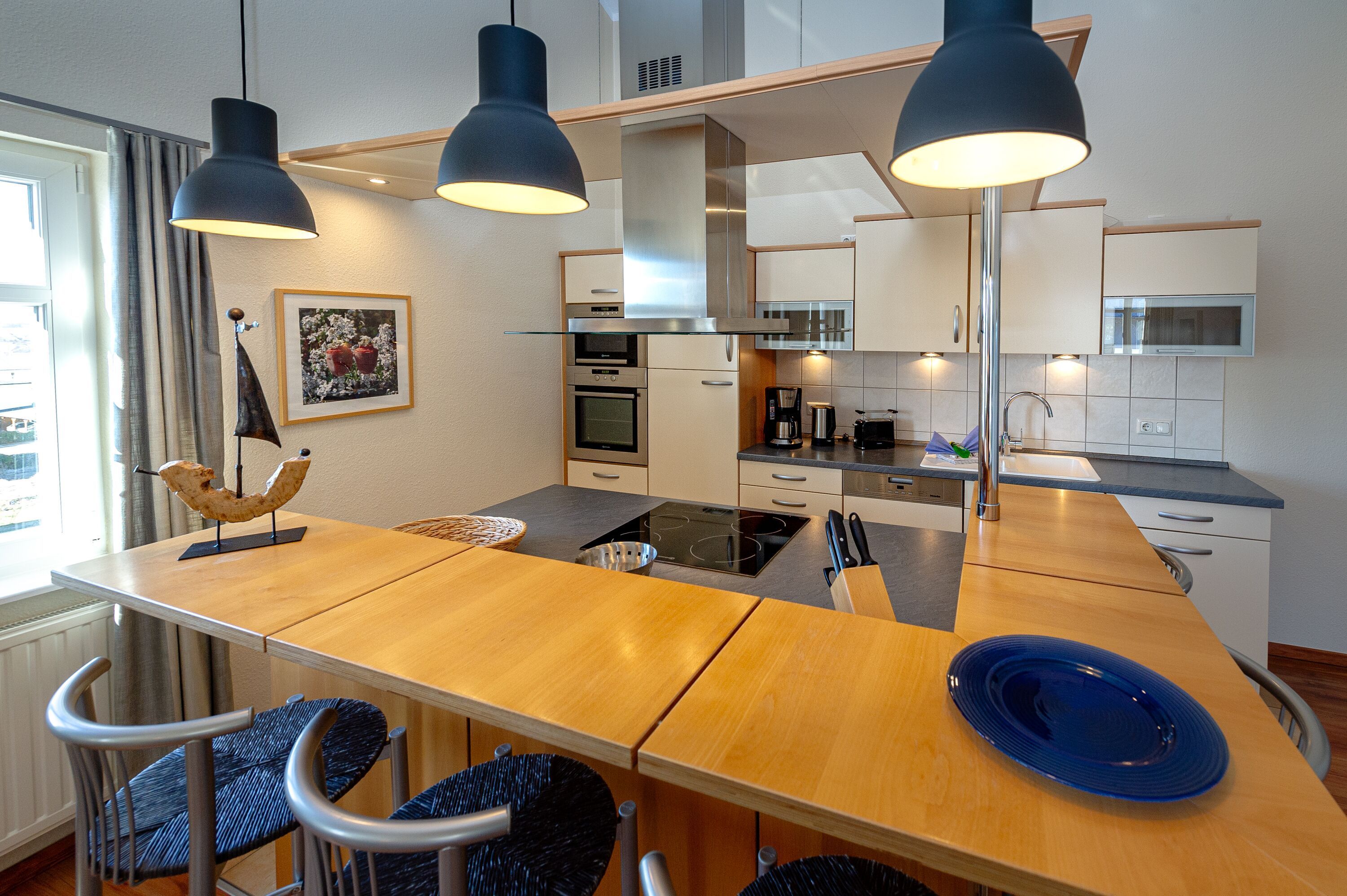 Die harmonisch im Wohnbereich integrierte Küche ist komplett ausgestattet mit einem Kühlschrank mit Gefrierfach, einer Geschirrspülmaschine, Wasserkocher, Kaffeemaschine, Toaster und diversem Kleininventar, das die Küchenausstattung komplettiert. Der Backofen und die Mikrowelle befinden sich auf Augenhöhe und sind bequem erreichbar. Ein separater Küchenblock mit einem 4-Platten-Cerankochfeld und einem Esstresen mit Barhockern vervollständigen den sehr guten Eindruck.