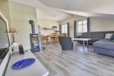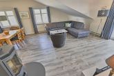 Der helle, freundliche Wohnraum ist mit einer bequemen Schlafcouch (die als Aufbettung für 2 Personen genutzt werden kann), 2 Sesseln und 2 Korbsesseln, einem Kaminofen, einem Flachbild-TV, einer Mini-Stereoanlage mit CD-Player und einem Esstisch passend für die Personenanzahl in der Wohnung ausgestattet.