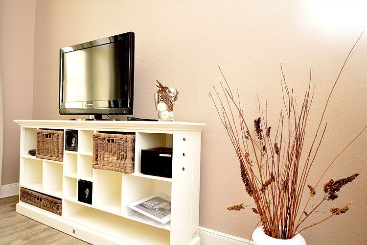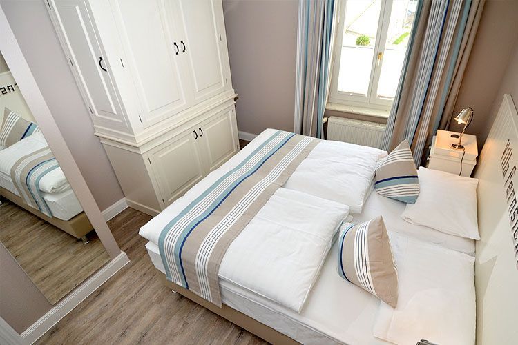 Die gesamte Nichtraucherwohnung ist gefliest bzw. mit Designerboden in Vintage-Oak-Optik versehen. Das Schlafzimmer ist mit einem 5 Star-Deluxe-Boxspring-Doppelbett (1,80 x 2,00 m) sowie ausreichend Stauraum für Ihre Garderobe ausgestattet. Die Wohnung verfügt darüber hinaus über ein modernes Duschbad.