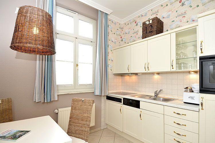 In der separaten Küche mit einem Esstisch für zwei Personen finden Sie u.a. einen Kühlschrank mit Gefrierfach, einen 4-Platten-Ceranherd, eine Spülmaschine, eine Mikrowelle mit Grillfunktion und diverses Kleininventar, das die Küchenausstattung komplettiert.