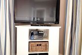 Die gesamte Nichtraucherwohnung ist gefliest bzw. mit Designerboden in Vintage-Oak-Optik versehen. Das Schlafzimmer ist mit einem 5 Star-Deluxe-Boxspring-Doppelbett (1,80 x 2,00 m) sowie ausreichend Stauraum für Ihre Garderobe ausgestattet.