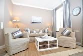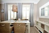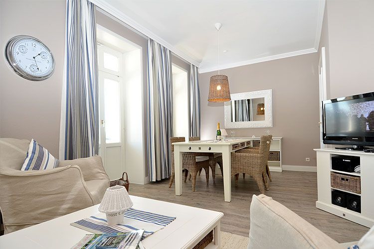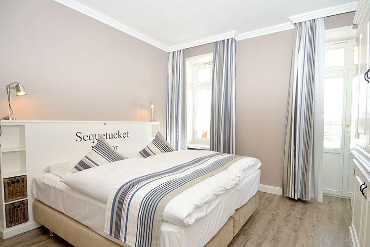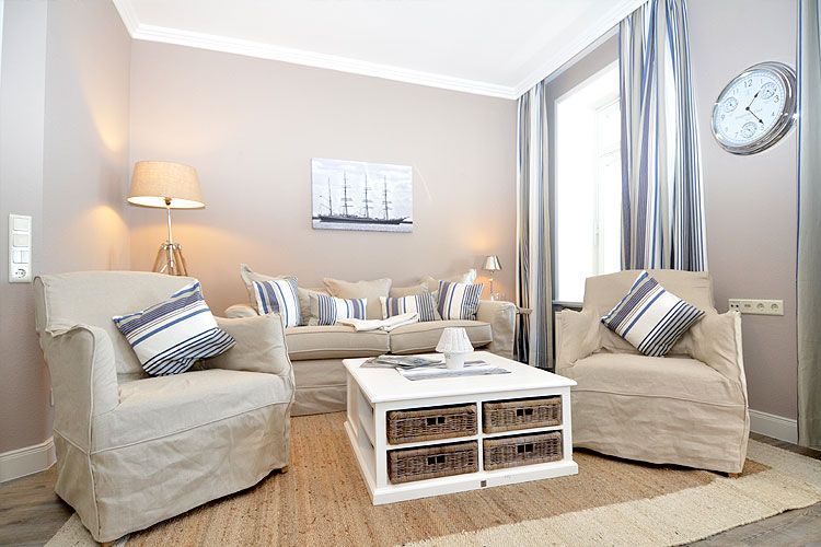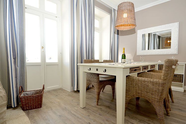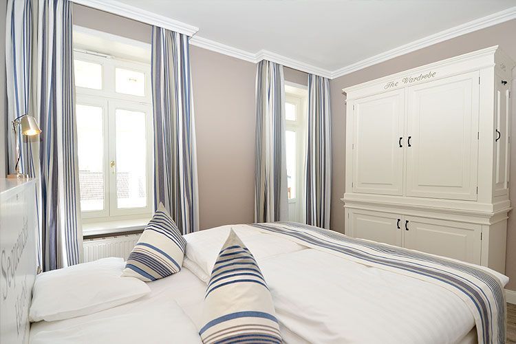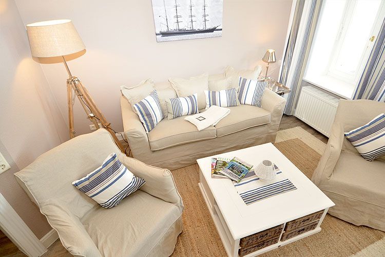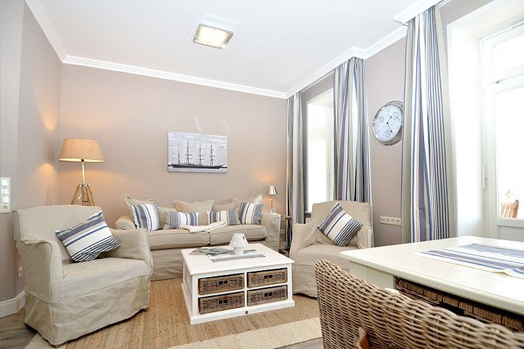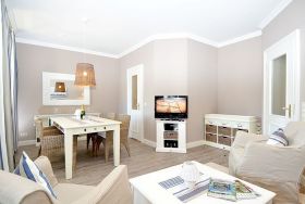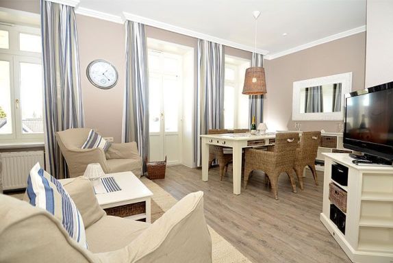 Dieses rund 70 m² große und sehr stilvoll eingerichtete 3-Raum-Appartement begrüßt Sie im 2. Obergeschoss und begeistert u.a. mit seinem ca. 20 m² möblierten Holzbalkon im Bäderstil zur Morgensonne mit Blick auf die Wilhelmstrasse. Dieser Balkon mit Teakholz-Möblierung ist sowohl vom Wohnzimmer als auch vom Schlafzimmer aus zu betreten. Die wunderschönen Landhausmöbel, ausgesuchte Stoffe und die warmen Erdtöne schaffen mit den leicht maritimen Akzenten ein ganz einzigartiges Wohlfühlambiente.