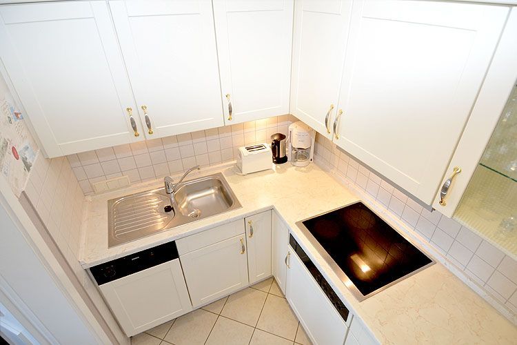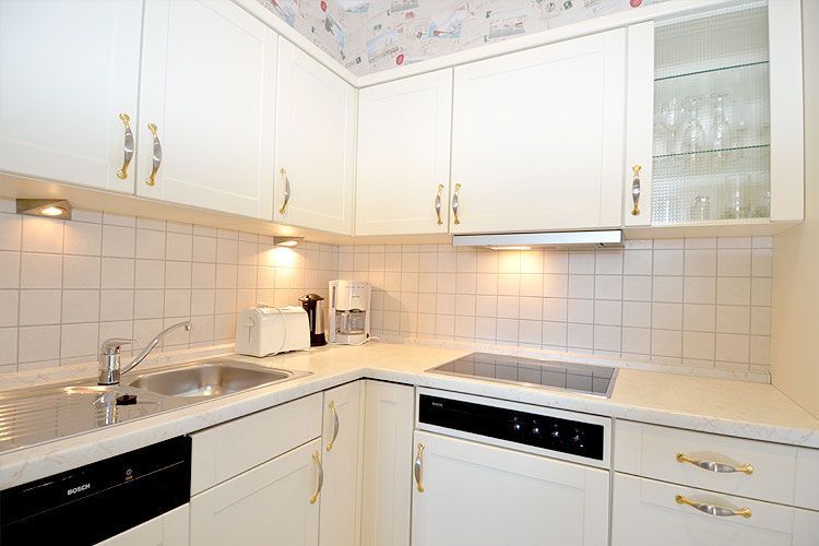 Die separate Küche ist ausgestattet mit einem Kühlschrank mit Gefrierfach, einem 4-Platten-Ceranfeld, einer Spülmaschine, einer Mikrowelle mit Grillfunktion und diversem Kleininventar, das die Küchenausstattung komplettiert.