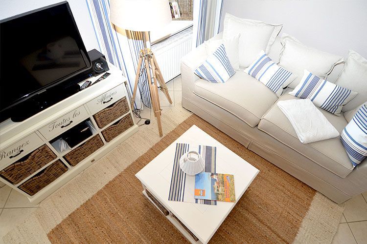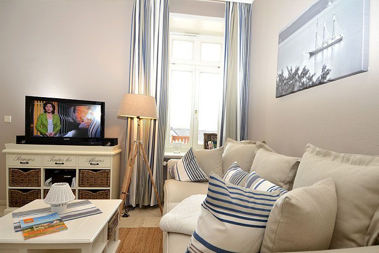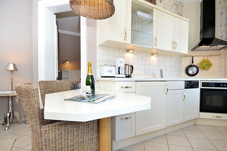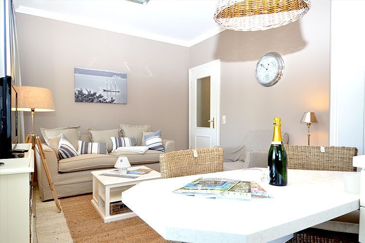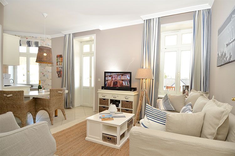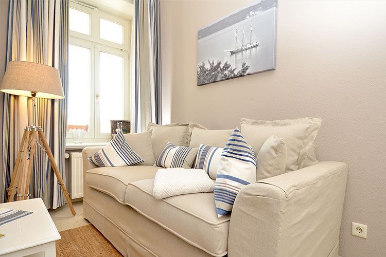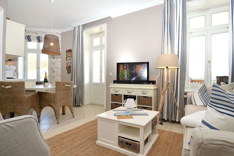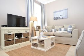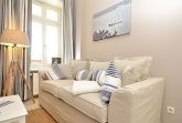 Dieses gut 40m² große und sehr stilvoll eingerichtete 2-Raum-Appartement erwartet Sie im 2. Obergeschoss und bietet u.a. einen 11m² möblierten Holzbalkon im Bäderstil zur Morgensonne mit Blick auf die Wilhelmstrasse. Die wunderschönen Landhausmöbel, ausgesuchte Stoffe und die warmen Erdtöne schaffen mit den leicht maritimen Akzenten ein ganz einzigartiges Wohlfühlambiente. Die gesamte Nichtraucherwohnung ist gefliest bzw. mit Designerboden in Vintage-Oak-Optik versehen.