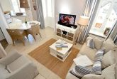 Vom Flur aus gelangen Sie in den überaus geschmackvoll ausgestatteten Wohnbereich mit der kuscheligen Couch und dem bequemen Sessel, einem Flachbild-TV, einer Stereoanlage und einem Esstisch für zwei Personen. Während Ihres Aufenthaltes steht Ihnen darüber hinaus auch kostenfrei W-LAN zur Verfügung.