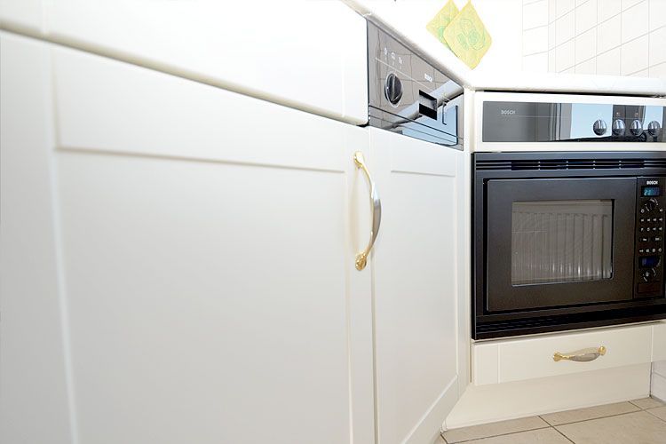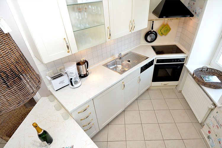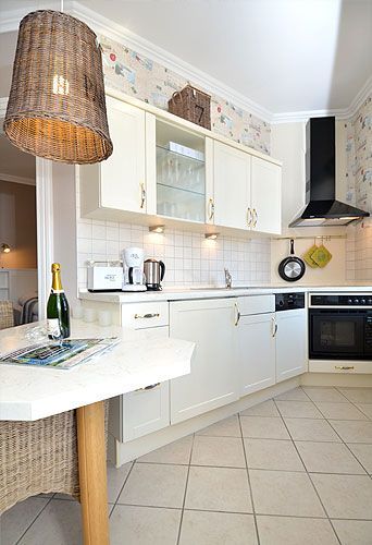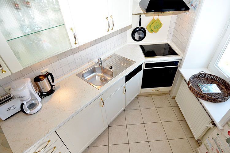 Die harmonisch im Wohnbereich integrierte Küchenzeile ist ausgestattet mit einem Kühlschrank mit Gefrierfach, einem 4-Platten-Ceranfeld, einer Spülmaschine, einer Mikrowelle mit Grillfunktion und diversem Kleininventar, das die Küchenausstattung komplettiert.
