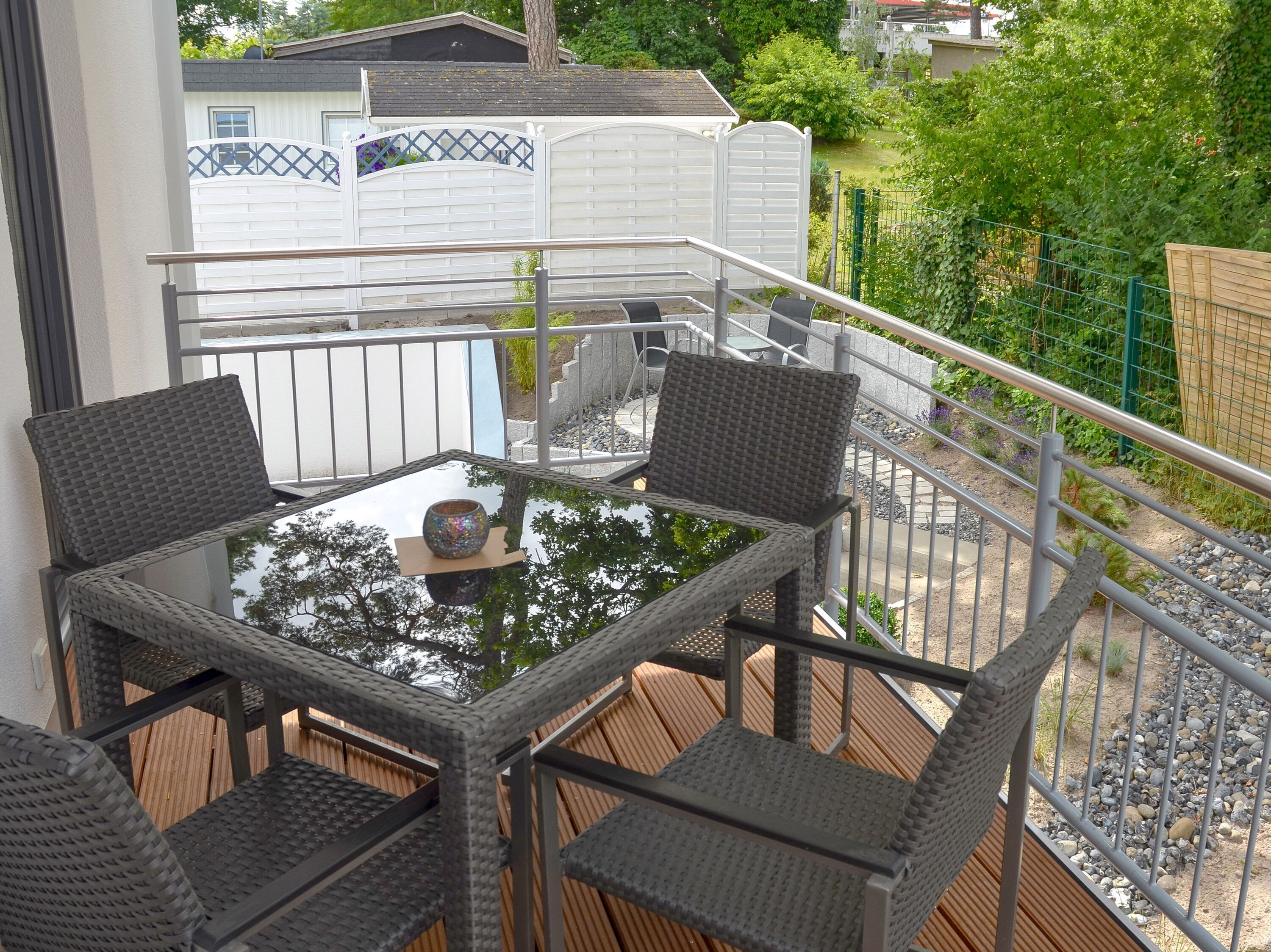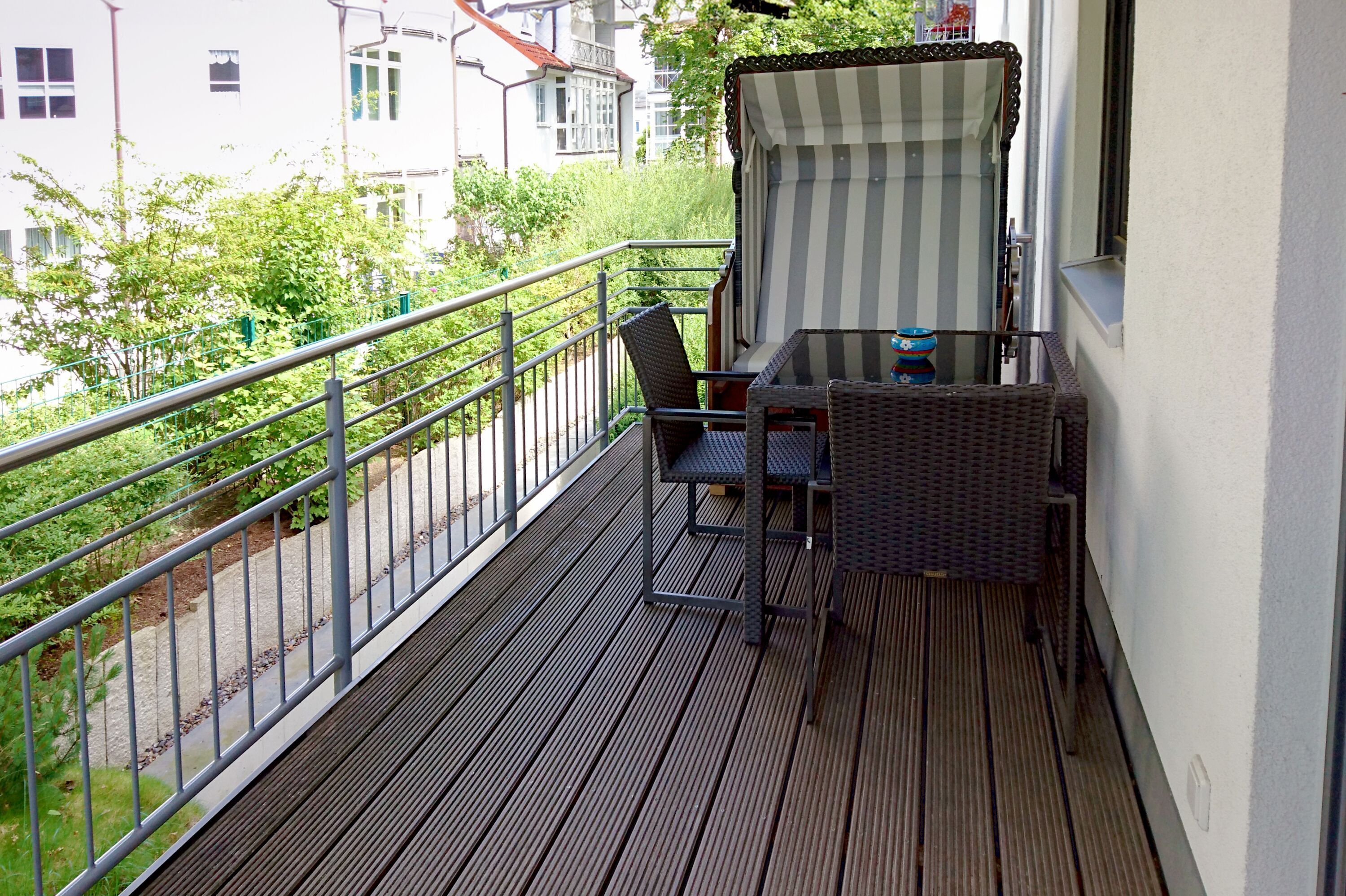 Auf dem 10 qm großen möblierten Balkon der Wohnung können Sie die Abendsonne bei einem Glas Wein genießen und haben einen schönen Ausblick ins Grüne von Binz. Zum Einkuscheln steht ihnen hier sogar ein Strandkorb zur Verfügung.