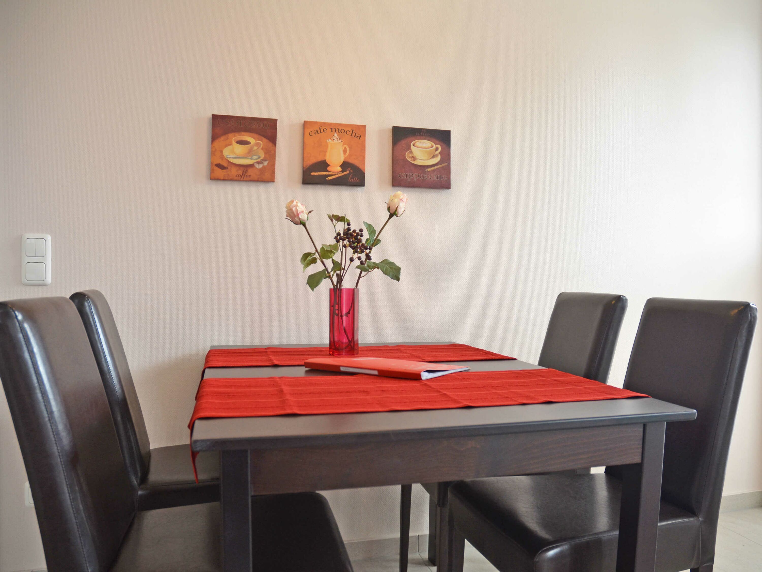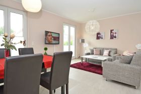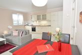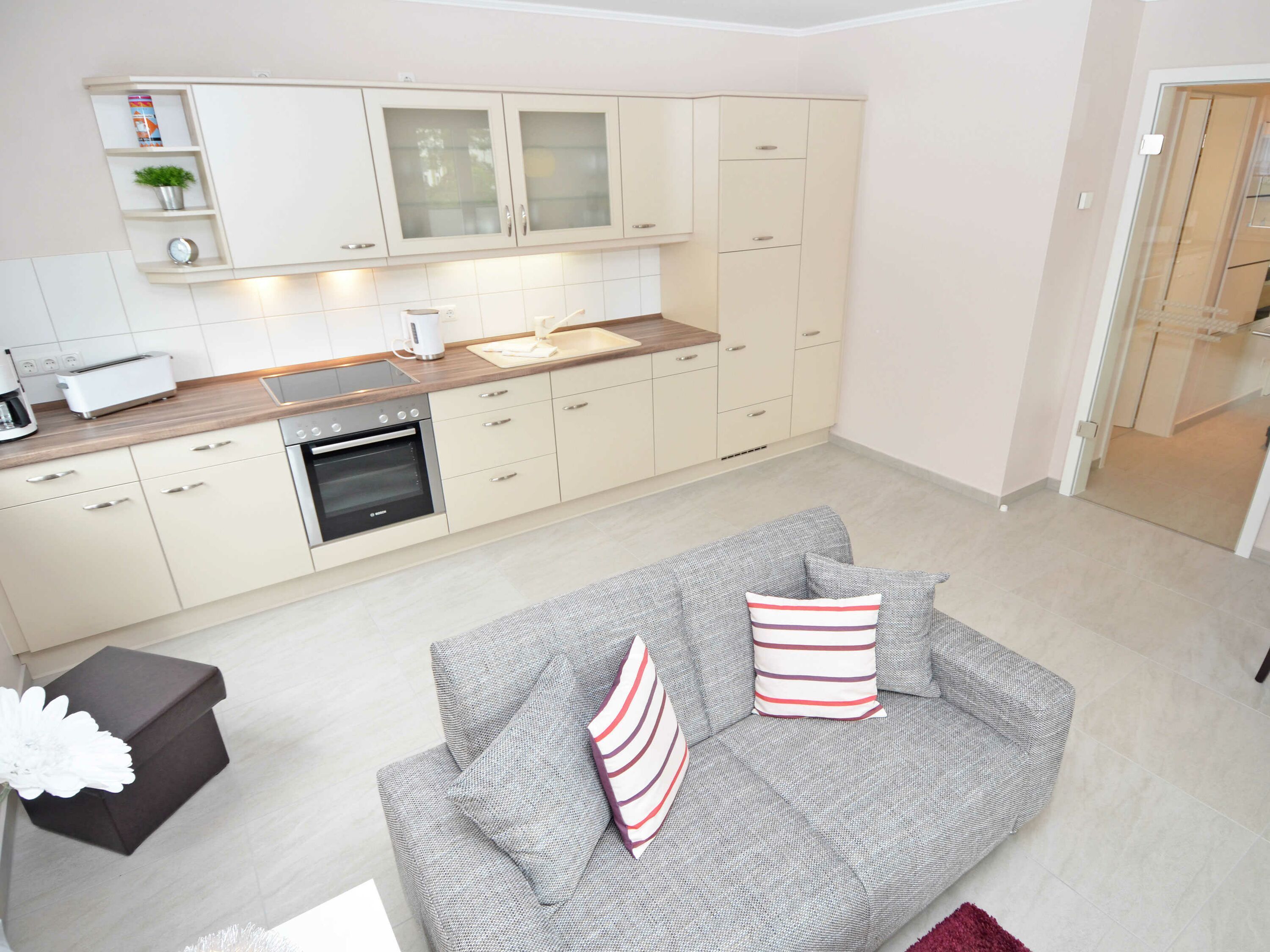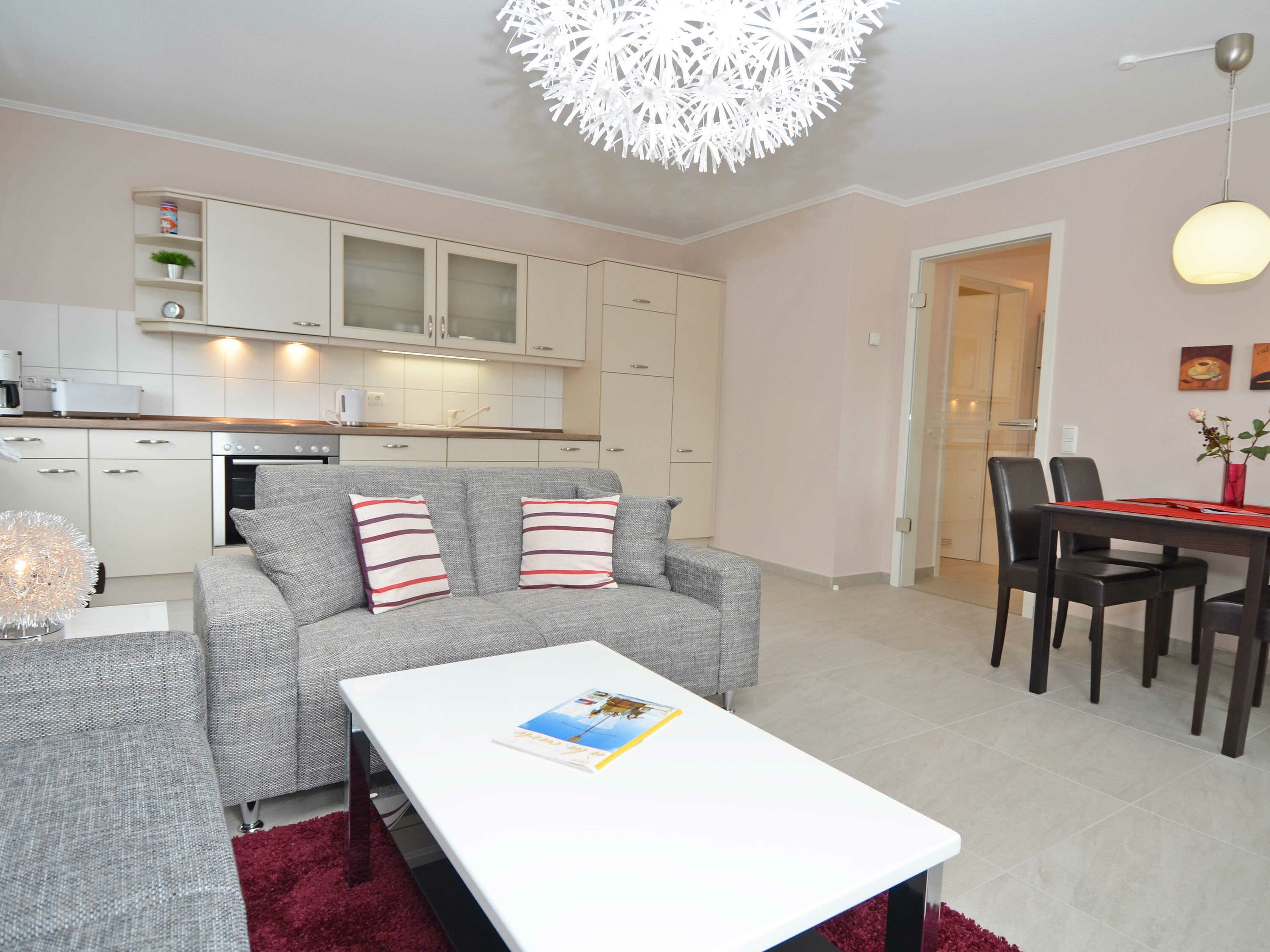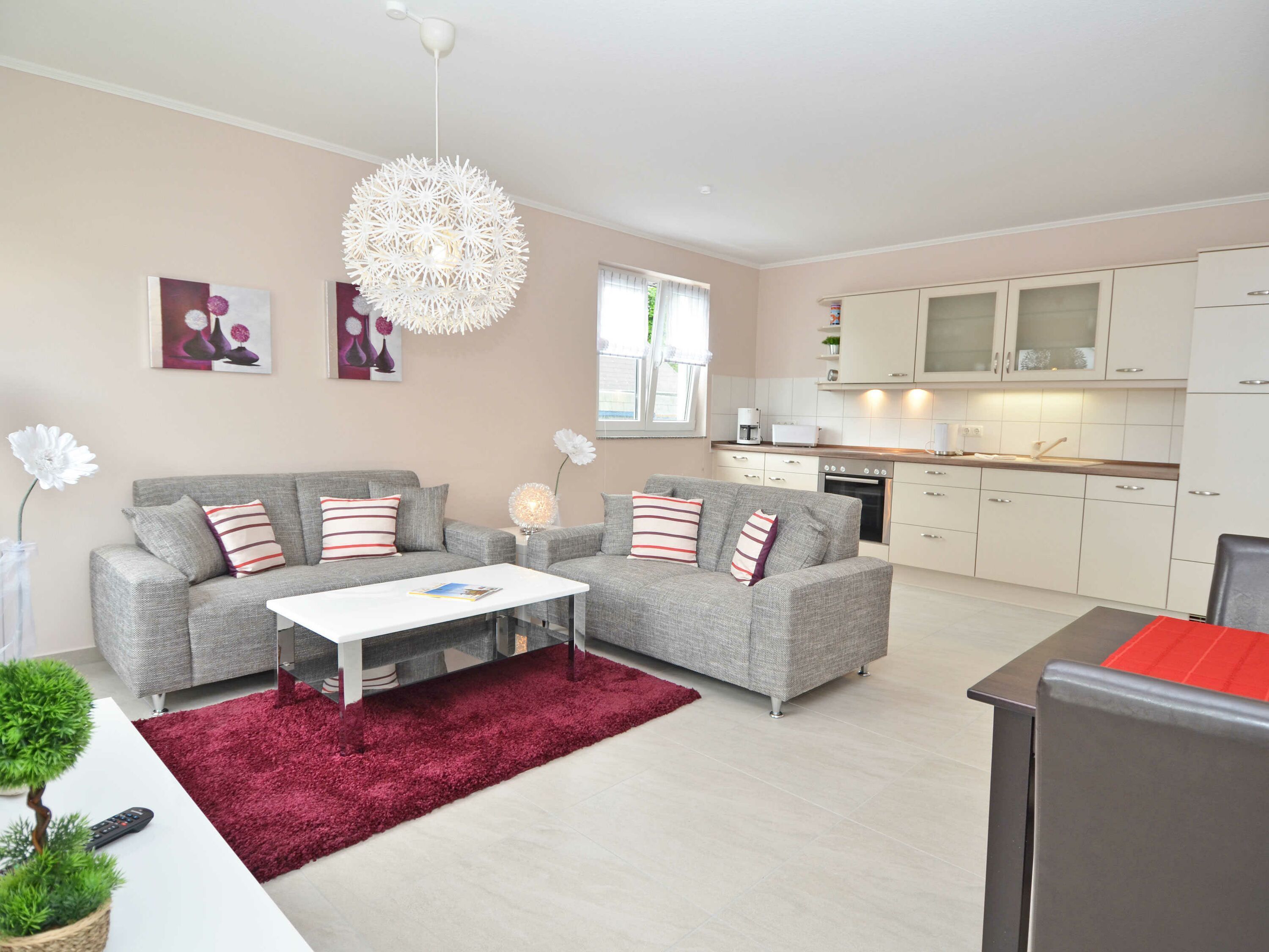 Vom Eingangsbereich aus betreten Sie den modern und sehr gemütlich ausgestatteten Wohnbereich, der mit zwei Couches, einem Flachbildfernseher und einem I-Pod-/Radio-Gerät zum Verweilen nach einem anregenden Tag einlädt. Die harmonisch im Wohnbereich integrierte Küchenzeile mit einem Herd mit Backofen, Spülmaschine, Mikrowelle, Kaffeemaschine, Toaster und diversem Kleininventar sowie ein Esstisch mit 4 Stühlen ermöglichen es Ihnen, Ihren Tag gemütlich bei Kaffee/Tee und Brötchen zu beginnen. Der nächste Bäcker ist ca. 5 Gehminuten entfernt!