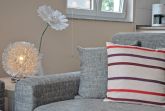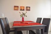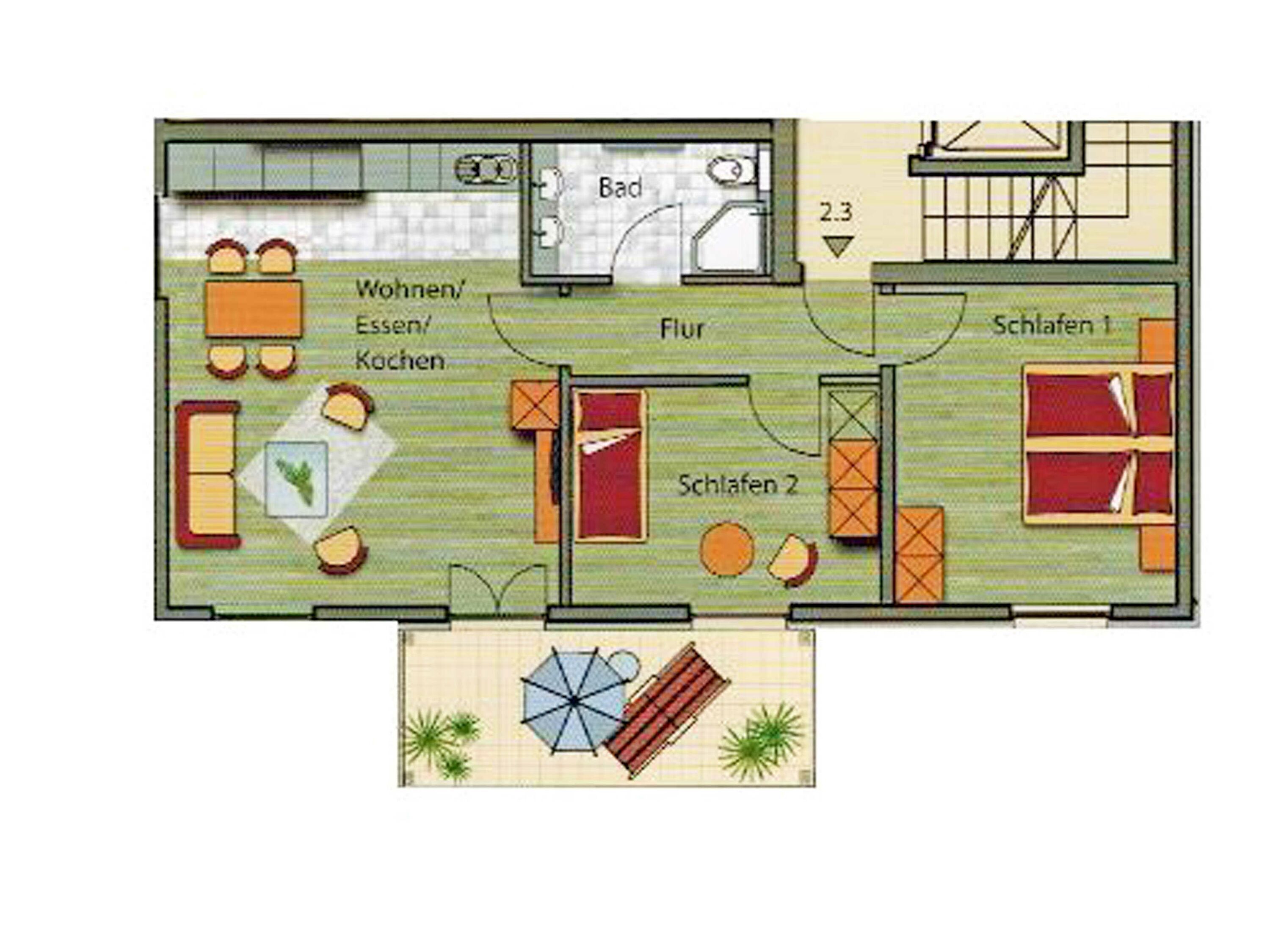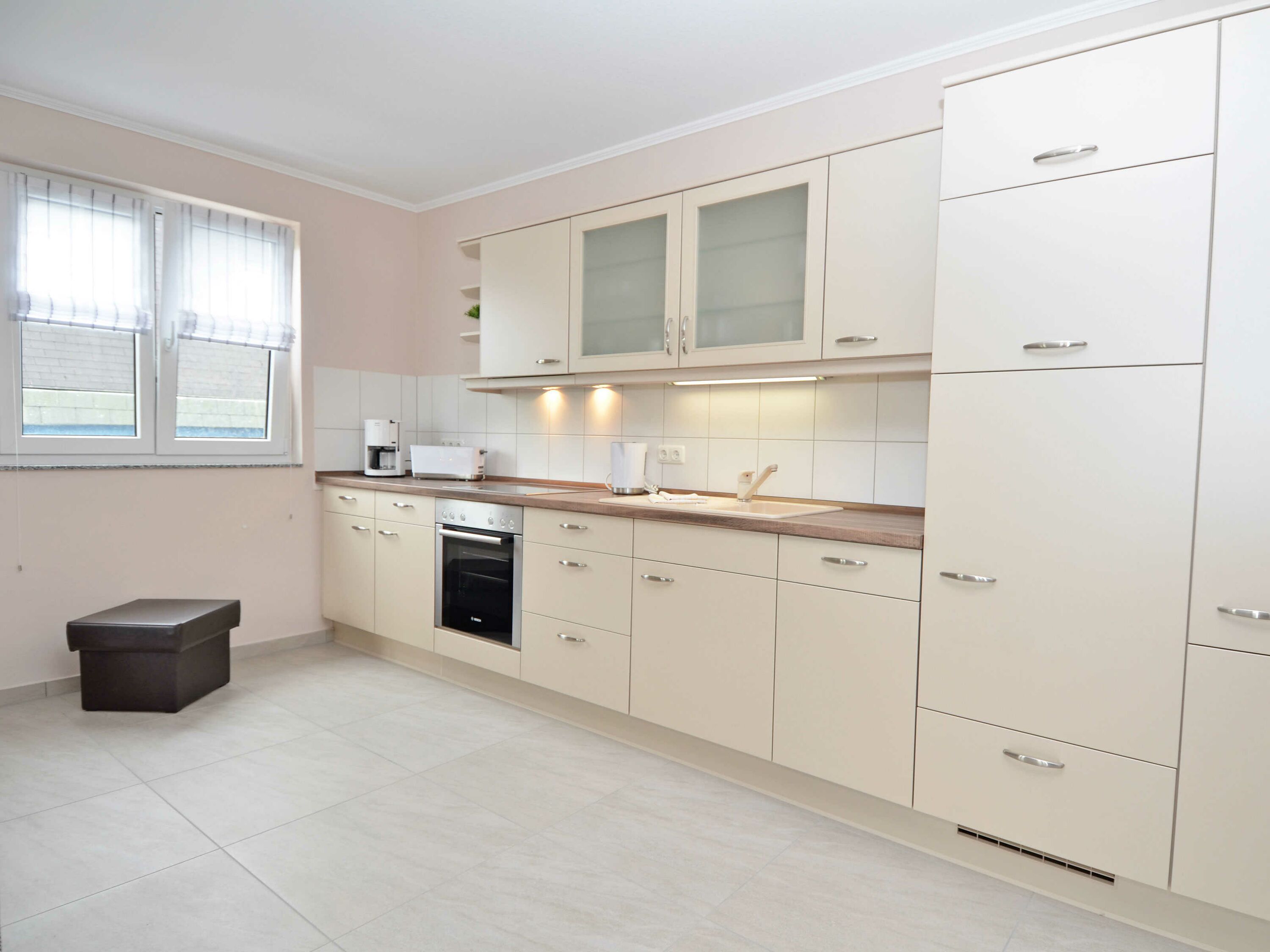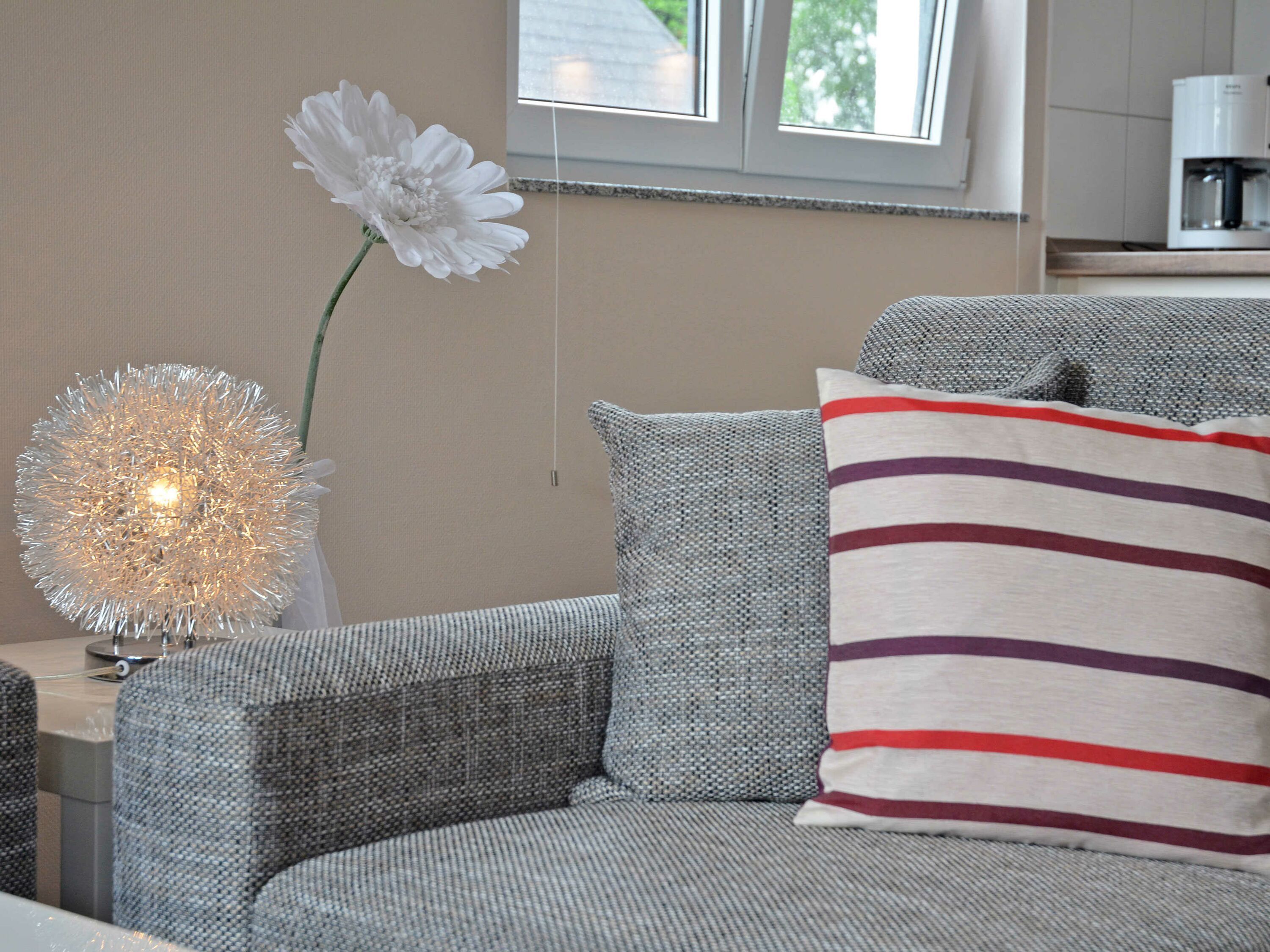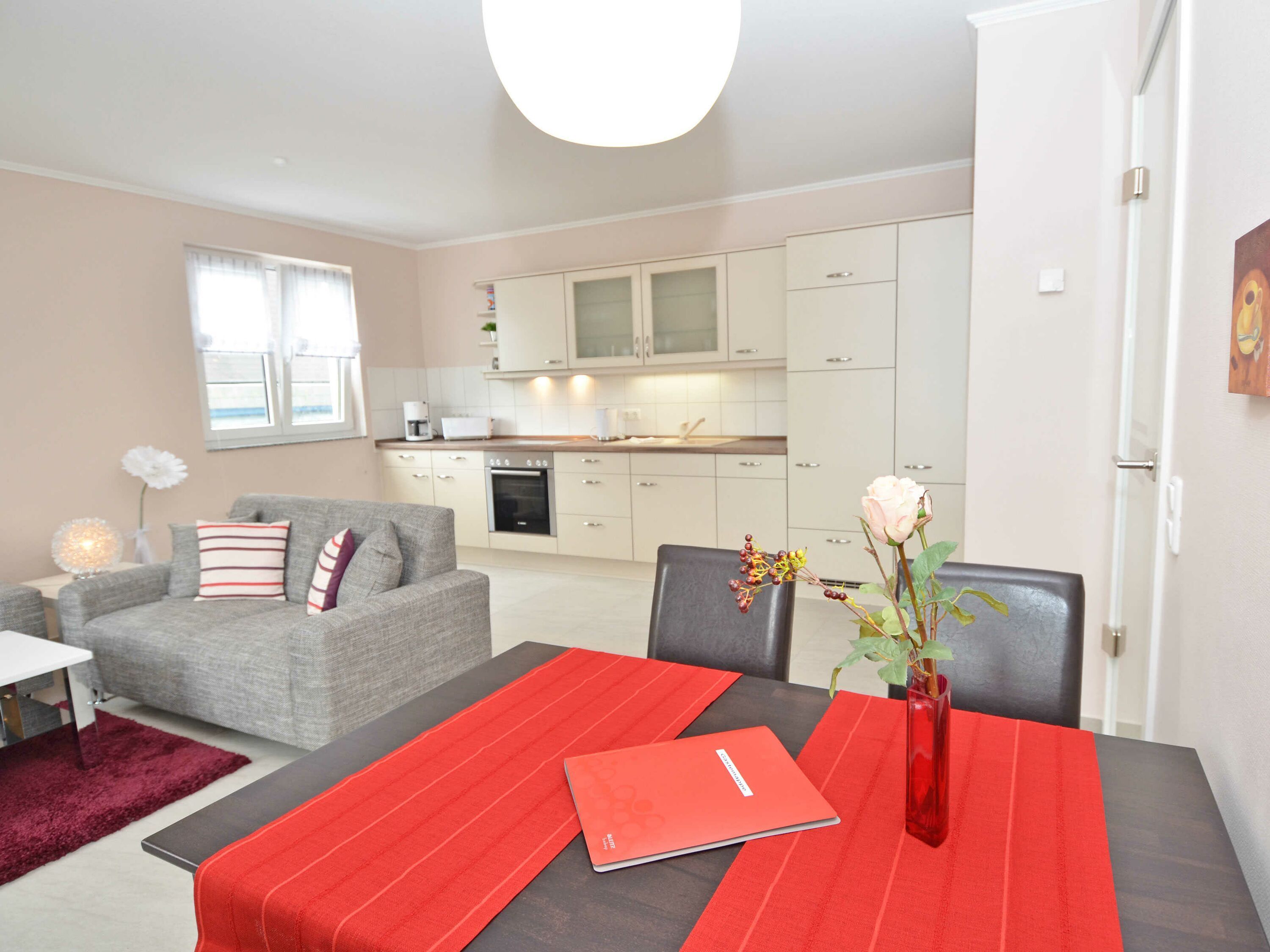 Vom Eingangsbereich aus betreten Sie den modern und sehr gemütlich ausgestatteten Wohnbereich, der mit zwei Couches, einem Flachbildfernseher und einem I-Pod-/Radio-Gerät zum Verweilen nach einem anregenden Tag einlädt. Die harmonisch im Wohnbereich integrierte Küchenzeile mit einem Herd mit Backofen, Spülmaschine, Mikrowelle, Kaffeemaschine, Toaster und diversem Kleininventar sowie ein Esstisch mit 4 Stühlen ermöglichen es Ihnen, Ihren Tag gemütlich bei Kaffee/Tee und Brötchen zu beginnen. Der nächste Bäcker ist ca. 5 Gehminuten entfernt!
