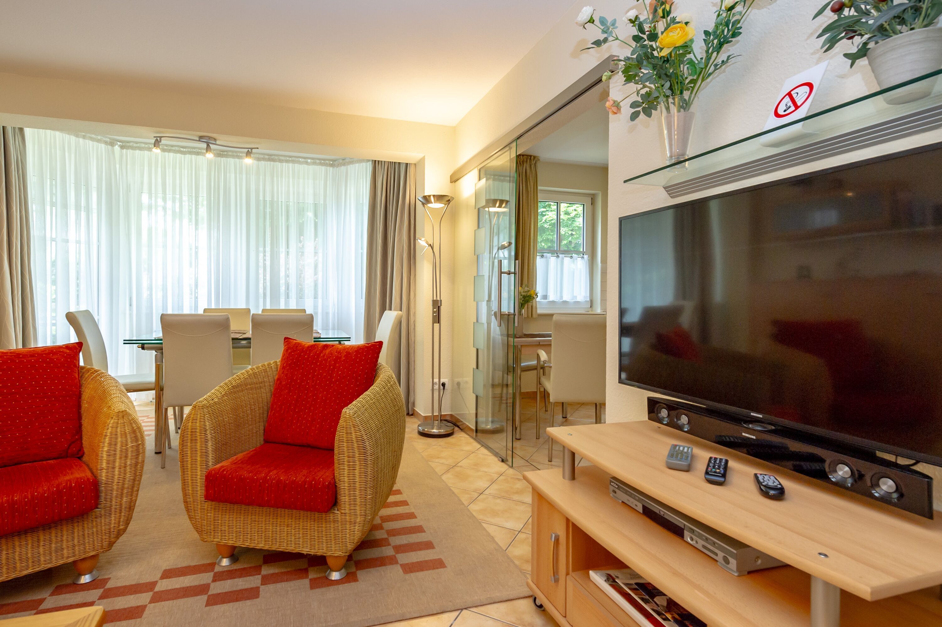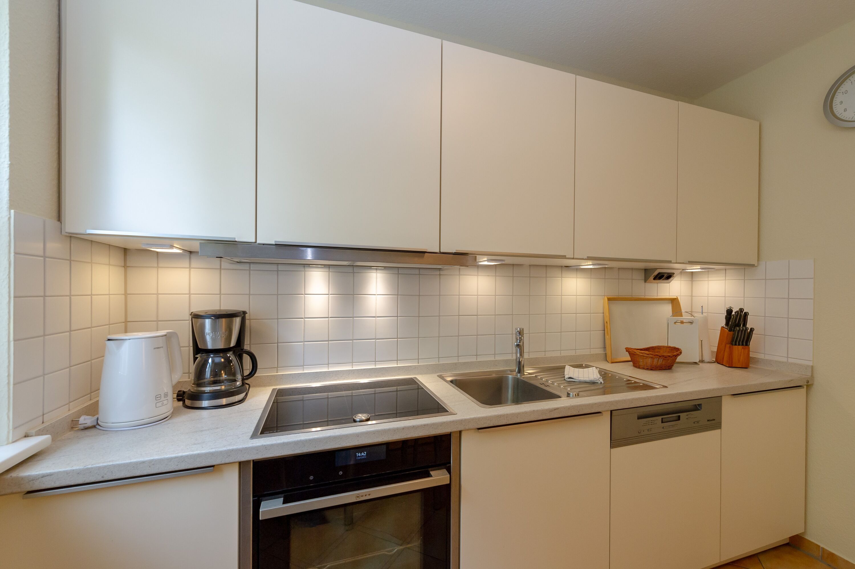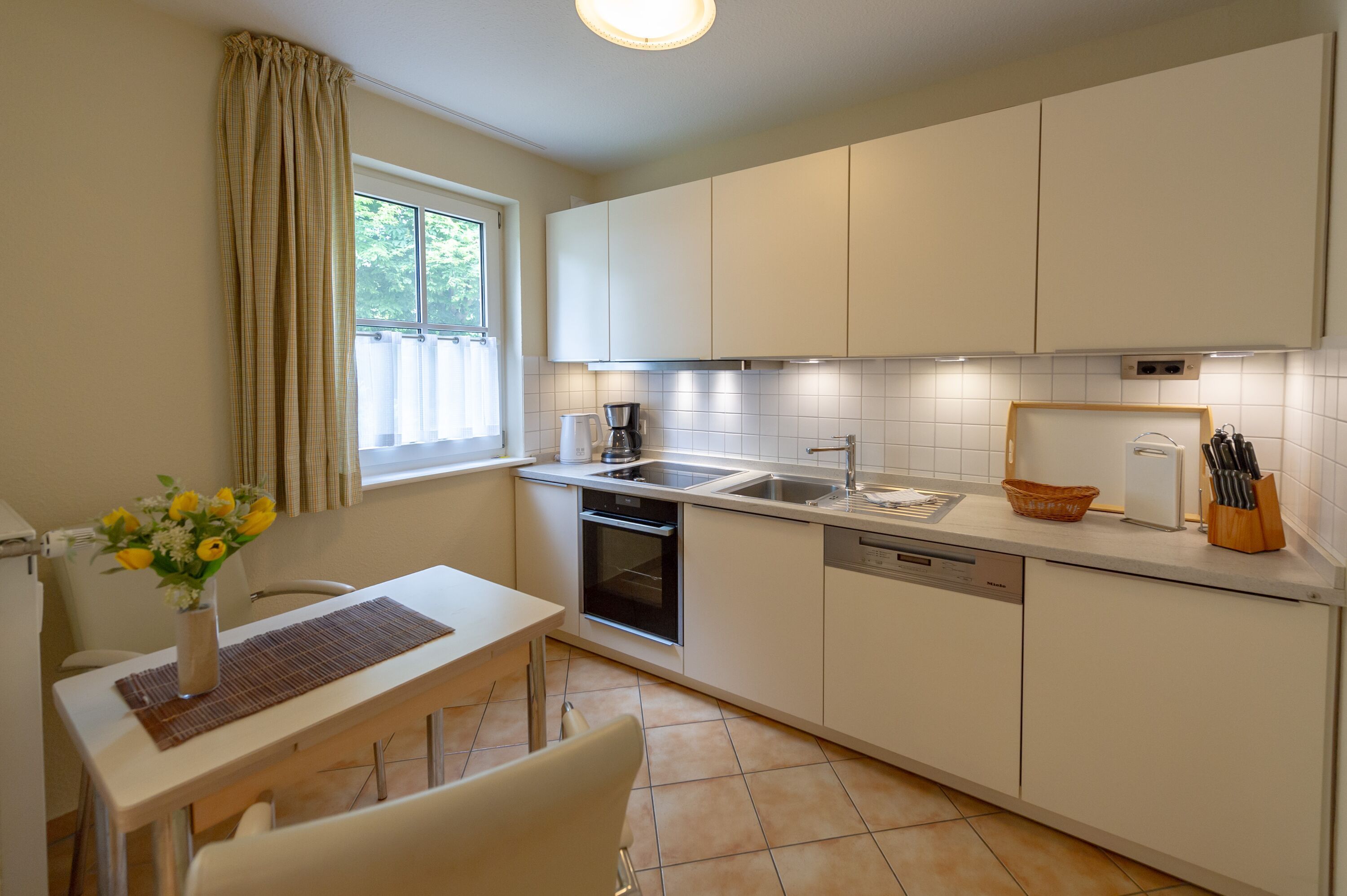 Das Wohnzimmer ist u.a. mit einem großen Flachbild-Fernseher, einer Stereoanlage mit CD-Player, einer Buchauswahl, einer ausklappbaren Schlafcouch für zwei Personen und einem zusätzlichen Schrankbett für eine Person möbliert. Die vom Wohnbereich optisch abgetrennte, sehr gut ausgestattete Küchenzeile enthält u.a. einen 4-Zonen-Ceranherd mit Backofen, eine Mikrowelle, einen Geschirrspüler sowie Kaffeemaschine, Wasserkocher und Toaster. Einen Bäcker für die frischen Frühstücksbrötchen und einen Supermarkt finden Sie direkt in Lauterbach.