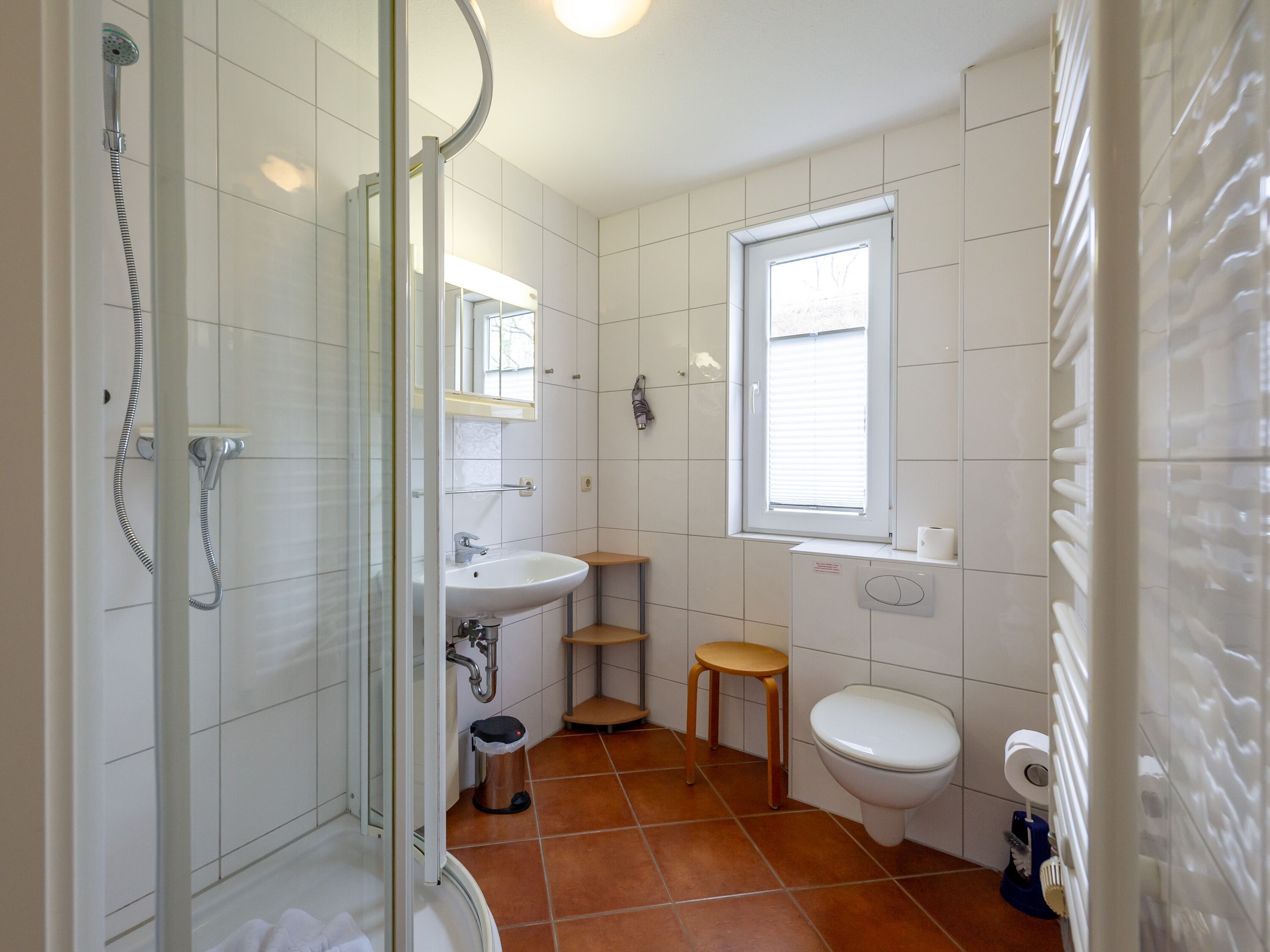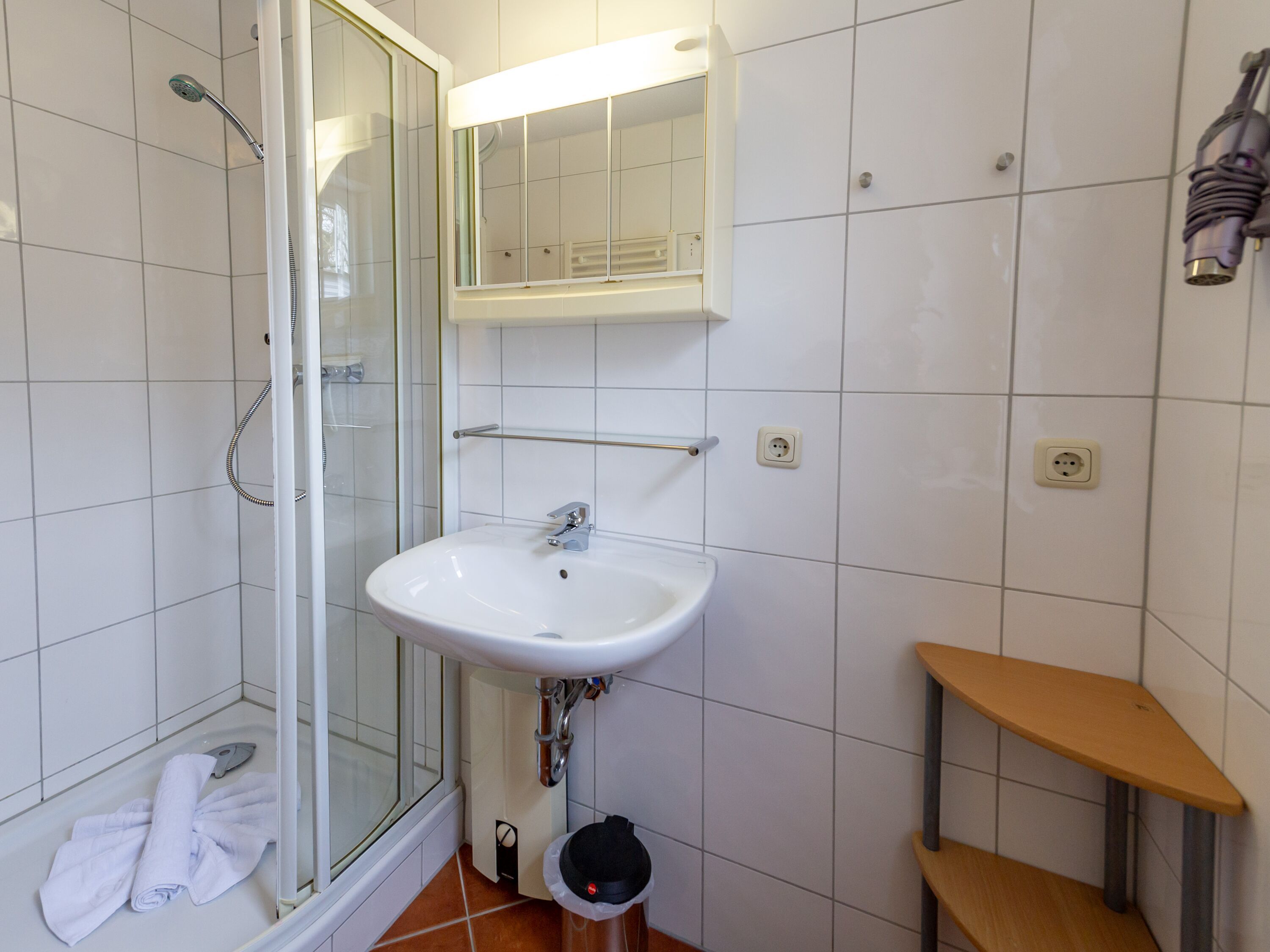 Das Tageslichtbad ist mit einem beleuchteten Waschtisch, Dusche/WC sowie einem beheizbaren Handtuchtrockner ausgestattet.