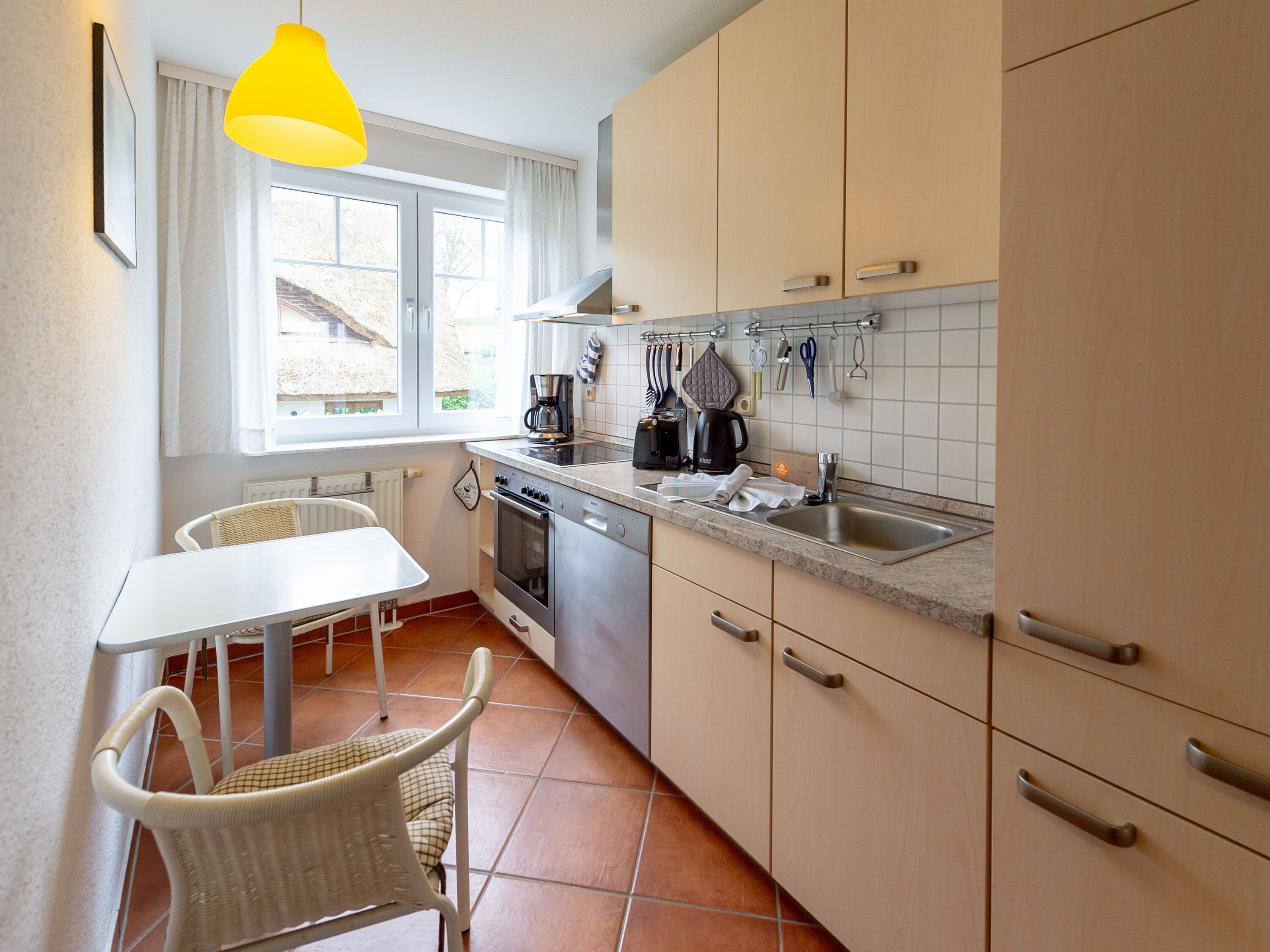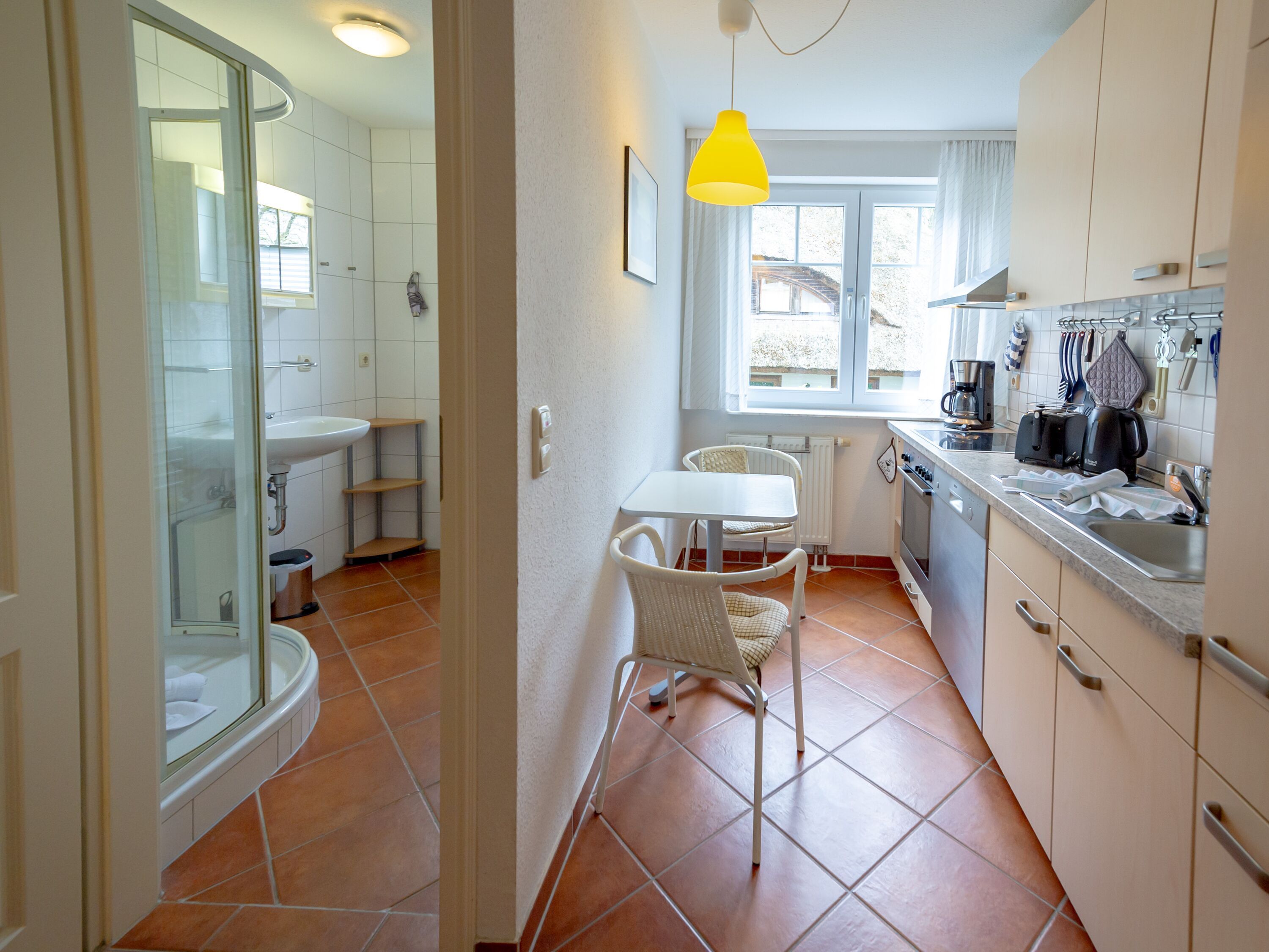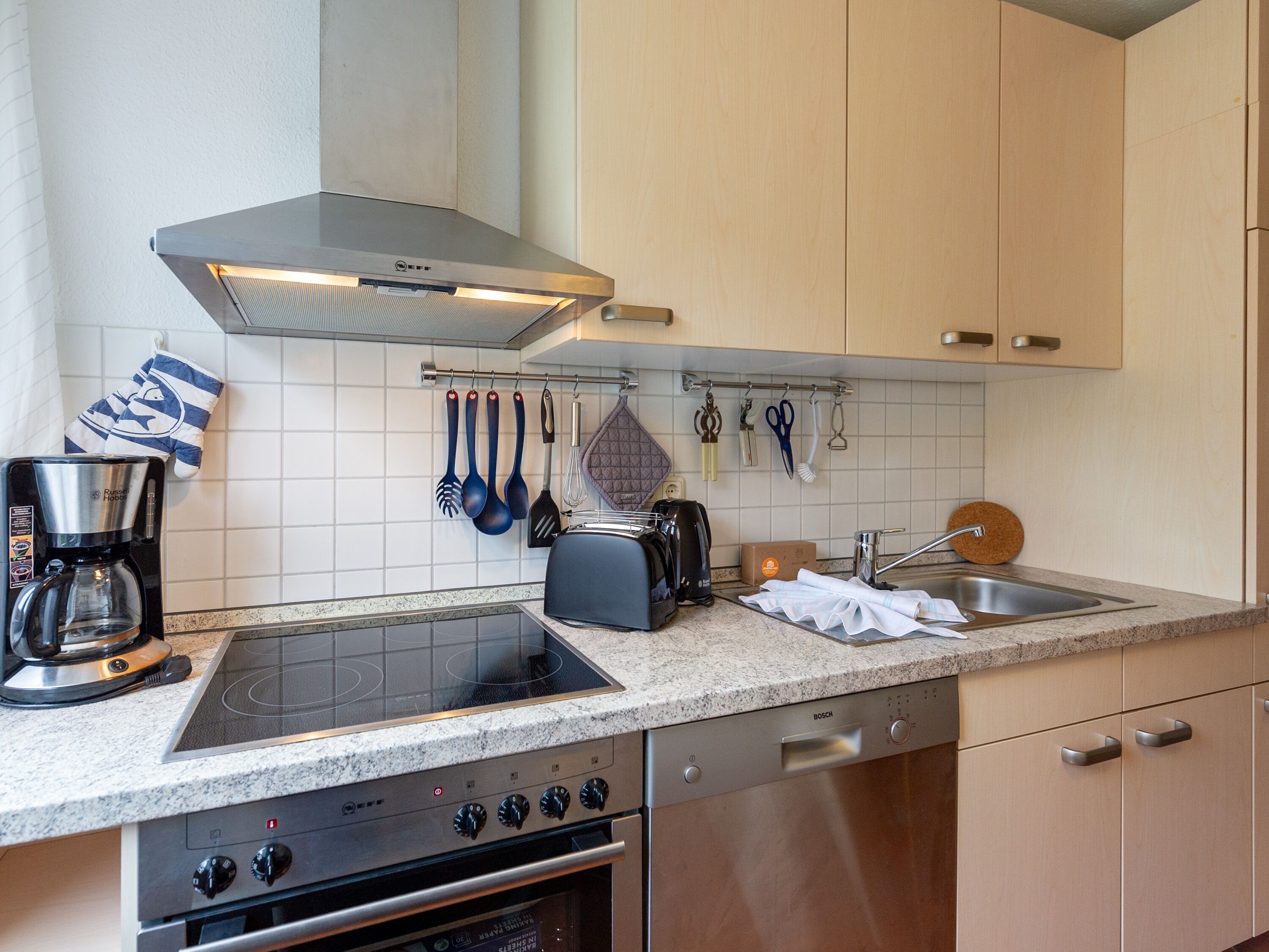 In der separaten Küche stehen Ihnen u.a. eine Spülmaschine, ein Kühlschrank mit Gefrierfach, ein 4-Platten-Cerankochfeld, ein Backofen und diverse Kleingeräte, die die Ausstattung komplettieren, zur Verfügung.