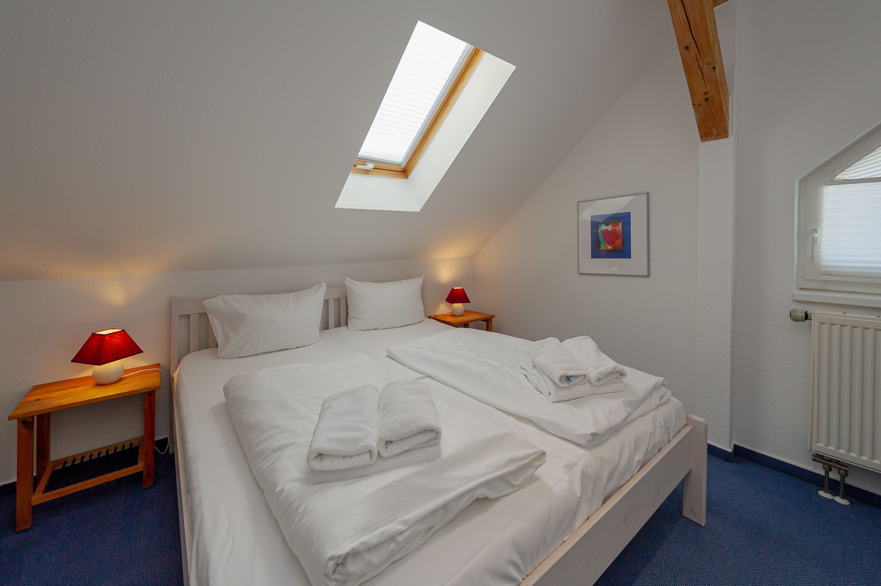 Das Schlafzimmer verfügt über ein bequemes Doppelbett (1,80 x 2,00 m) und ausreichend Stauraum für Kleidung. Zudem gibt es ein modernes Badezimmer mit Dusche/WC, Waschbecken, Spiegel und Fön.