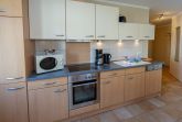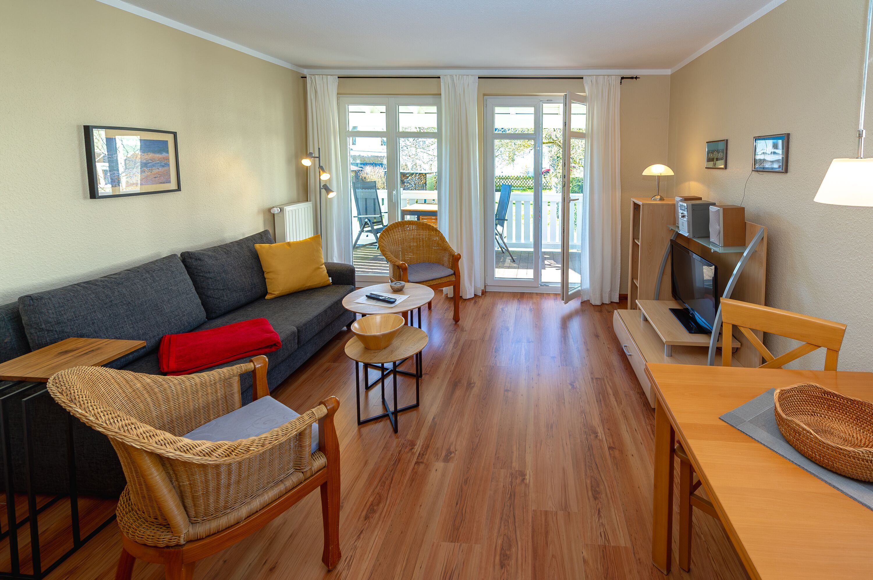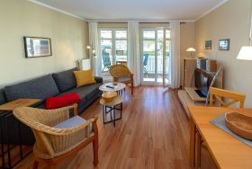 Der helle, freundliche Wohnraum ist mit einer bequemen Lederschlafcouch (Aufbettungsmöglichkeit für 2 Personen), zwei Korbsesseln, einem Flachbild-TV, einer Mini-Stereoanlage mit CD-Player und einem Esstisch ausgestattet. Die harmonisch in den Wohnbereich integrierte Küchenzeile ist ausgestattet mit einem Kühlschrank mit Gefrierfach, einem 4-Platten-Cerankochfeld, einem Backofen, einer Geschirrspülmaschine, einer Mikrowelle, Wasserkocher, Kaffeemaschine, Toaster und diversem Kleininventar, das die Küchenausstattung komplettiert.