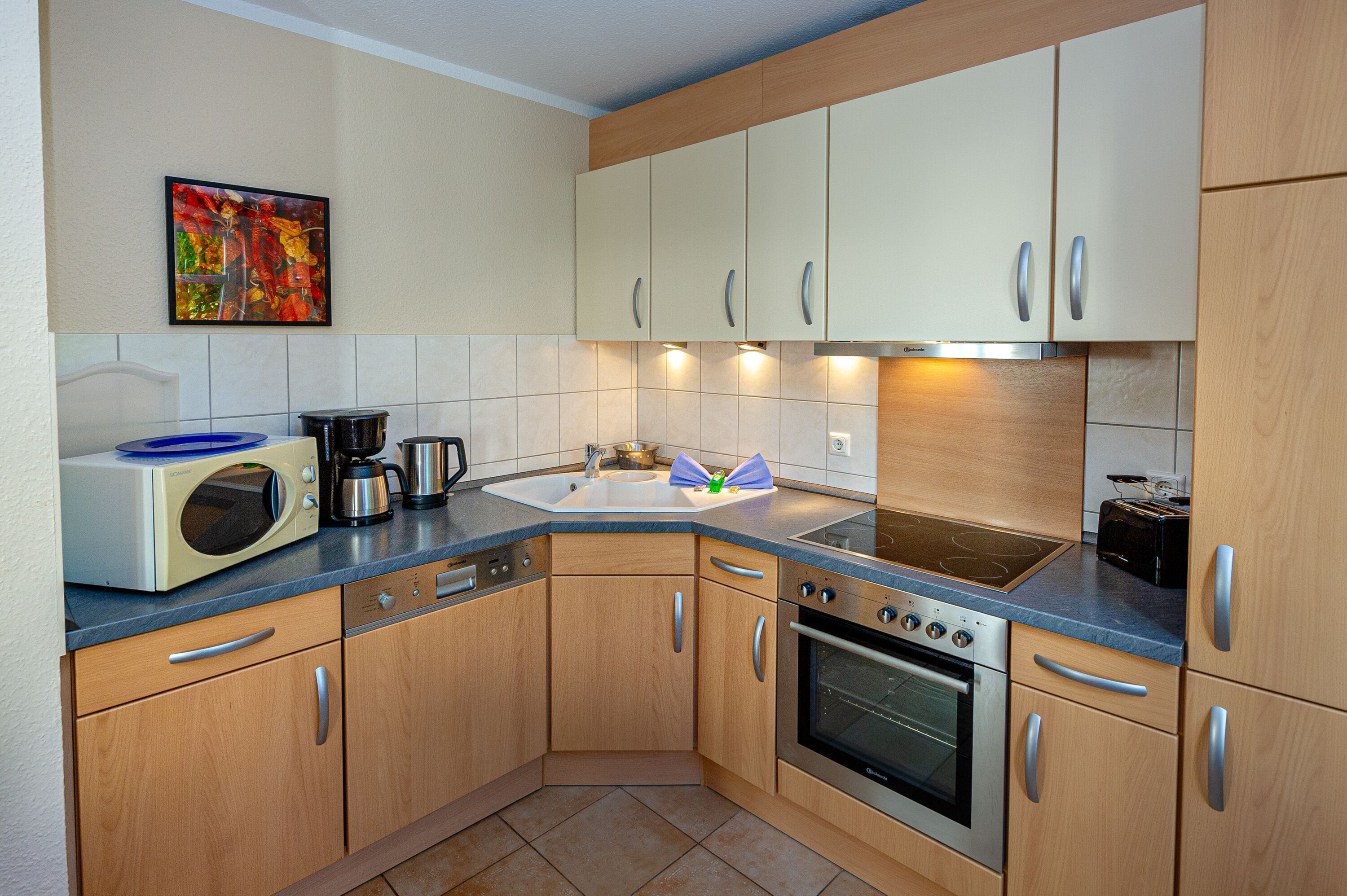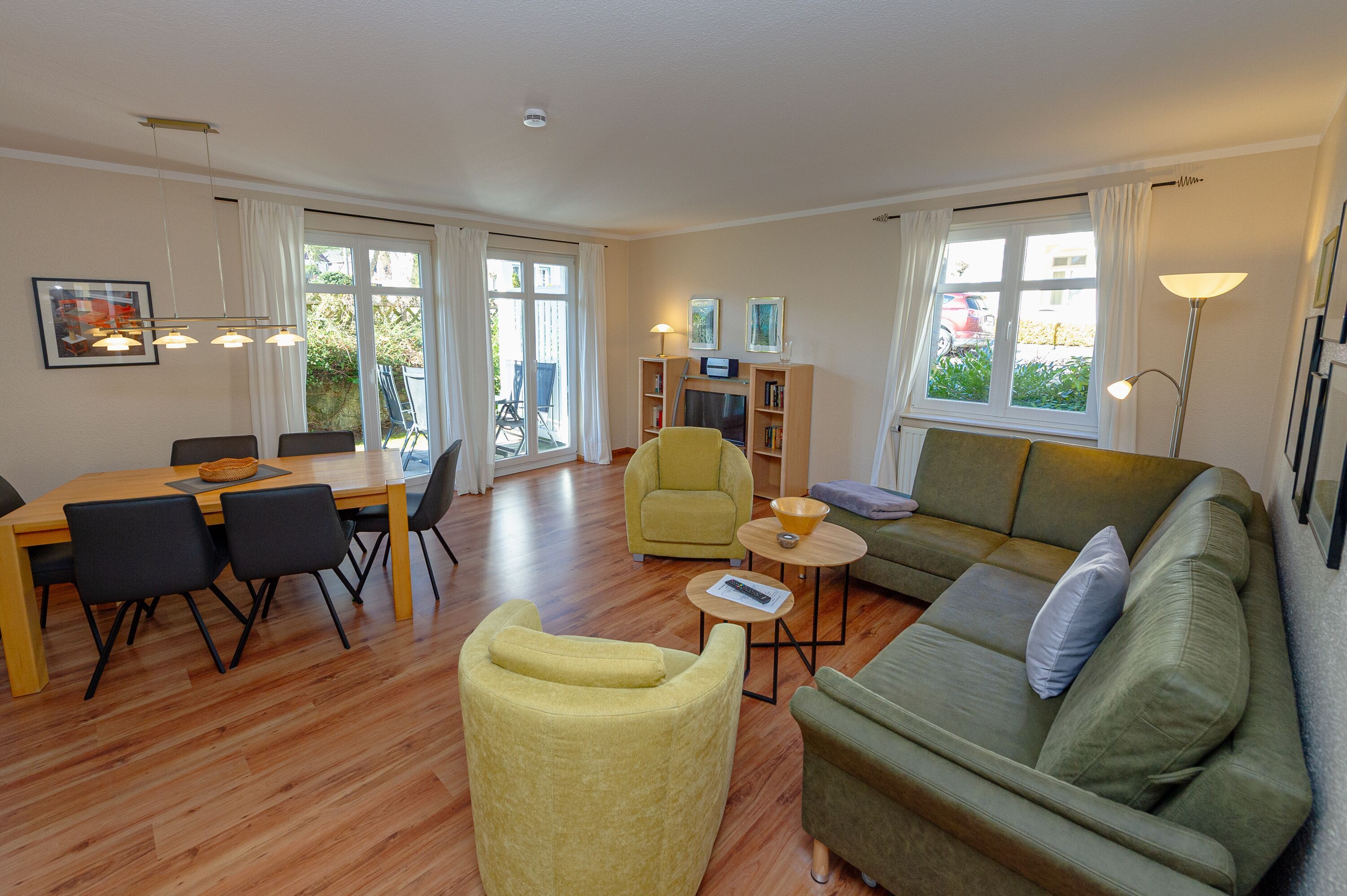 Der helle, freundliche Wohnraum ist mit einer bequemen Lederschlafcouch (die als Aufbettung für 2 Personen genutzt werden kann), zwei Sesseln und zwei Korbsesseln, einem Flachbild-TV, einer Mini-Stereoanlage mit CD-Player und einem Esstisch ausgestattet. Die harmonisch im Wohnbereich integrierte Küchenzeile ist ausgestattet mit einem Kühlschrank mit Gefrierfach, einem 4-Platten-Cerankochfeld, einem Backofen, einer Geschirrspülmaschine, einer Mikrowelle, Wasserkocher, Kaffeemaschine, Toaster und diversem Kleininventar, das die Küchenausstattung komplettiert.