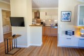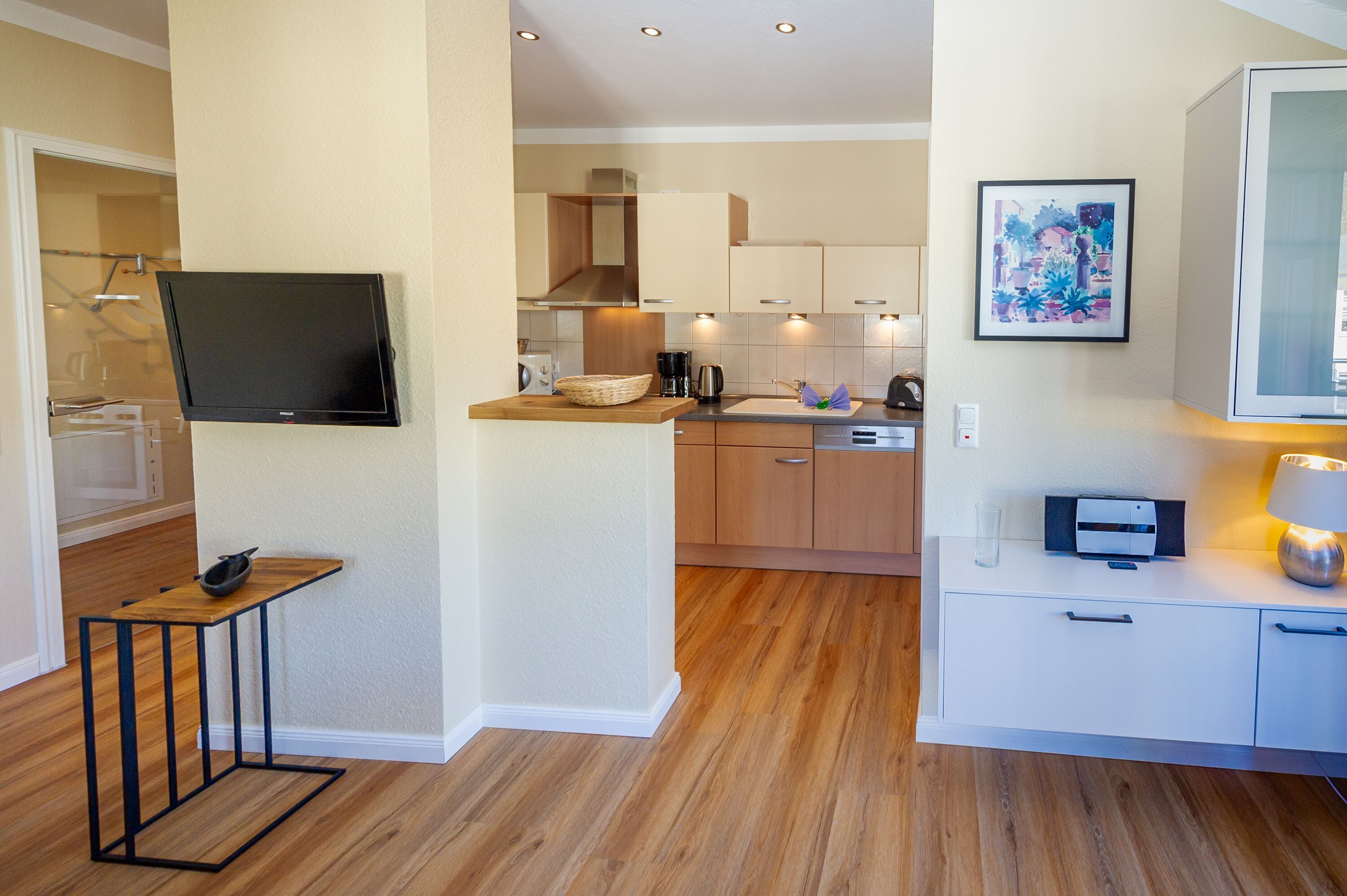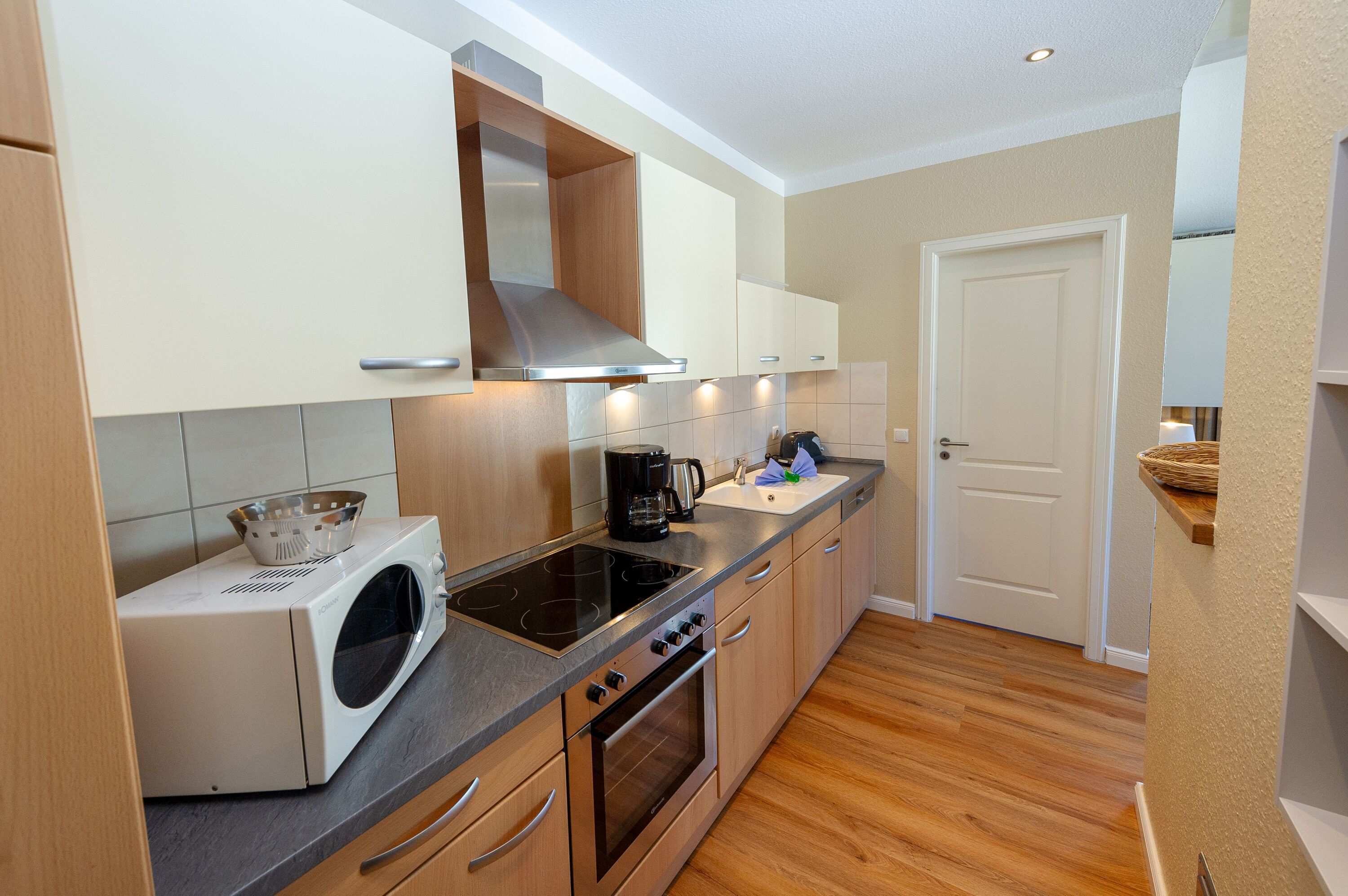 Die harmonisch in den Wohnbereich integrierte Küchenzeile verfügt über einen Kühlschrank mit Gefrierfach, ein 4-Platten-Cerankochfeld, einen Backofen, eine Geschirrspülmaschine, eine Mikrowelle, Wasserkocher, Kaffeemaschine, Toaster und diverses Kleininventar, so dass Sie sich bequem selbst bekochen können.