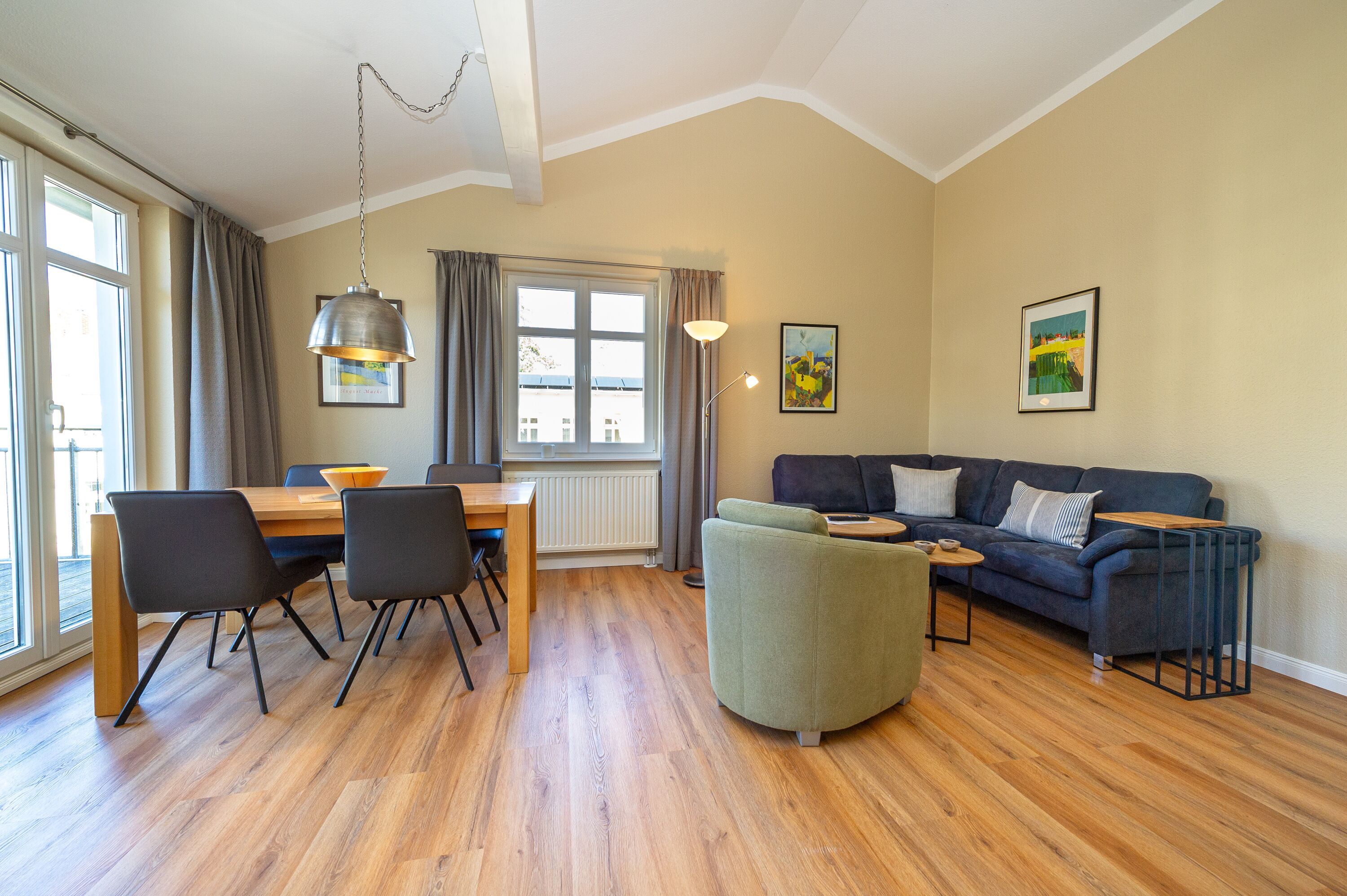Appartement 20 Seestern: Dieses sehr schöne 3-Raum-Appartement mit einer Wohnfläche von ca. 72 m² erwartet Sie im Dachgeschoss des hinteren Hauses und bietet Ihnen eine große möblierte Dachterrasse zur sonnigen Süd-West-Seite.