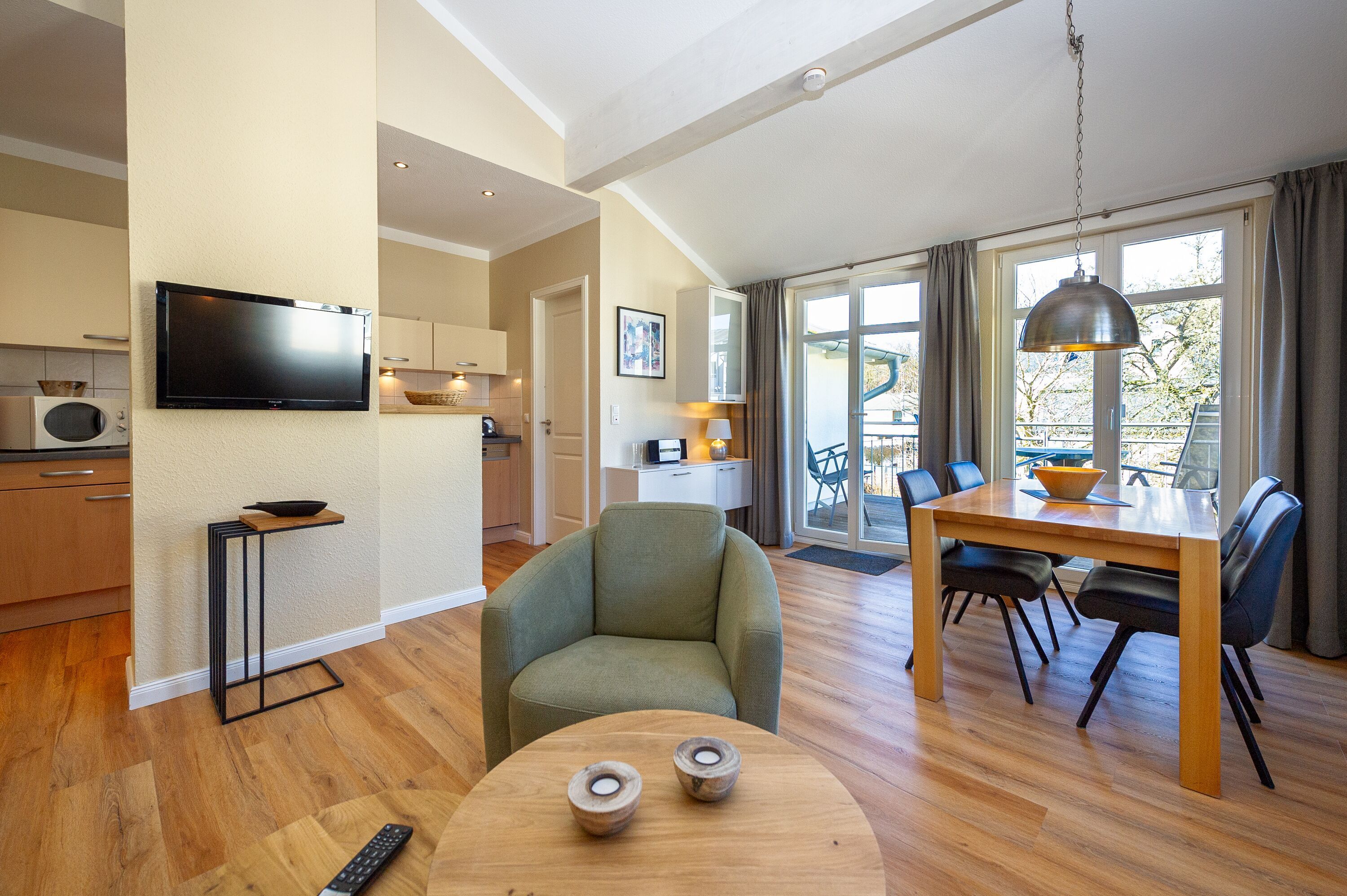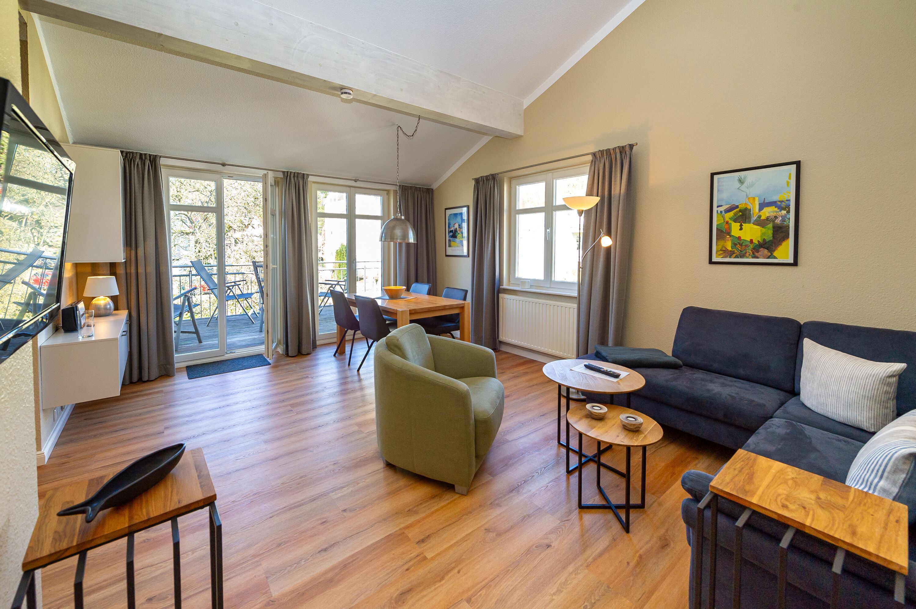 Der helle, freundliche Wohnraum ist mit einer bequemen Couch, zwei Sesseln, zwei Korbsesseln, einem Flachbild-TV, einer Mini-Stereoanlage mit CD-Player und einem Esstisch ausgestattet. Die leichten Dachschrägen mit den offenen Balken vermitteln eine besondere Gemütlichkeit.