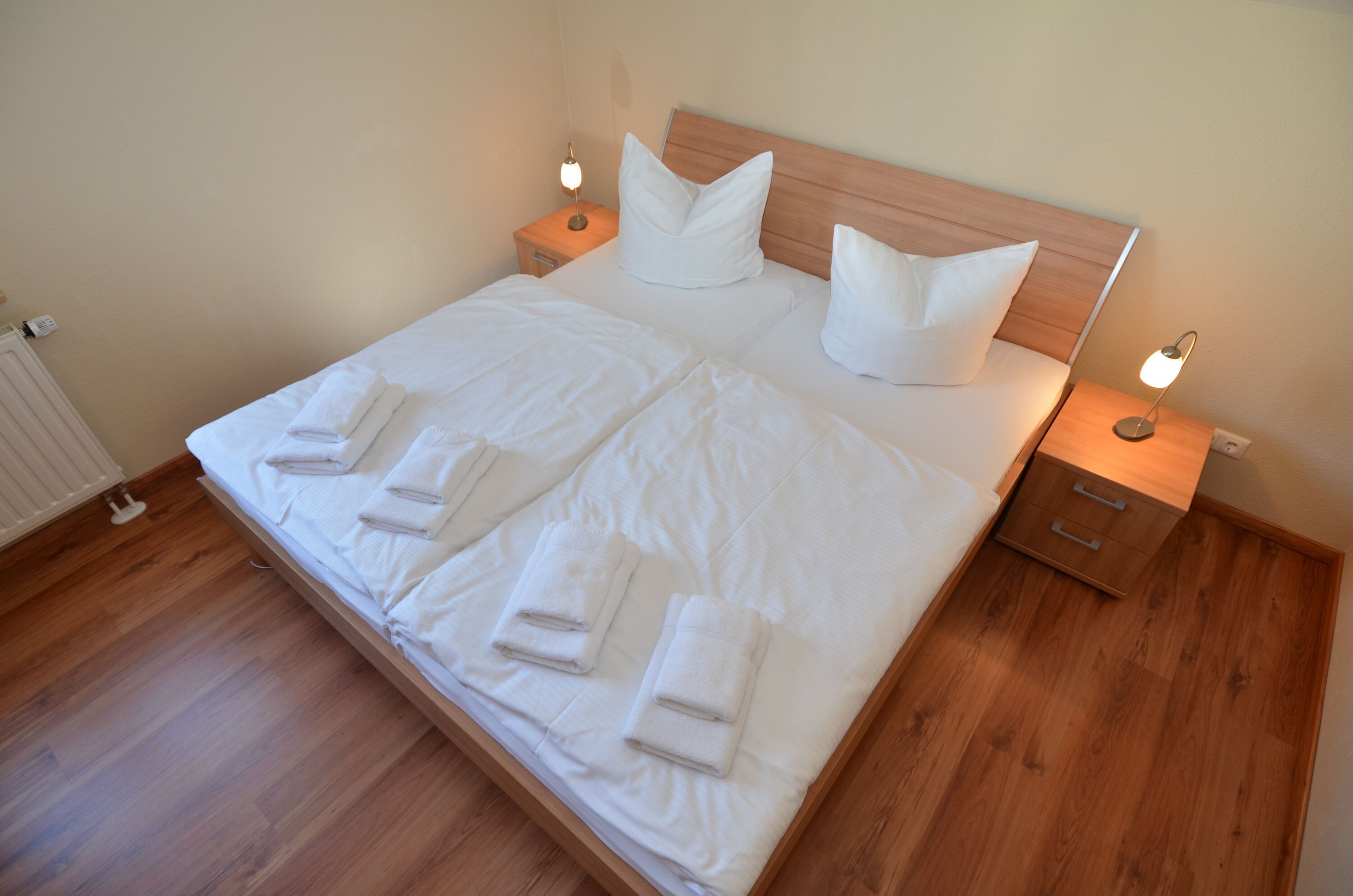 Zwei Schlafzimmer mit jeweils einem bequemen Doppelbett und ausreichend Platz für Ihre Garderobe sowie ein modernes Badezimmer mit Dusche/WC, einem beleuchtetem Waschtisch und einem Haartrockner komplettieren Ihr Zuhause auf Zeit.