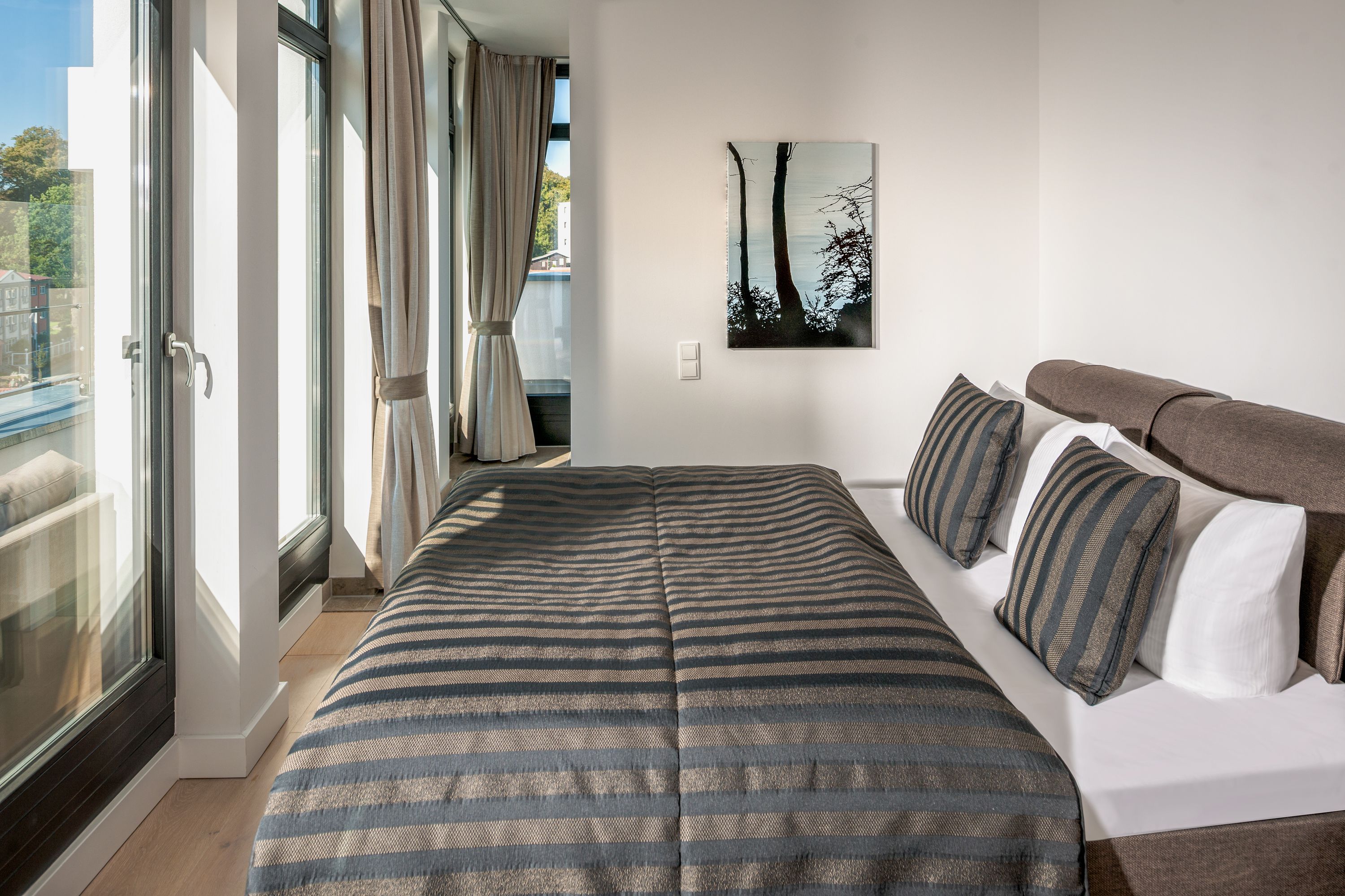 Der großzügige Masterbedroom bietet mit seinen ca. 40 qm ausreichend Platz für entspannte Wohlfühlmomente und phantasievolle Träume. Auf trennende Wände wurde in diesem Raum weitestgehend verzichtet, um ein Gefühl der Ungezwungenheit und Leichtigkeit zu vermitteln. So befinden sich hier nicht nur ein kuscheliges Doppelbett und ein eigener TV, sondern auch eine in den Raum integrierte, formschöne Badewanne, aus der Sie den Blick in die Ferne schweifen lassen können. Auch hier ermöglichen die im gesamtem Penthouse vorhandenen bodentiefen Fenster eine spektakuläre Sicht auf den Selliner See.