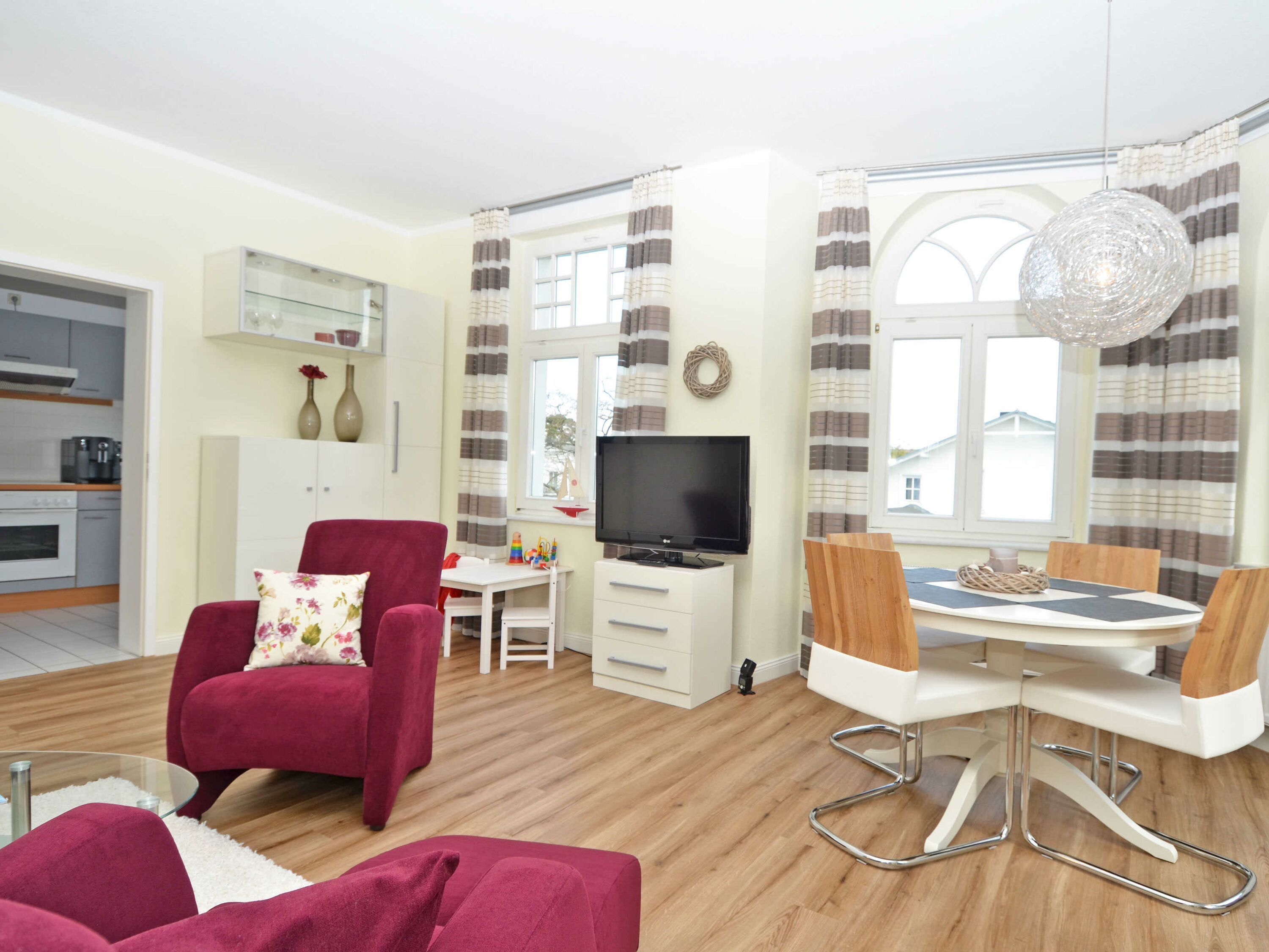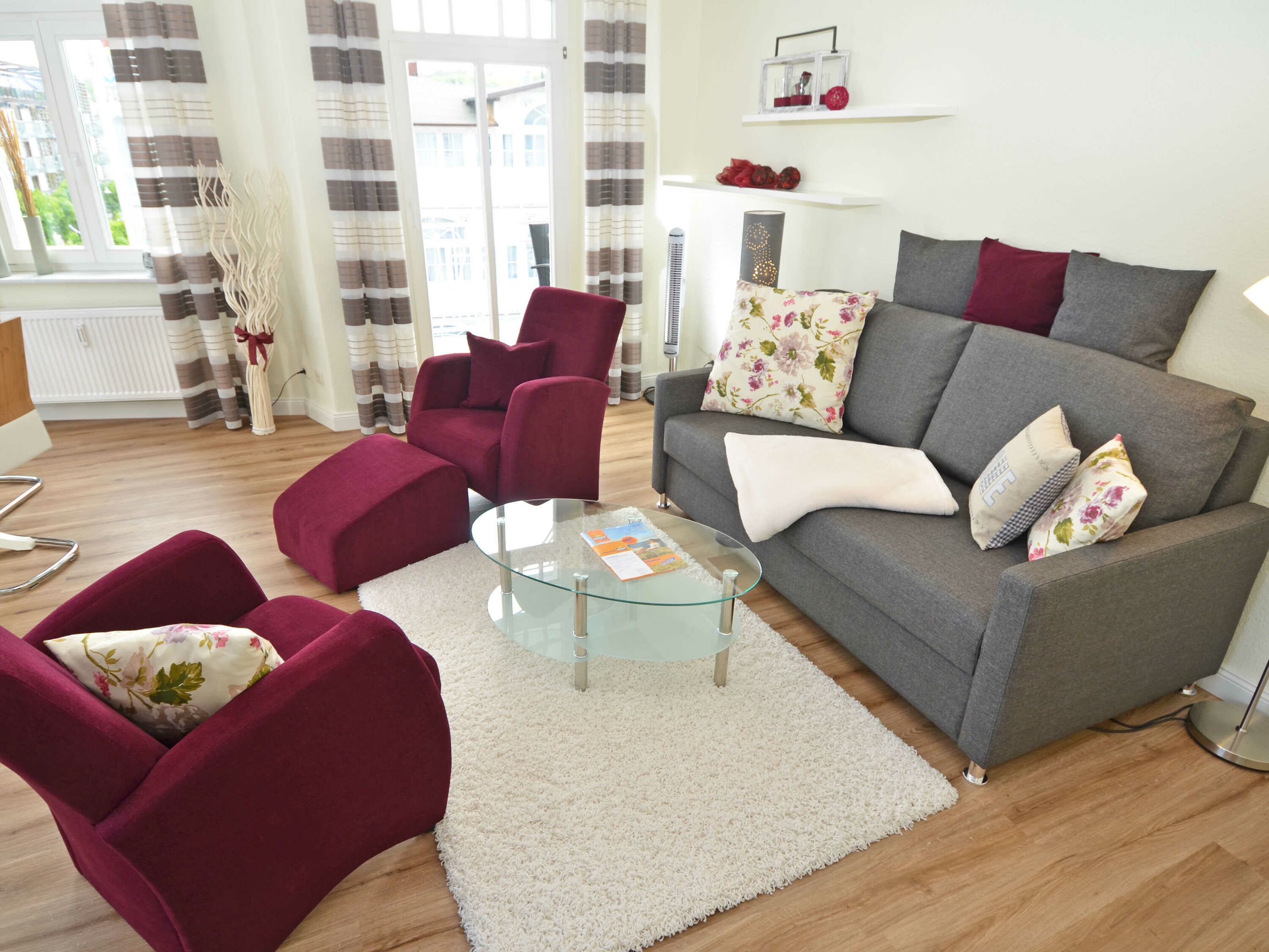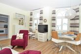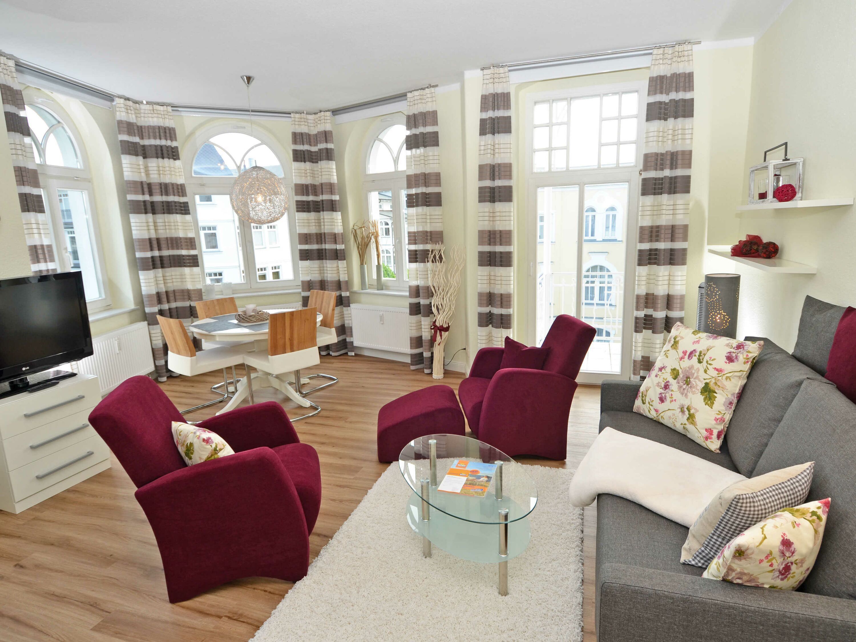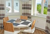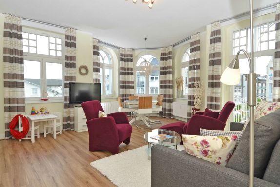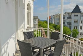 Der helle, freundliche Wohnraum ist mit einer bequemen Sitzgarnitur mit komfortabler Schlaf- & Relaxfunktion sowie einem Flachbild-TV, einer Mini-Stereoanlage mit CD-Player und einem kostenlosen WLAN-Zugang ausgestattet. Vom Wohnbereich geht es direkt auf den breiten Balkon mit Meerblick und einem Terrassenheizstrahler. Von hier aus können Sie dem bunten Treiben auf dem Weg zum Strand zusehen. Auch von der Essecke im Erker hat man einen phantastischen Blick auf die Ostsee.