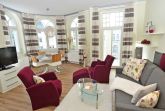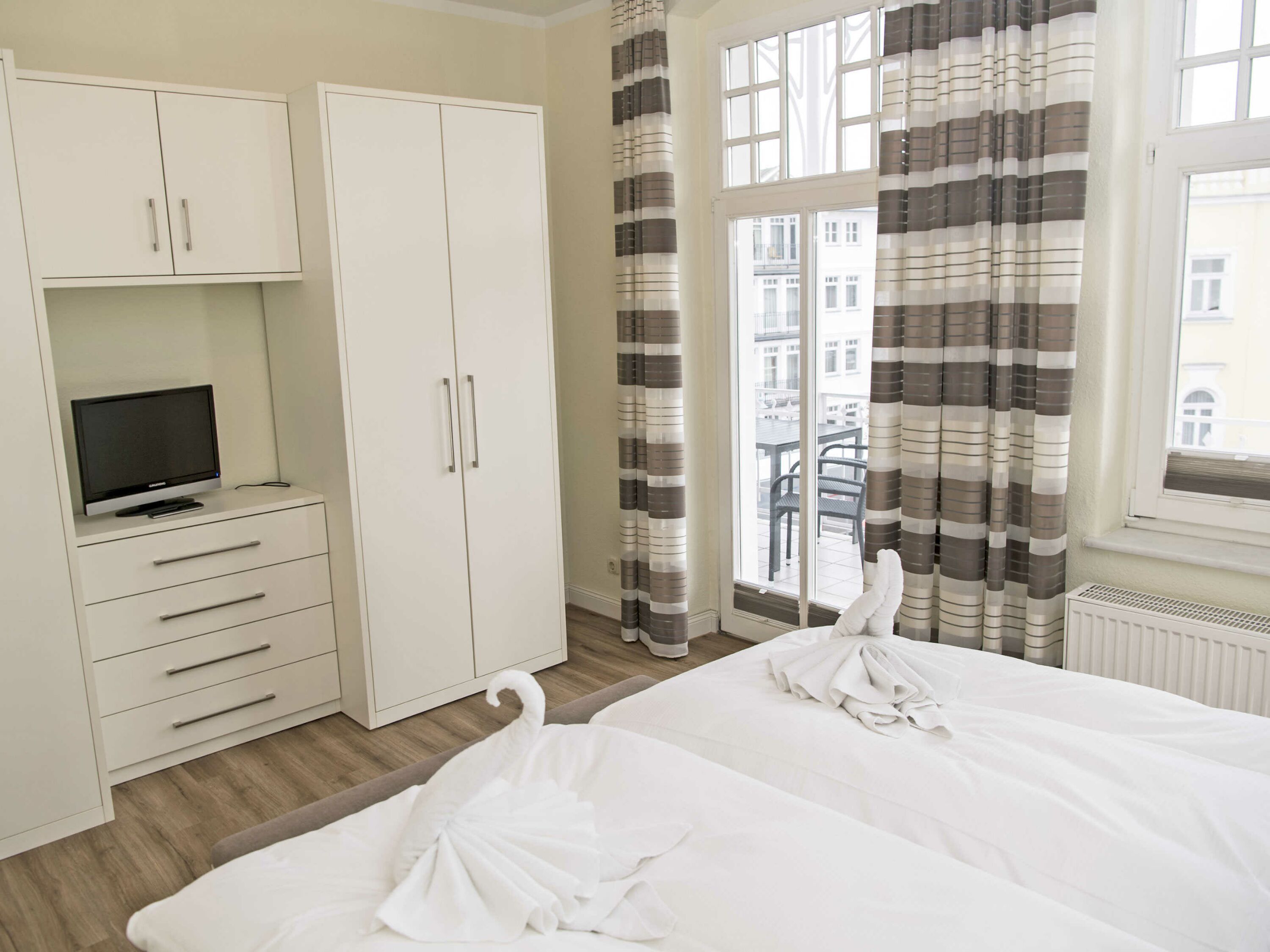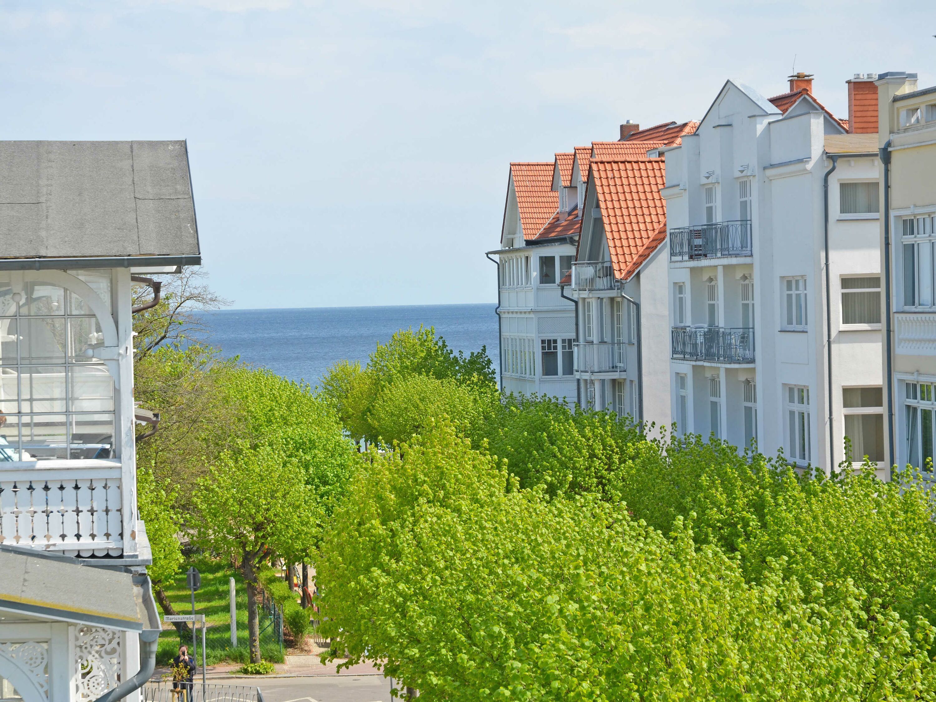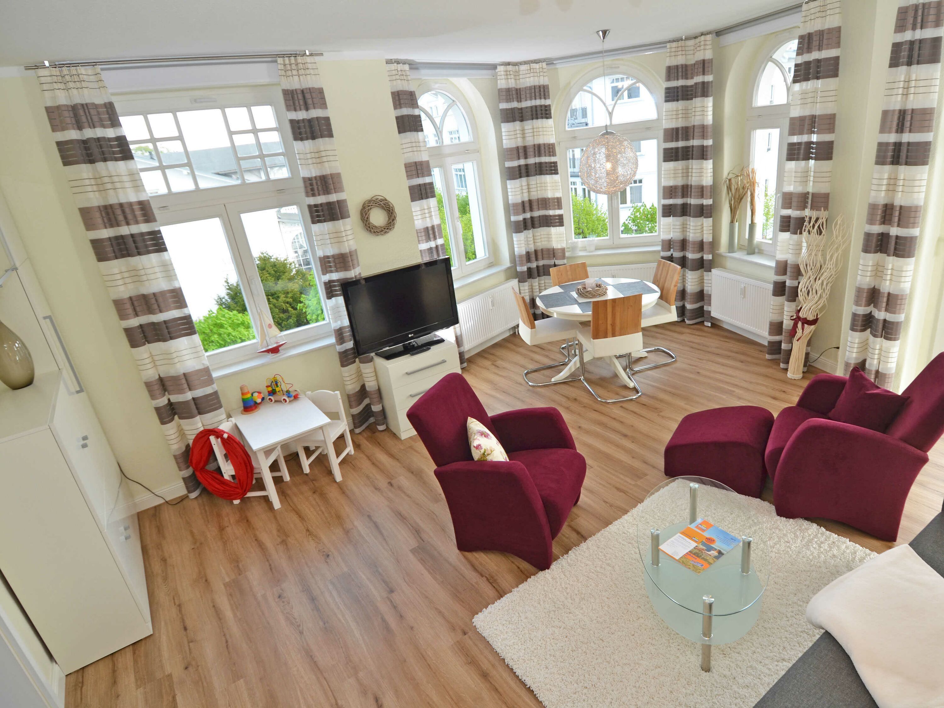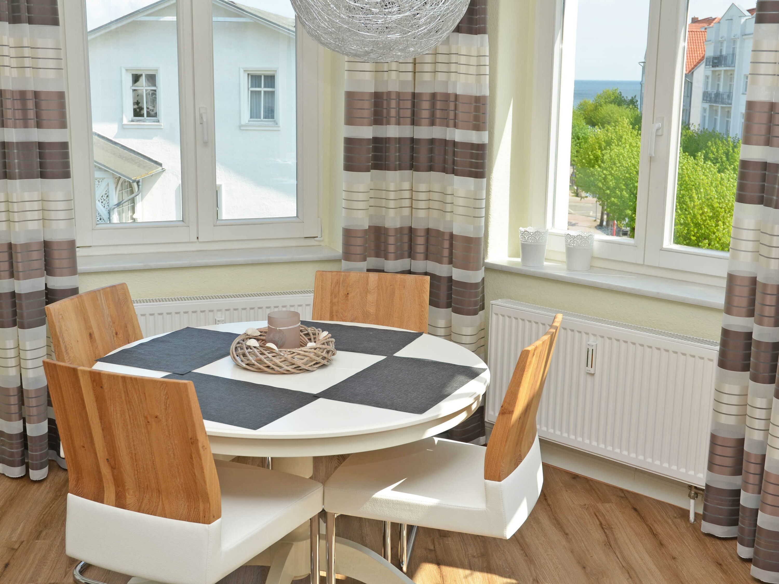 Der helle, freundliche Wohnraum ist mit einer bequemen Sitzgarnitur mit komfortabler Schlaf- & Relaxfunktion sowie einem Flachbild-TV, einer Mini-Stereoanlage mit CD-Player und einem kostenlosen WLAN-Zugang ausgestattet. Vom Wohnbereich geht es direkt auf den breiten Balkon mit Meerblick und einem Terrassenheizstrahler. Von hier aus können Sie dem bunten Treiben auf dem Weg zum Strand zusehen. Auch von der Essecke im Erker hat man einen phantastischen Blick auf die Ostsee.