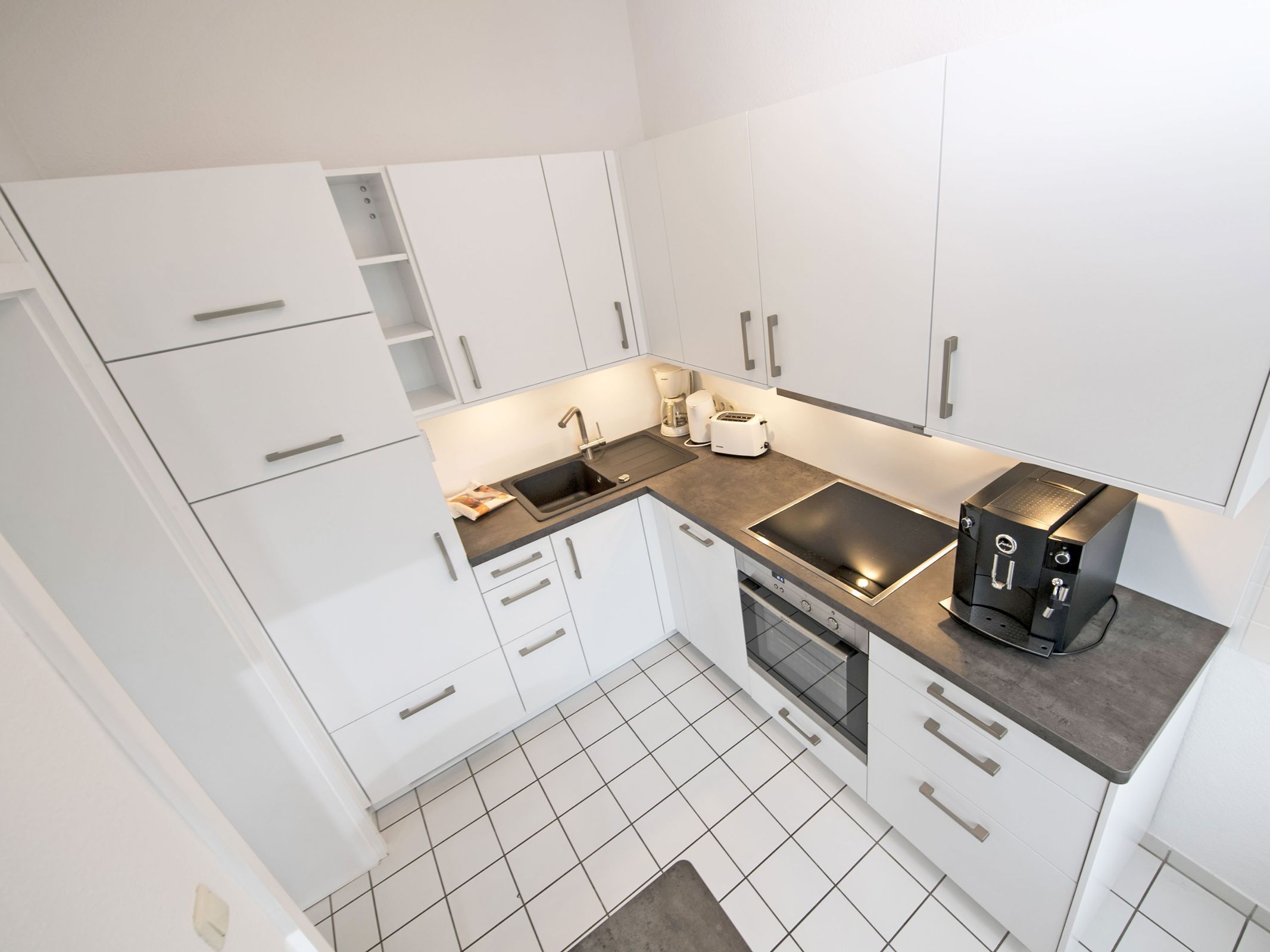Die räumlich abgetrennte Küche ist ausgestattet mit einem Kühlschrank mit Gefrierfach, einem 4-Platten-Cerankochfeld, einem Backofen, einer Geschirrspülmaschine, einer Mikrowelle, Wasserkocher, Toaster und diversem Kleininventar, das die Küchenausstattung komplettiert. Ferner können Sie täglich frischen Kaffee aus einem Jura-Kaffeevollautomaten (inkl. Kaffee satt) genießen.