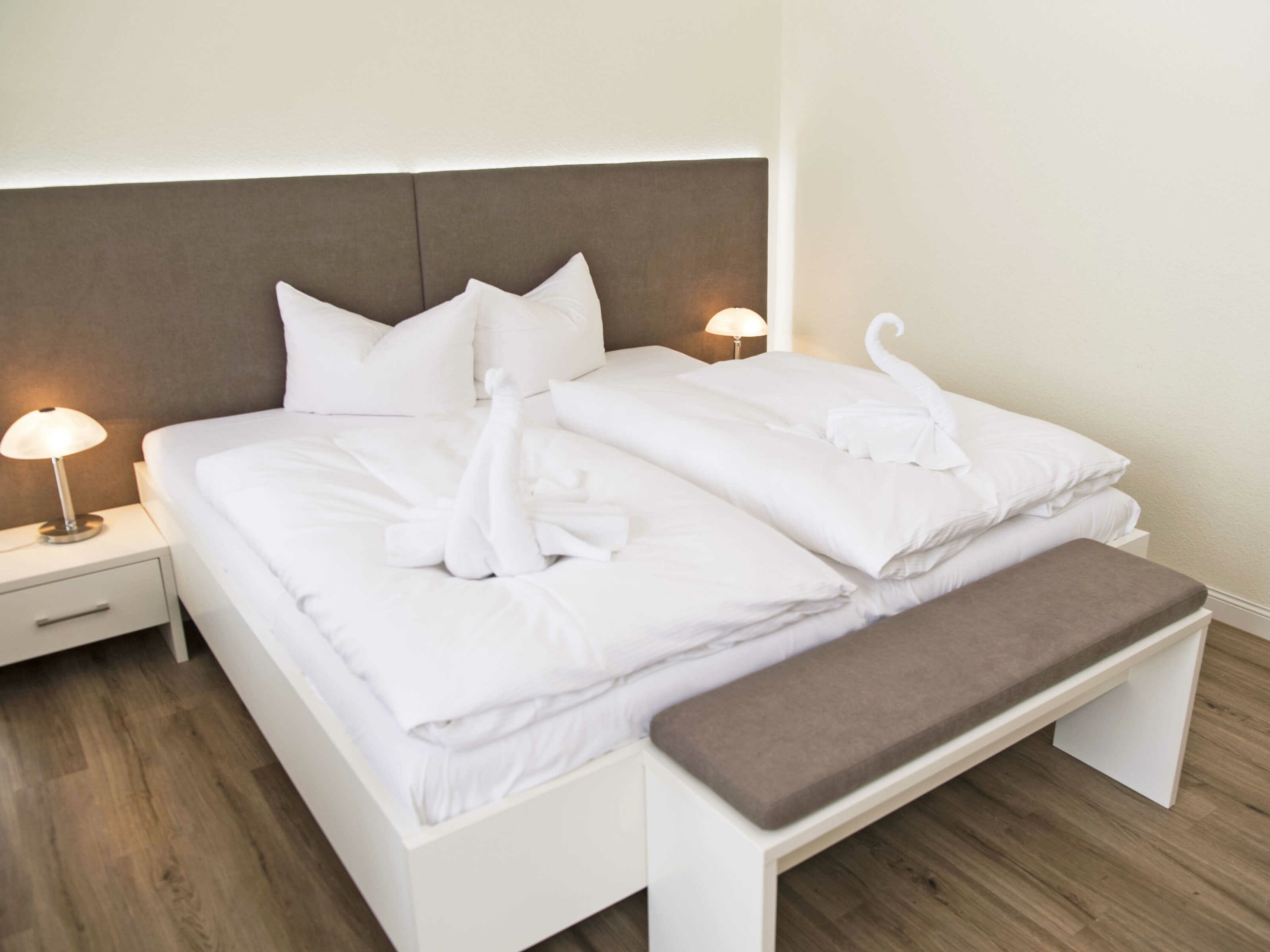 Über den Eingangsflur erreichen Sie das sehr großzügige Schlafzimmer, das mit einem Doppelbett und einem Kleiderschrank ausgestattet ist. Die hochwertigen Matratzen sorgen für einen erholsamen Schlaf. Der Raum bietet ausreichend Platz für die zusätzliche Unterbringung eines Kinderreisebettes. Ein weiterer Fernseher befindet sich ebenfalls hier.