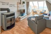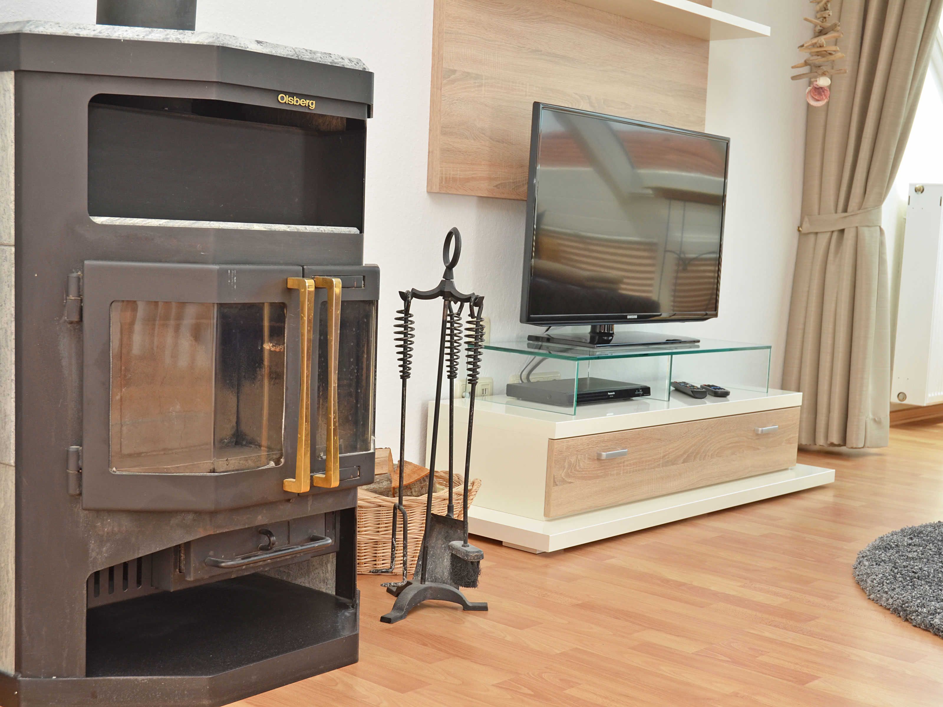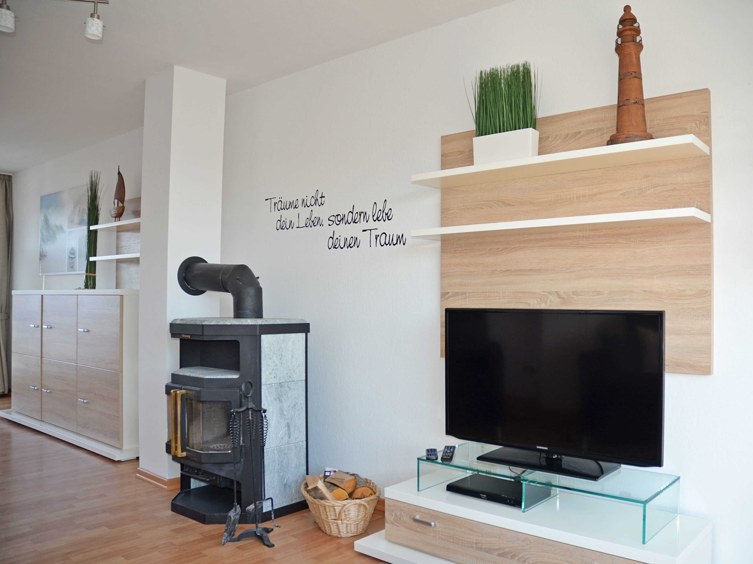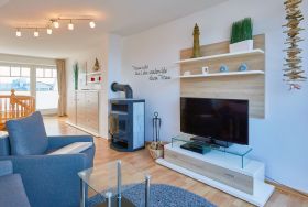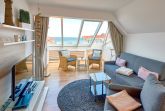 Den Wohnbereich in der oberen Etage des Appartements erreichen Sie über eine Wendeltreppe. Er ist mit einem Kamin, einer bequemen Couch mit Schlaffunktion für 2 Personen, einem Sessel sowie einem Flachbild-TV, Radio und kostenlosem W-LAN ausgestattet. Das besondere Highlight dieses Raumes ist die kleine Korbsitzecke unter der komplett verglasten Fensterfront mit dem direkten Ostseeblick. Und während Sie im Sommer dem Treiben auf der Promenade zusehen, können Sie im Winter am Kamin in behaglicher Wärme die Seele baumeln lassen ...